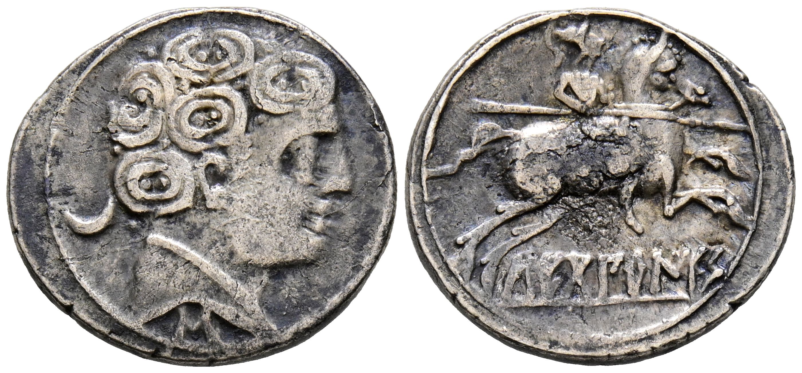 SECOBIRICES (Saelices, Cuenca). Denarius. (Ar. 3.09g/20mm). 120-30 Fine (FAB-2172). Anv: Male head to right, crescent and dot behind, below Iberian letter: S. Rev: Horseman with lance to right, one foot sticking out, below Iberian legend on line: SECoBiRICeS. VF.