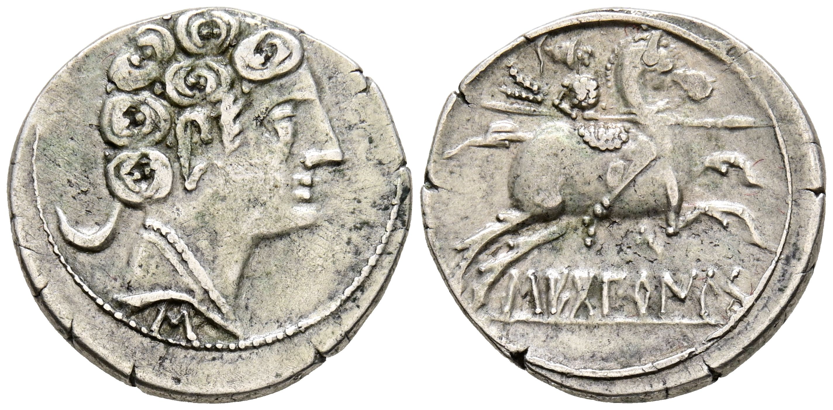 SECOBIRICES (Saelices, Cuenca). Denarius. (Ar. 3.79g/20mm). 120-30 Fine (FAB-2174). Anv: Male head to right, crescent behind, below Iberian letter: S. Rev: Horseman with lance to right, two feet sticking out. VF.