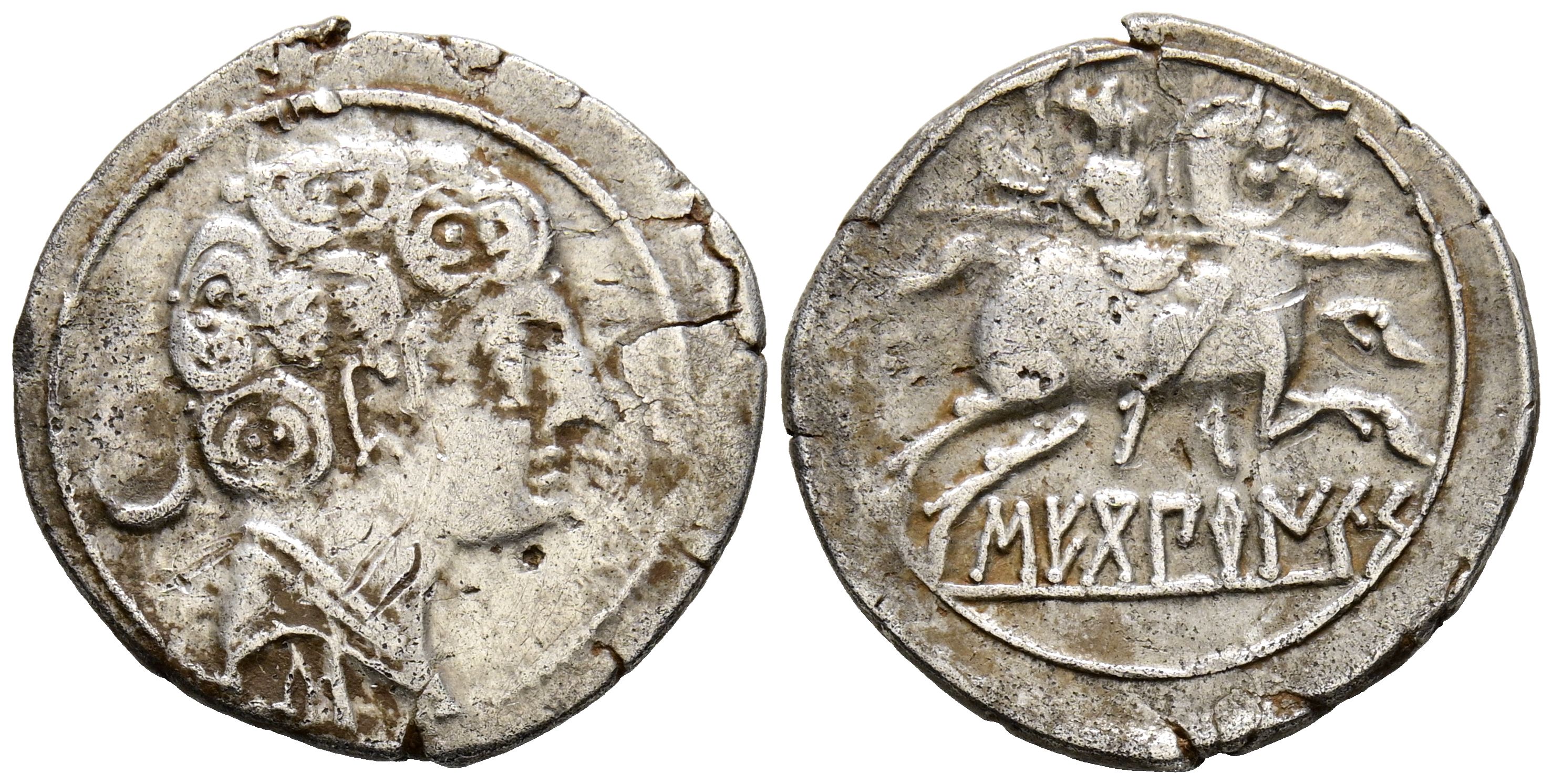 SECOBIRICES (Saelices, Cuenca). Denarius. (Ar. 3.27g/21mm). 120-30 Fine (FAB-2174). Anv: Male head to right, crescent behind, below Iberian letter: S. Rev: Horseman with lance to right, one foot sticking out. VF-.