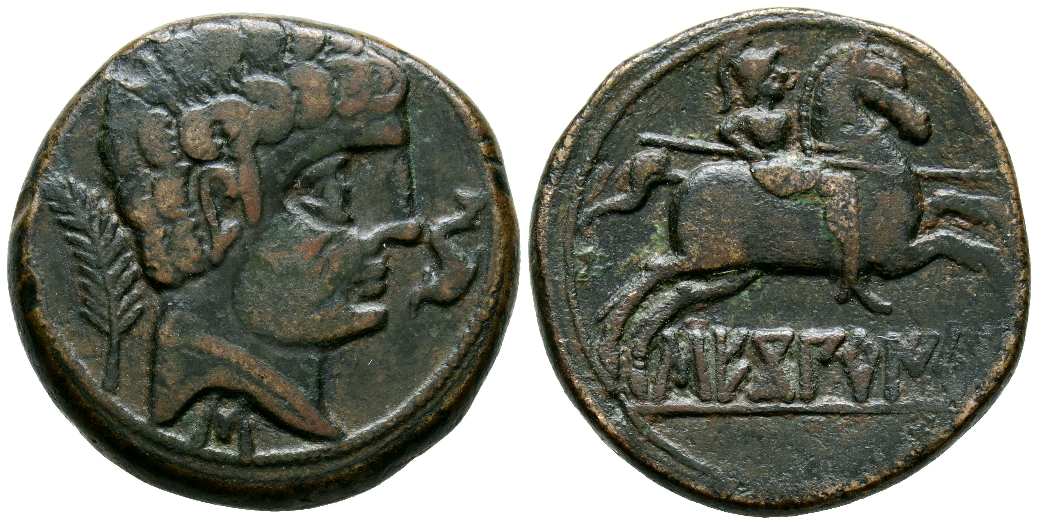 SECOBIRICES (Saelices, Cuenca). As. (Ae. 10.65g/25mm). 30-20 Fine (FAB-2176). Anv: Male's head to the right, behind the palm, in front a dolphin and below the Iberian letter S. Rev: Horseman with lance to the right, below the Iberian legend: SECoBiRICES. Very Fine.