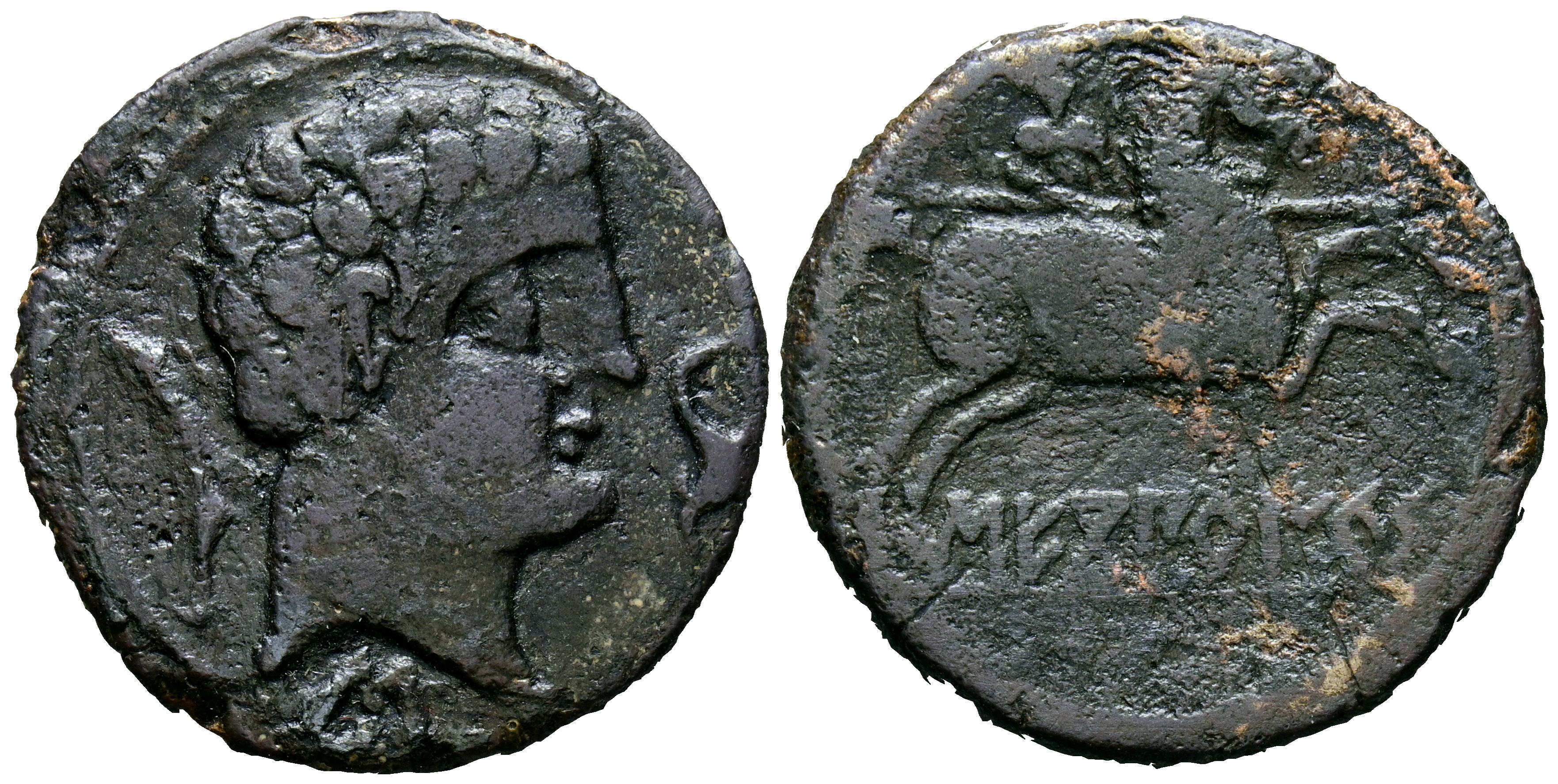 SECOBIRICES (Saelices, Cuenca). As. (Ae. 8.30g/25mm). 30-20 Fine (FAB-2176). Anv: Male's head to the right, behind the palm, in front a dolphin and below the Iberian letter S. Rev: Horseman with lance to the right, below the Iberian legend: SECoBiRICES. Very Fine-.
