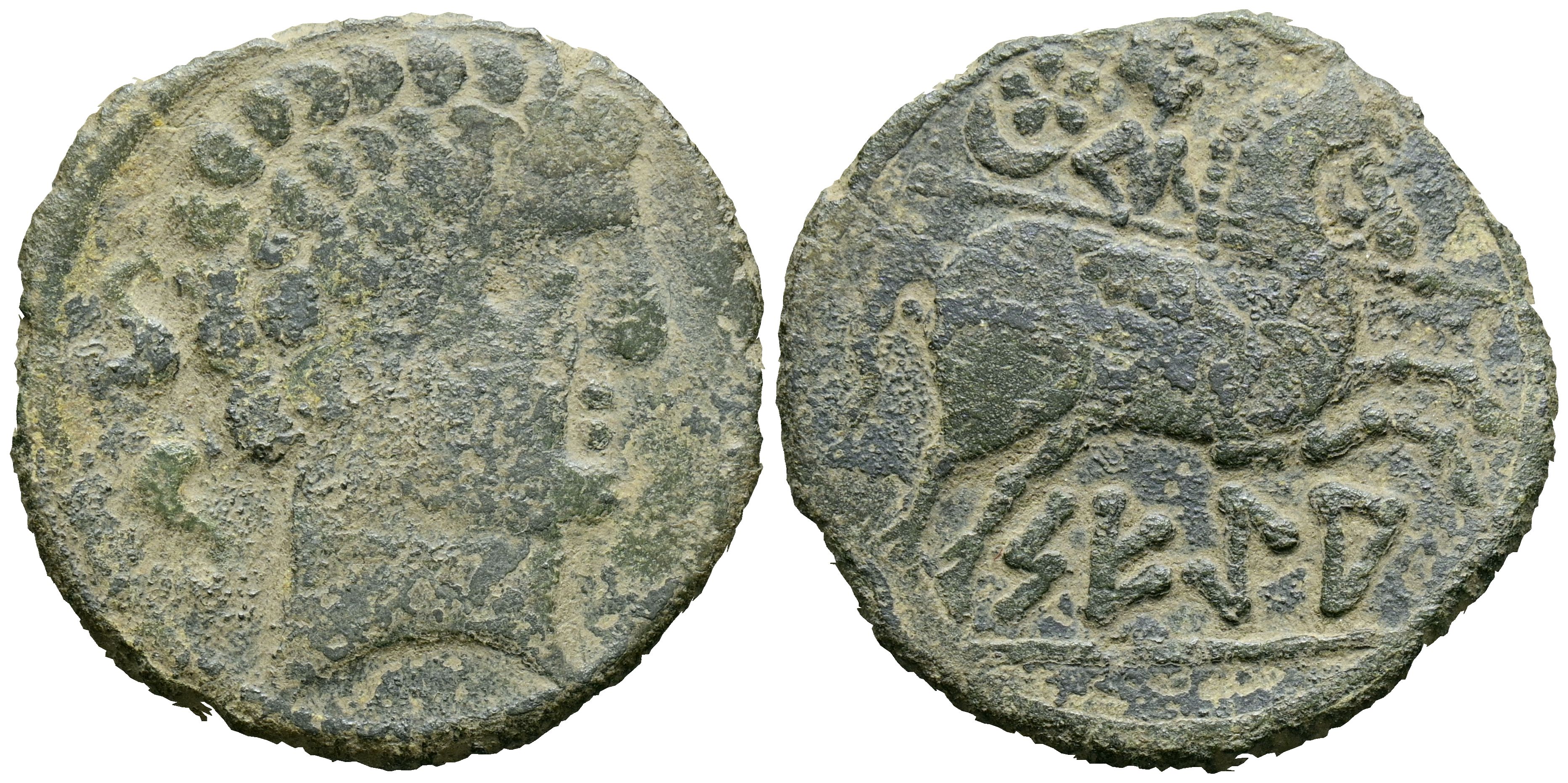 SEGIA (Ejea de los Caballeros, Zaragoza). As. (Ae. 7.84g/26mm). 120-20 Fine (FAB-2157). Obverse: Bearded male head to the right, behind two dolphins. Reverse: Horseman with lance to the right, above crescent with star, below Iberian legend: SEGiA. VF-.