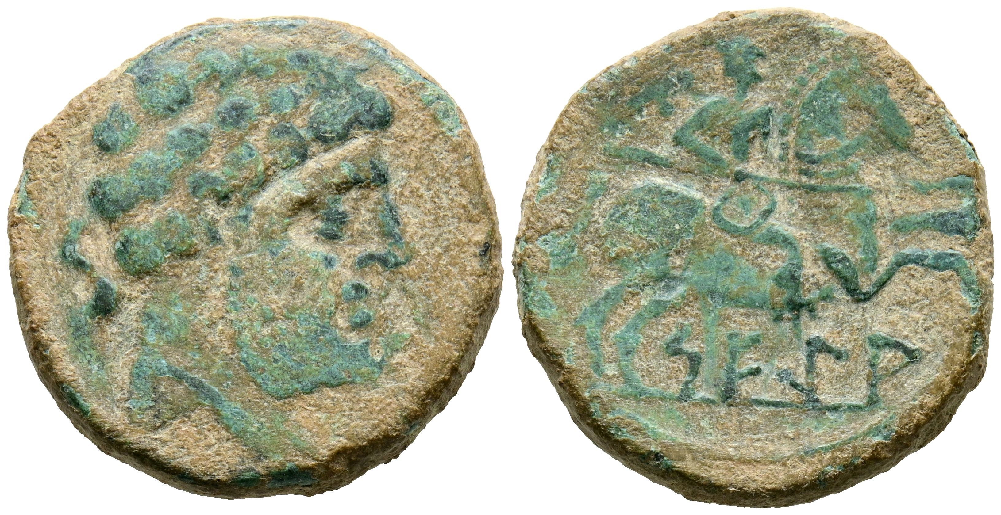 SEGIA (Ejea de los Caballeros, Zaragoza). As. (Ae. 8.65g/23mm). 120-20 Fine (FAB-2157). Obverse: Bearded male head to the right, behind two dolphins. Reverse: Horseman with lance to the right, above crescent with star, below Iberian legend: SEGiA. VF-.