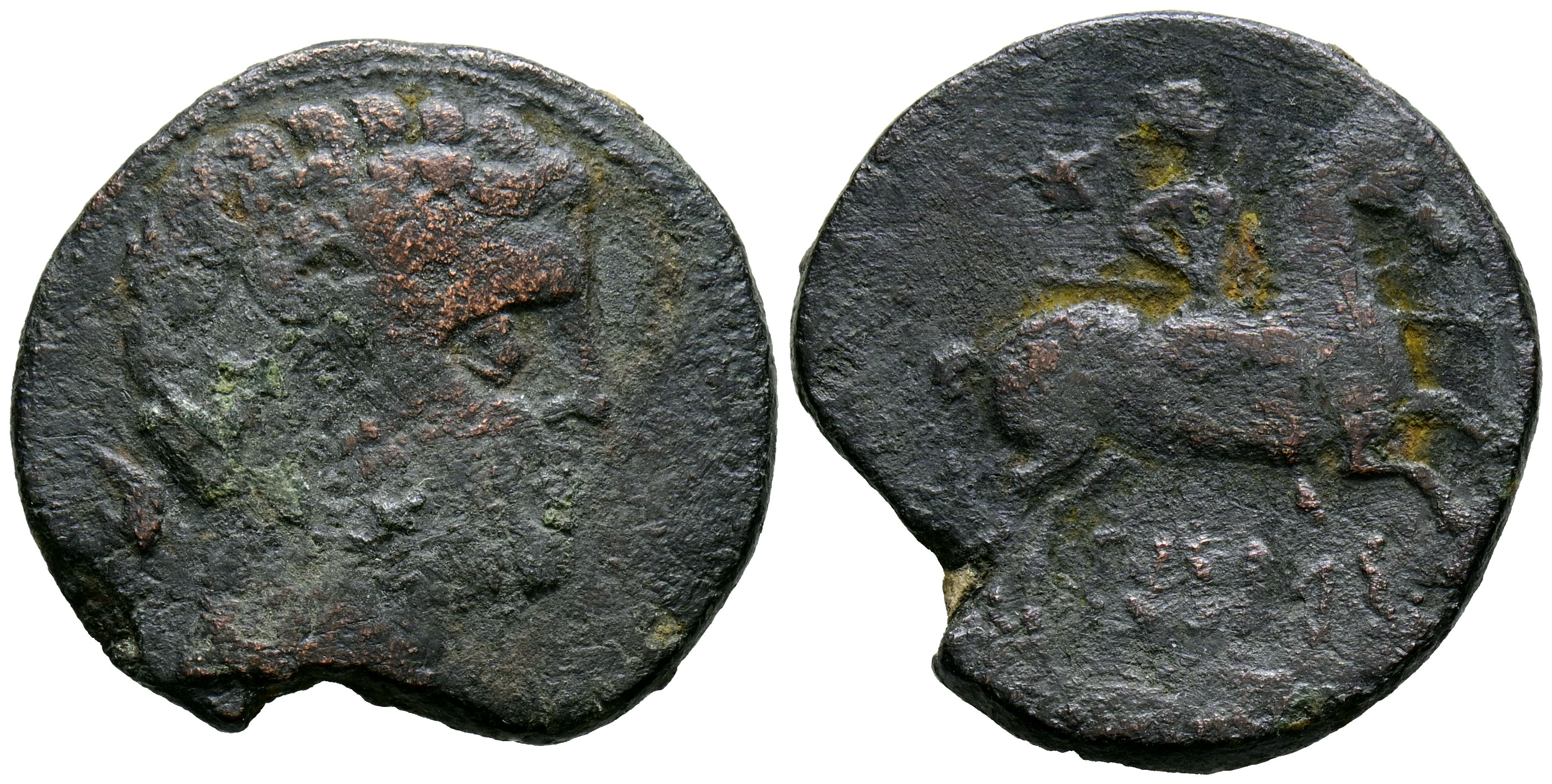 English SESARS (Aragon area). As. (Ae. 8.71g/26mm). 120-20 Fine (FAB-2199). Anv: Bearded male head right, behind dolphin. Rev: Horseman with lance right, above star, below Iberian legend: SESARS. Fine-.