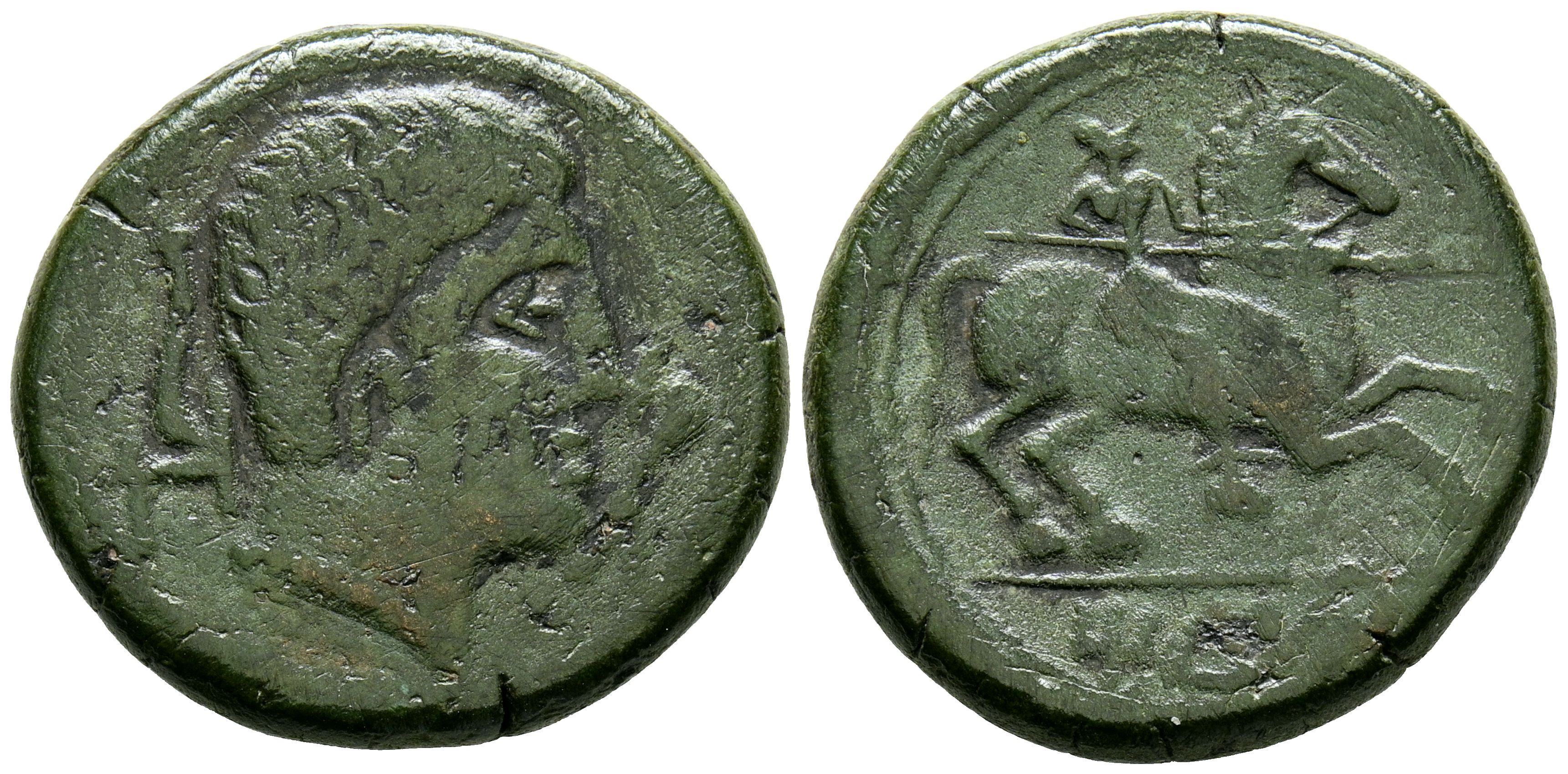 English TIDUM (Aragon area). As. (Ae. 9.64g/24mm). 120-20 Fine (FAB-2388). Anv: Male head to right, dolphin in front, plough behind. Rev: Horseman with lance to right, below Iberian legend below line: TiDuM. Very Fine-.