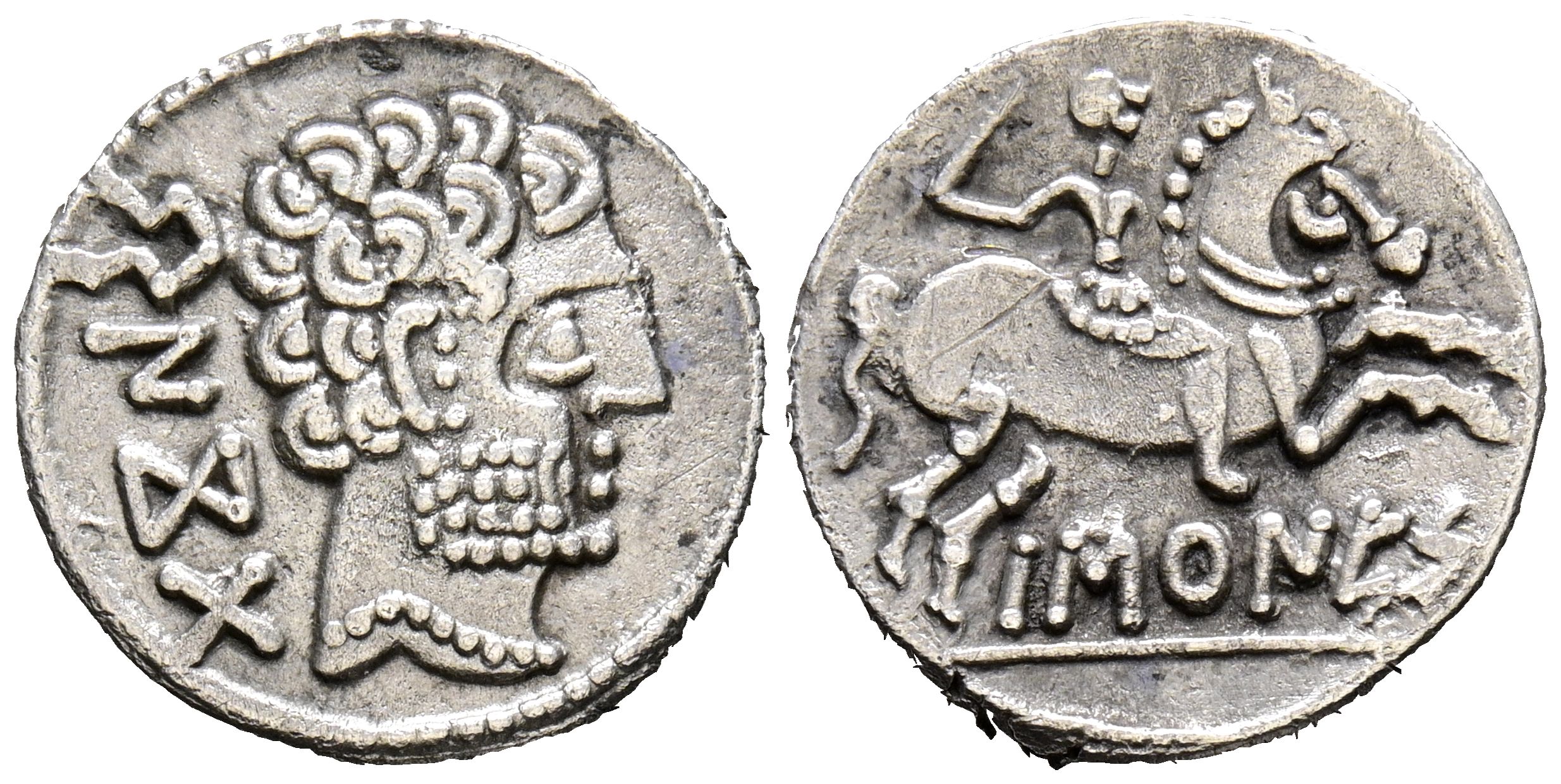 BASCUNES (Pamplona). Denarius. (Ar. 3.85g/17mm). 120-20 Fine (FAB-215). Obv: Bearded male head right, behind Iberian legend BeNCoDa. Reverse: Horseman with sword right, below Iberian legend BaSCuNES. VF+/VF.