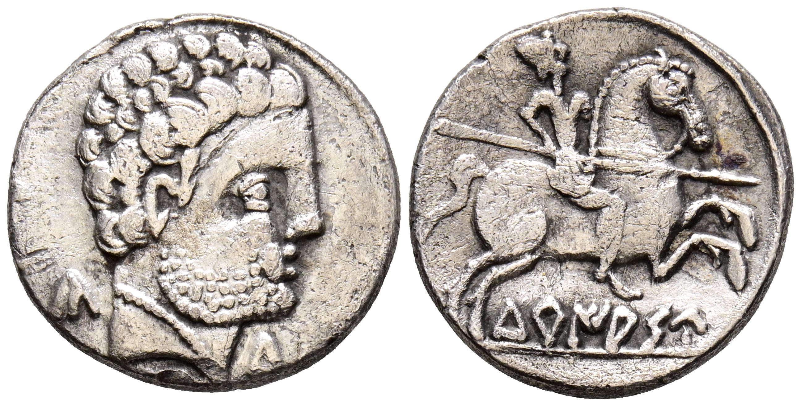 TURIASO (Tarazona, Zaragoza). Denarius. (Ar. 3.40g/18mm). 120-20 Fine (FAB-2412). Anv: Bearded male head to right, behind letter: CA, below: S and in front: Du. Rev: Horseman with lance to right, below Iberian legend above line: TuRIASU. Very Fine-.