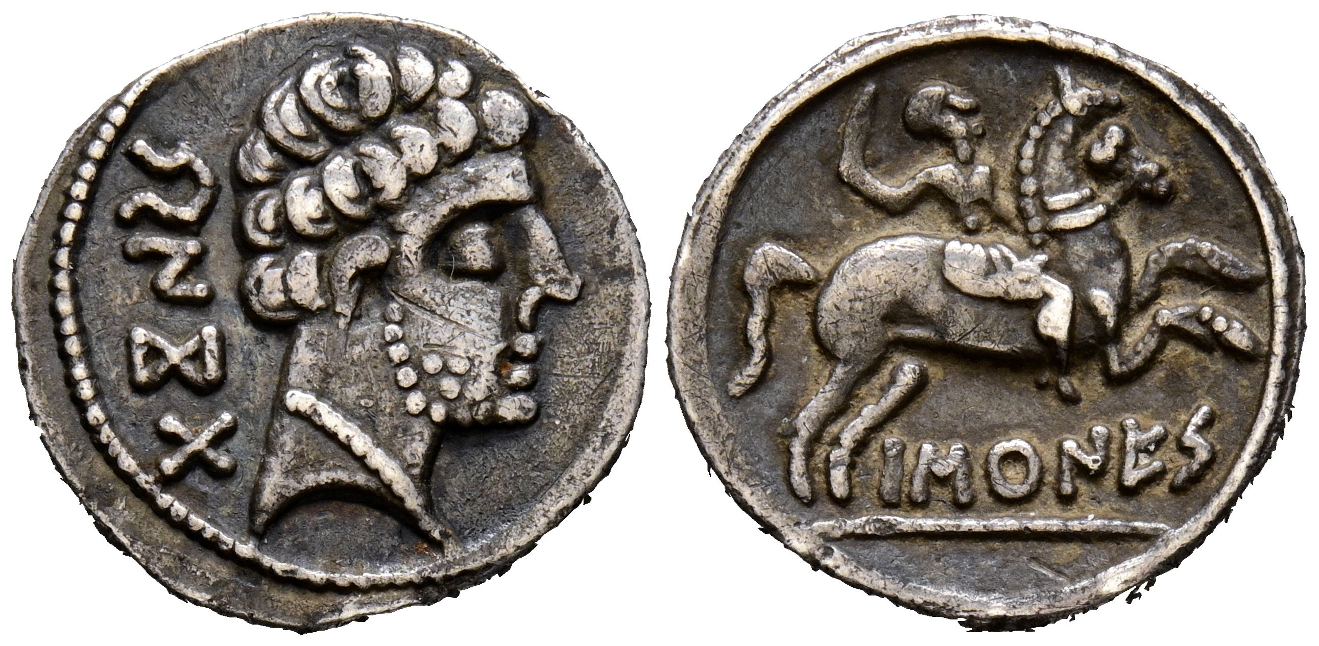 BASCUNES (Pamplona). Denarius. (Ar. 4.04g/18mm). 120-20 Fine (FAB-215). Obv: Bearded male head to right, behind Iberian legend BeNCoDa. Reverse: Horseman with sword to right, below Iberian legend BaSCuNES. VF+. Lines on obverse. Ex Rodrigo Angulo collection.