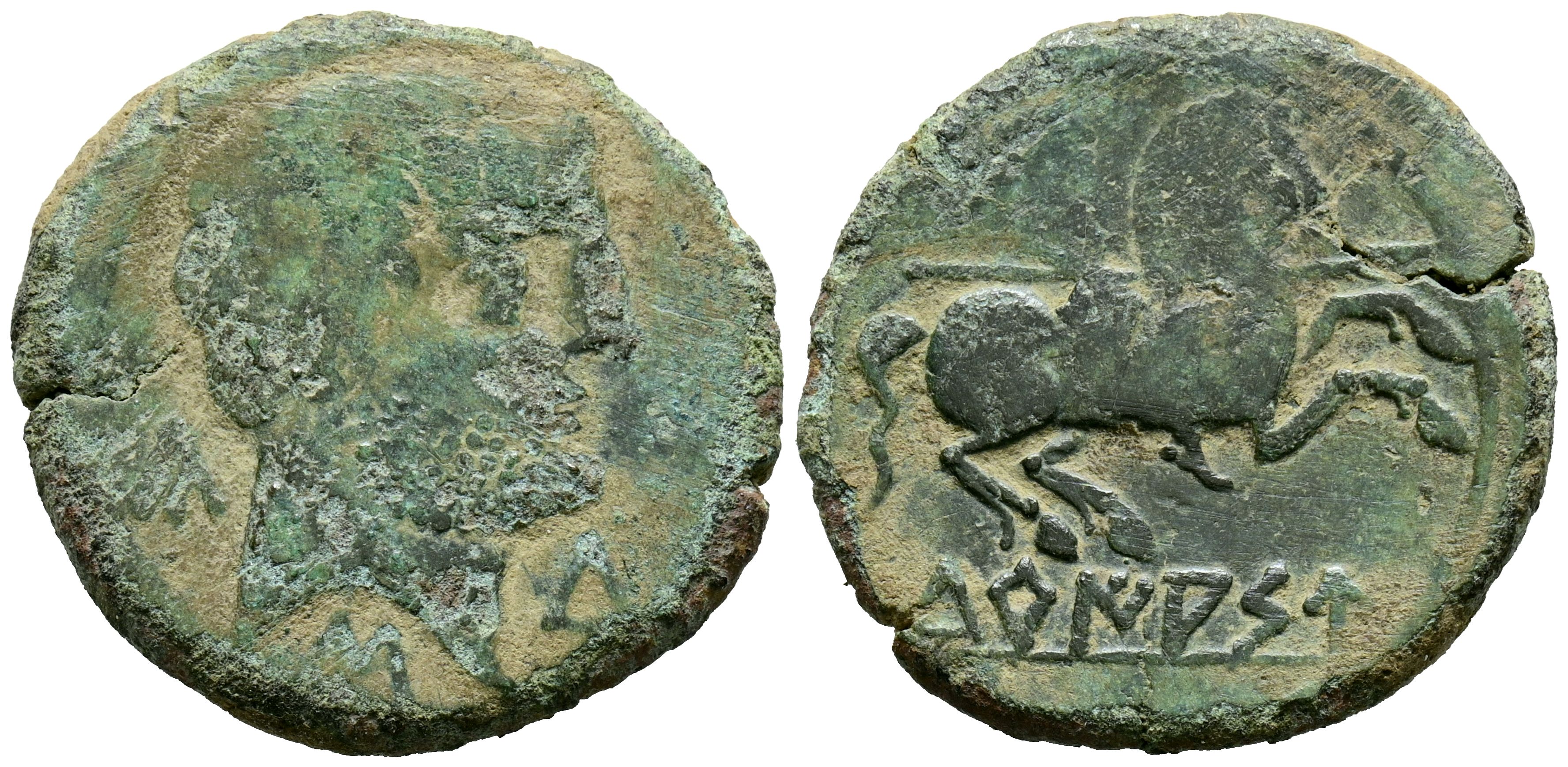 TURIASO (Tarazona, Zaragoza). As. (Ae. 6.44g/25mm). 120-20 Fine (FAB-2428). Anv: Bearded male head right, around three dolphins. Rev: Horseman with lance right, below Iberian legend: TuRIASU. Good Fine/VF-.
