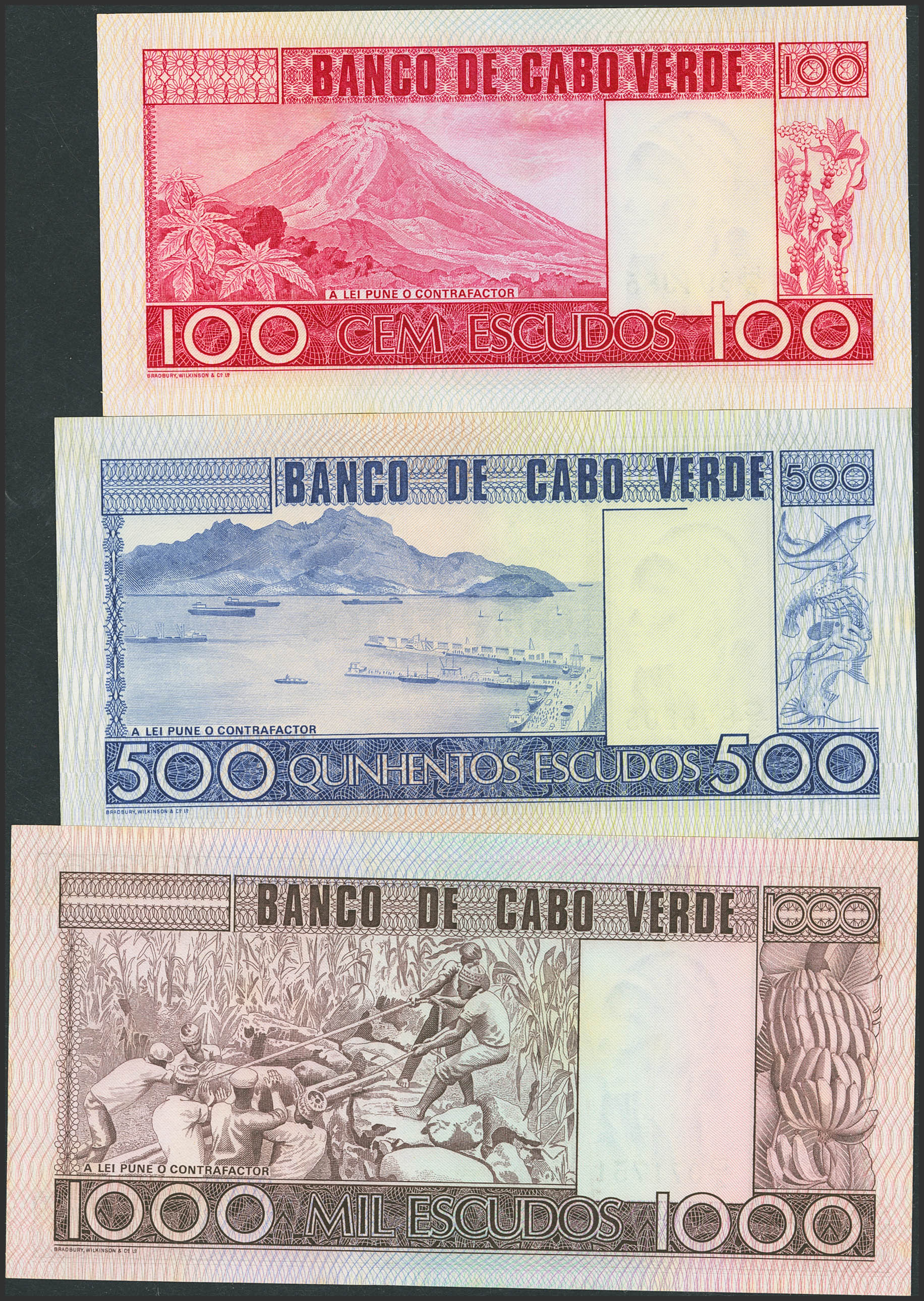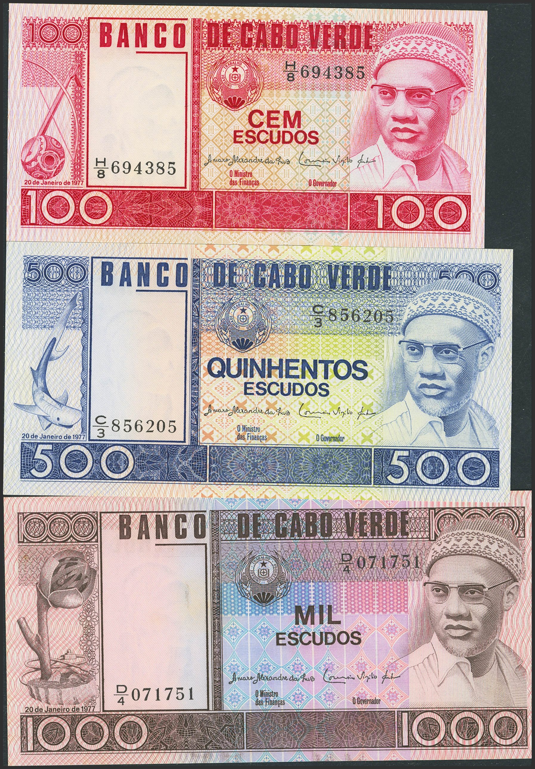 Set of 3 banknotes of Cape Verde of 100 Escudos, 500 Escudos and 1000 Escudos. January 20, 1977. (Pick: 54, 55, 56). Uncirculated.