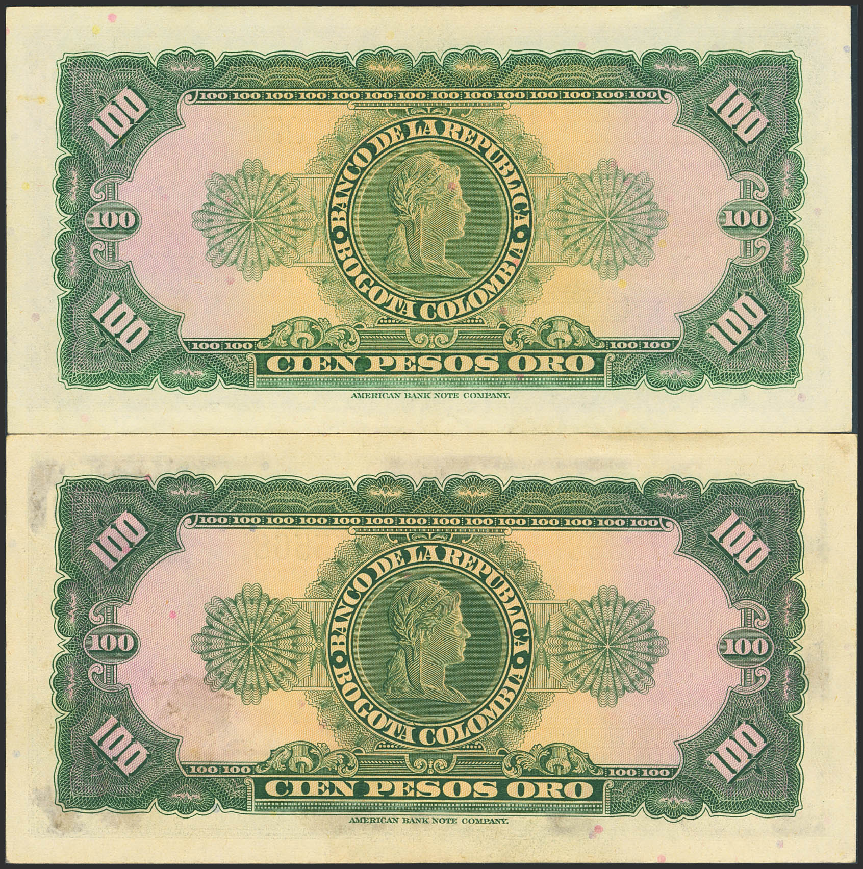 Set of 2 banknotes of Colombia of 100 Pesos. 1 January 1960 and 1 January 1967. (Pick: 403b, 403c). Extremely Fine.