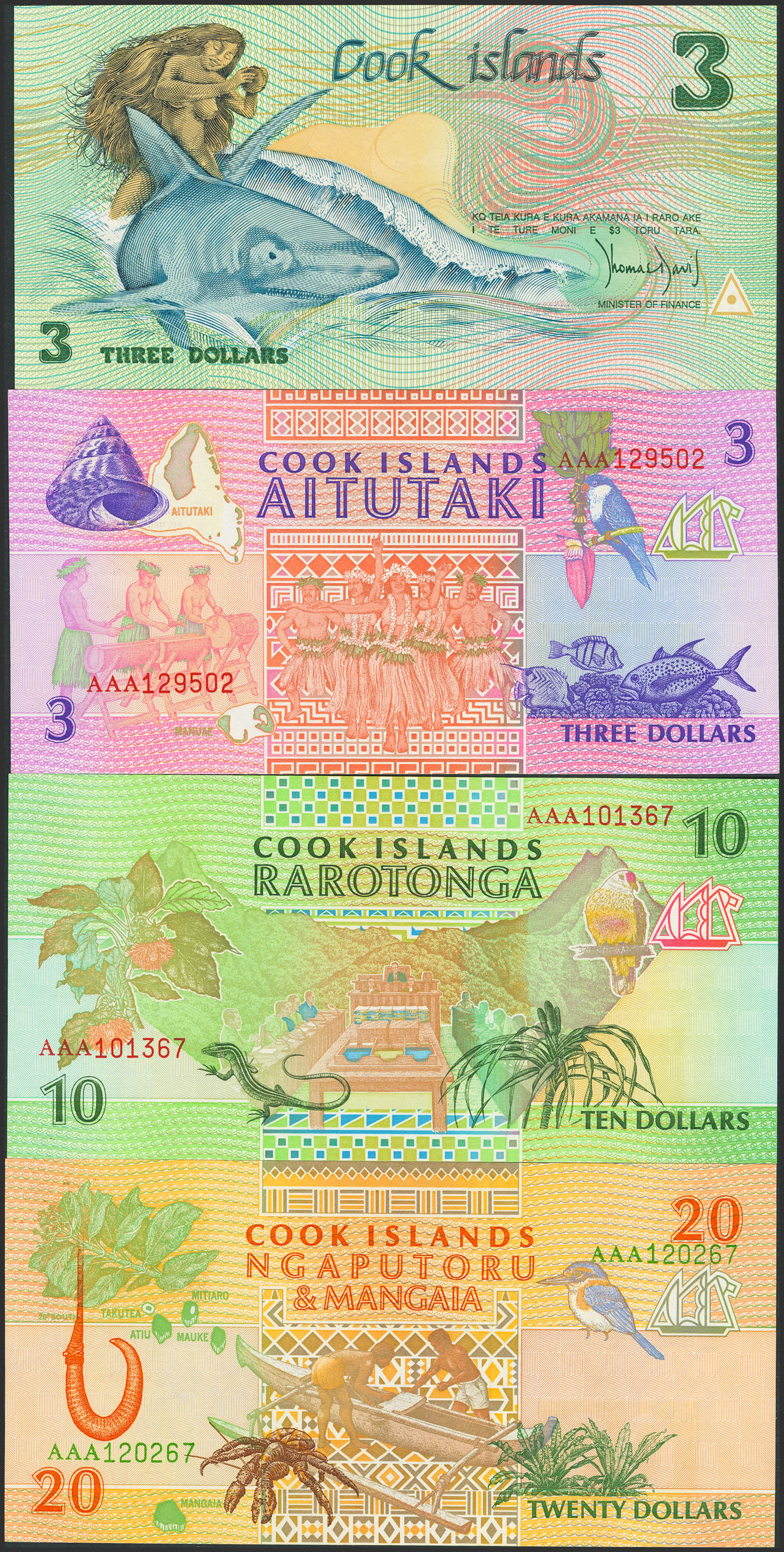 Set of 4 banknotes of Cook Islands of 3 Dollars (2), 10 Dollars and 20 Dollars. (1992ca). (Pick: 3, 7, 8, 9). Uncirculated.