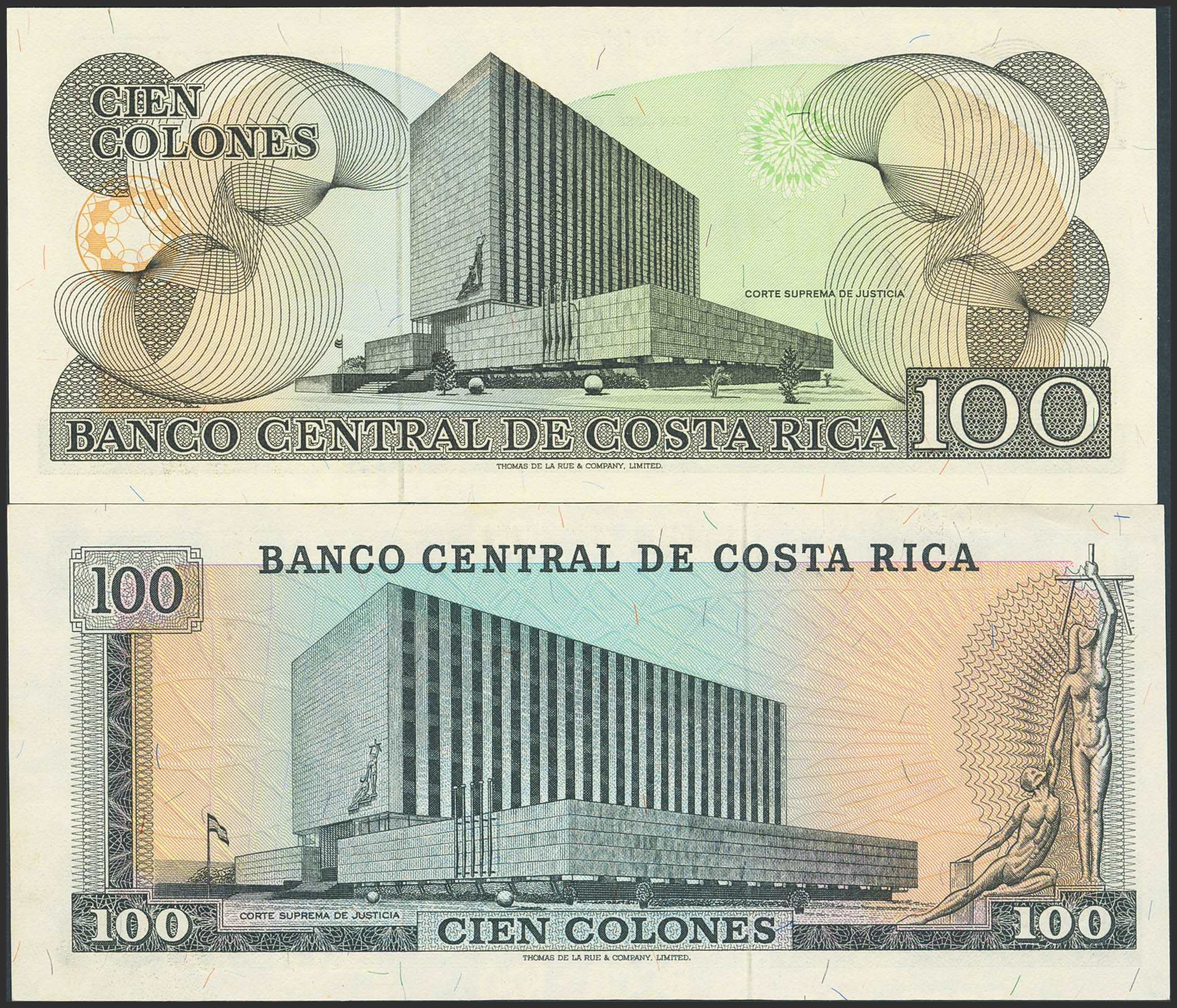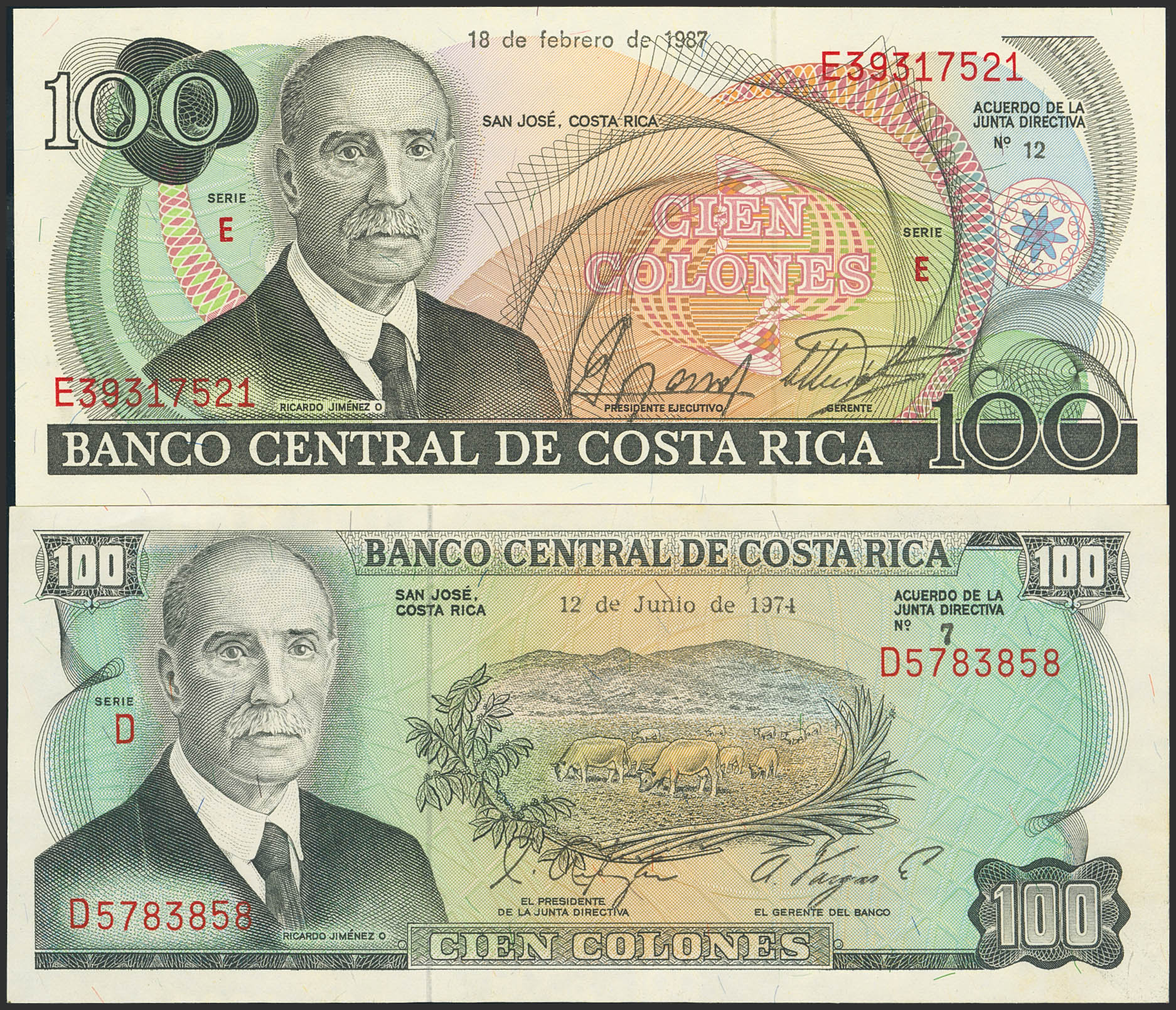 Set of 2 banknotes of Costa Rica of 100 Colones. 12 June 1974 and 18 February 1987. (Pick: 240, 248b). Uncirculated / Less than Uncirculated.