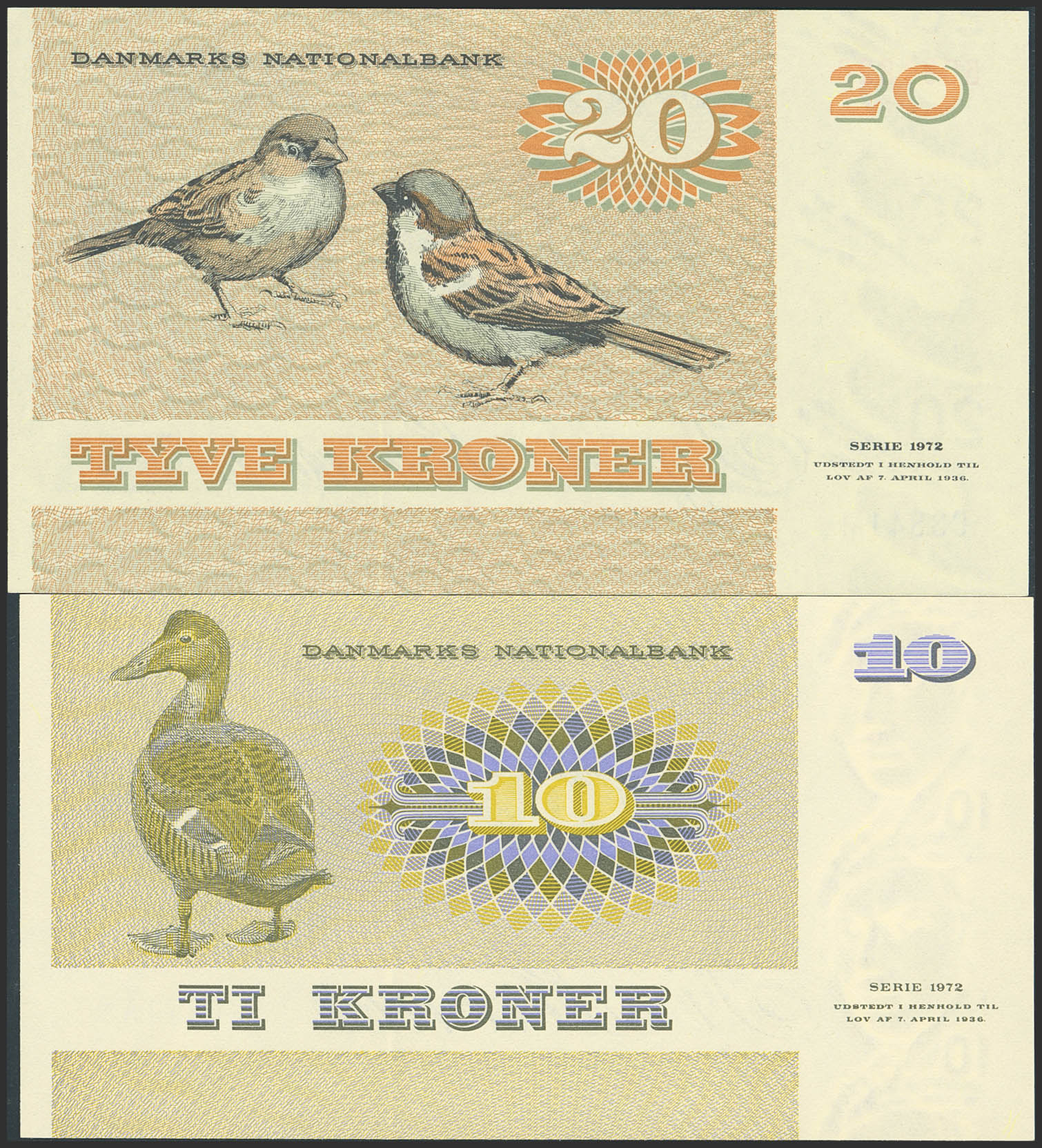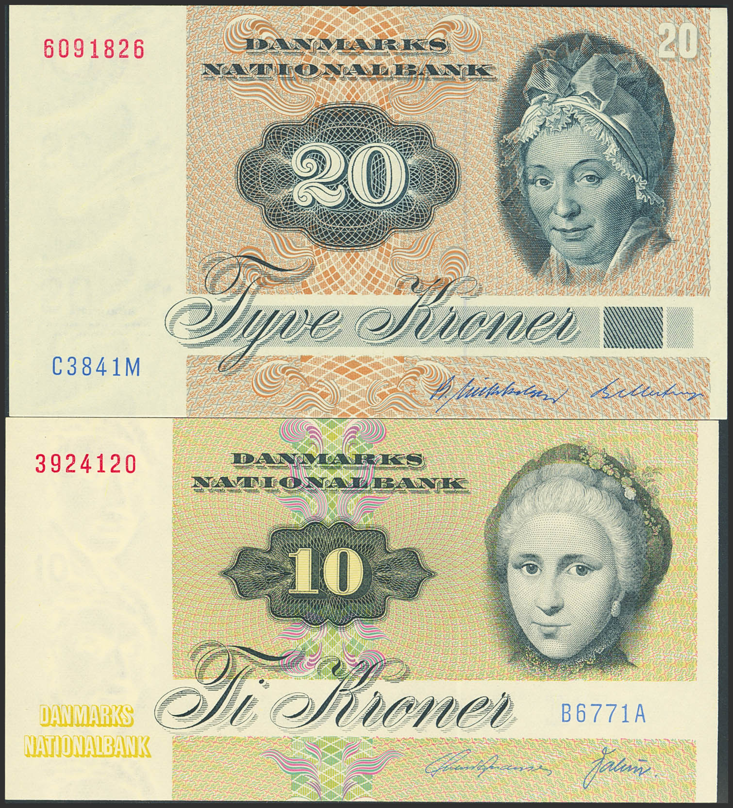 Set of 2 banknotes of Denmark of 10 Kronen and 20 Kronen. (1977ca). (Pick: 48, 19). Uncirculated.