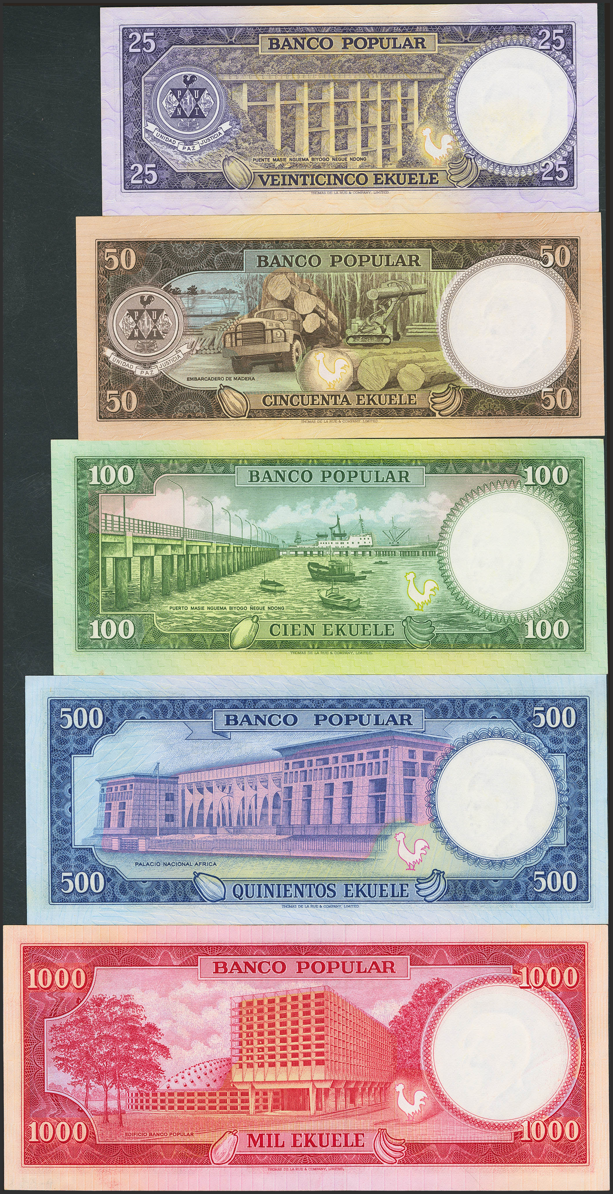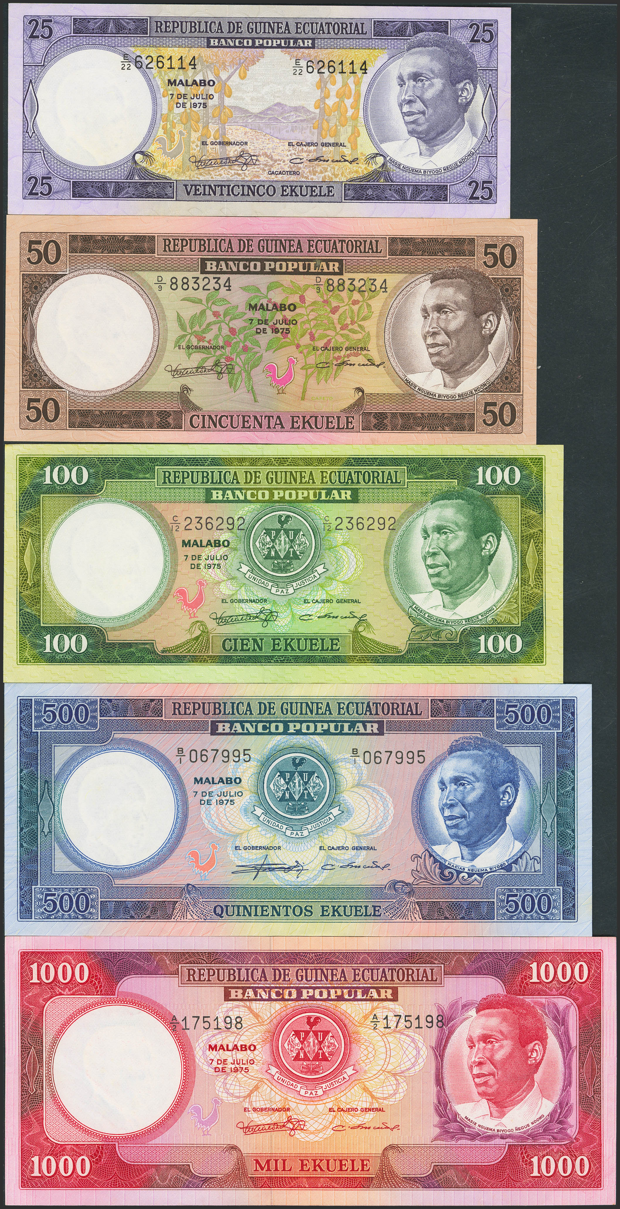 Set of 5 banknotes of Equatorial Guinea of 25 Ekuele, 50 Ekuele, 100 Ekuele, 500 Ekuele and 1000 Ekuele. 7 July 1975. (Pick: 7, 9, 10, 11, 13). Uncirculated / Extremely Fine.