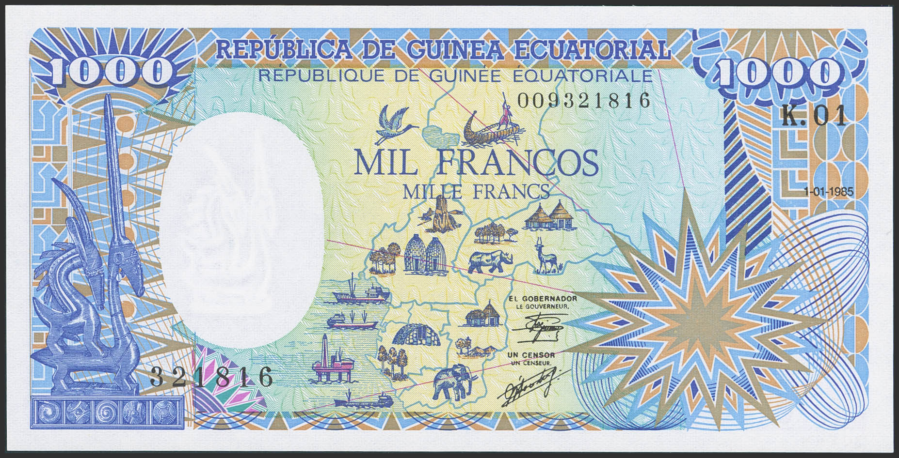 EQUATORIAL GUINEA. 1000 Francs. January 1, 1985. (Pick: 21). Less than Uncirculated.