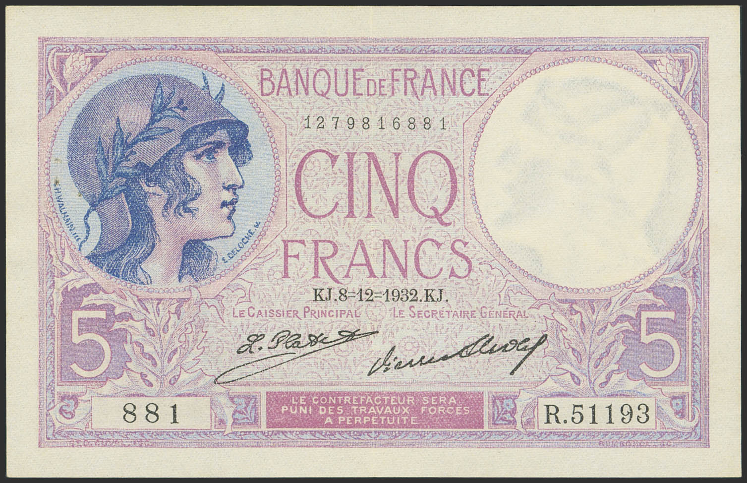 FRANCE. 5 French. December 8, 1932. (Pick: 72). Extremely Fine.