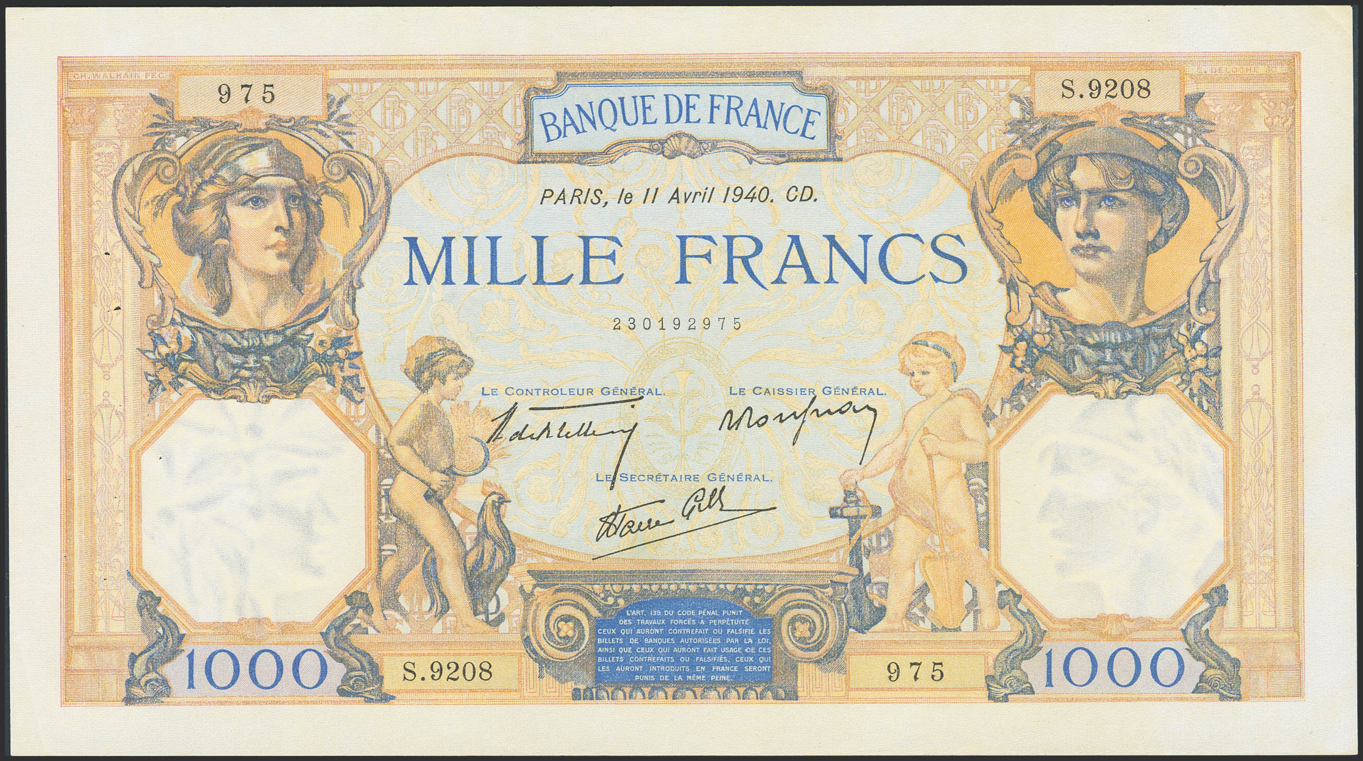 FRANCE. 1000 Francs. April 11, 1940. (Pick: 90). Needle points. More than Very Fine.
