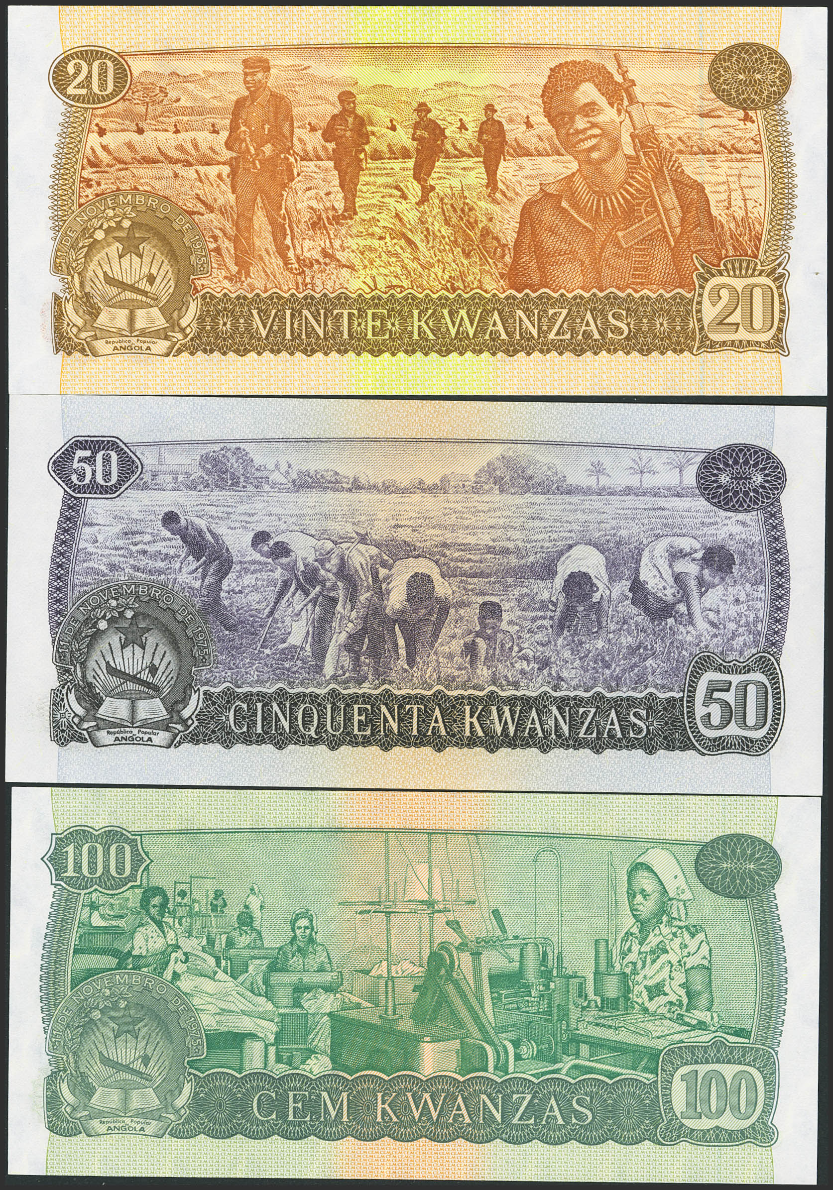 Set of 3 banknotes of Angola of 20 Kwanzas, 50 Kwanzas and 100 Kwanzas. (1976ca). (Pick: 109, 111, 114). Uncirculated.