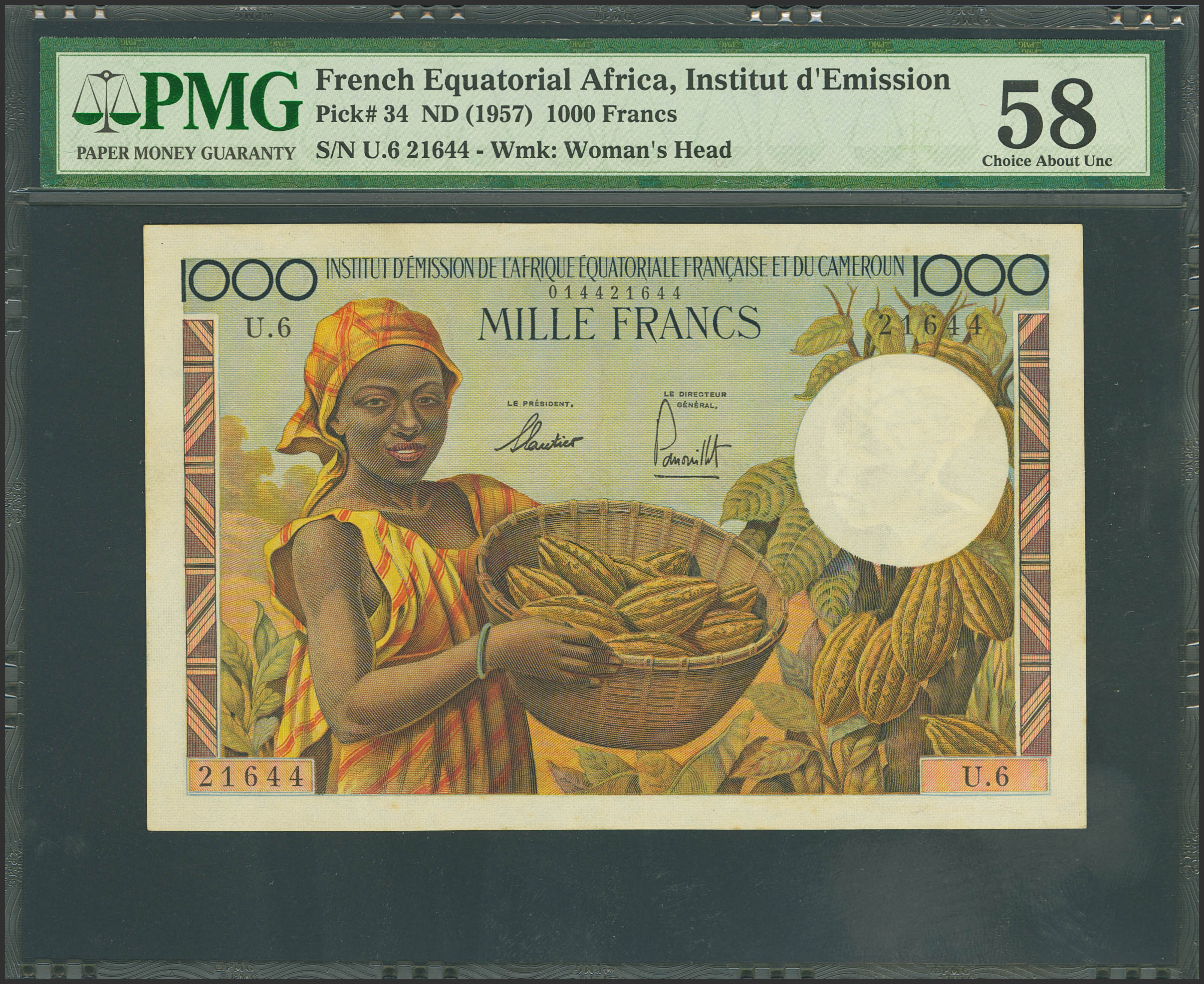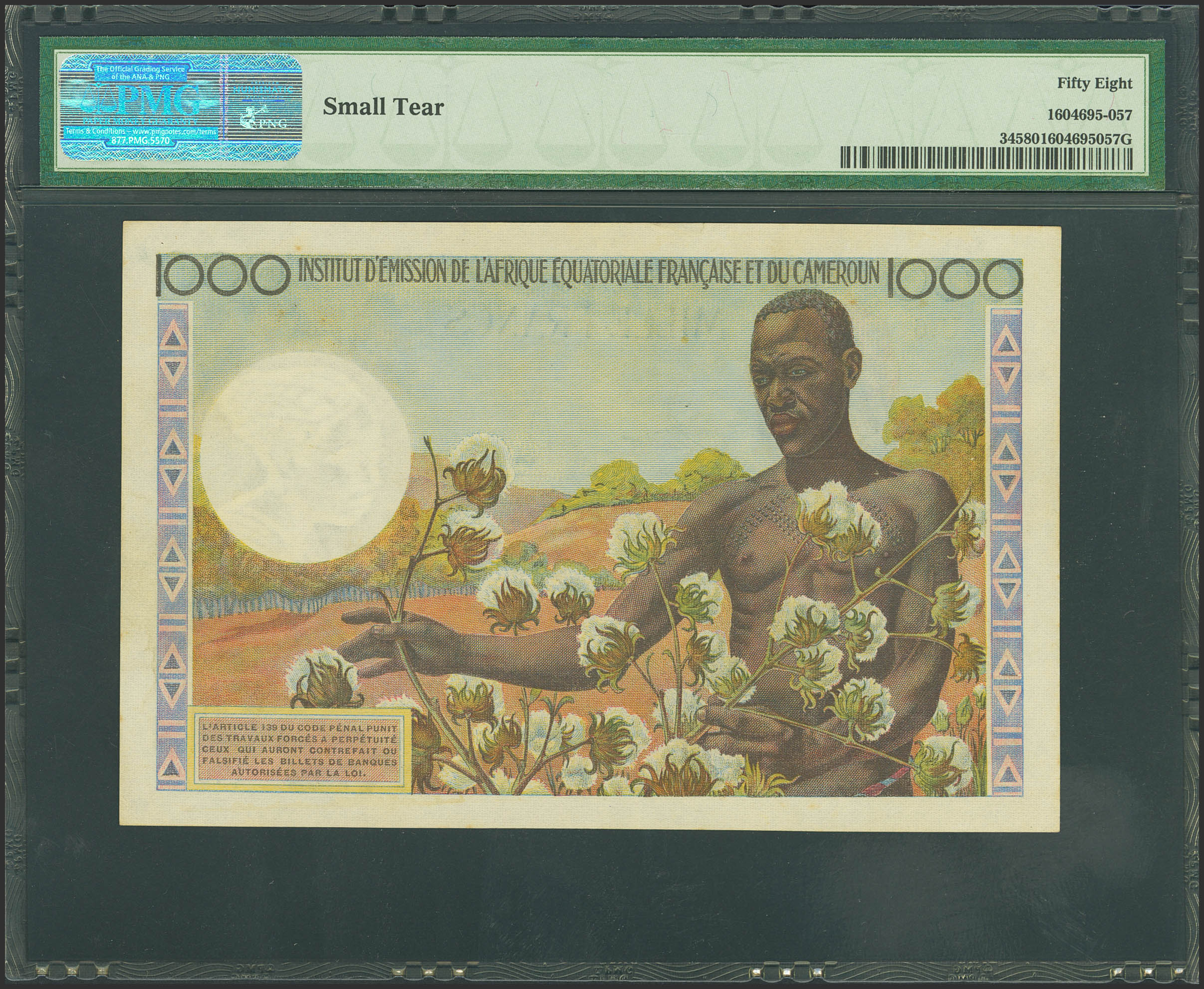 FRENCH EQUATORIAL AFRICA. 1000 Francs. (1957ca). (Pick: 34). Extremely rare, especially in this exceptional quality. PMG58 (small tear).