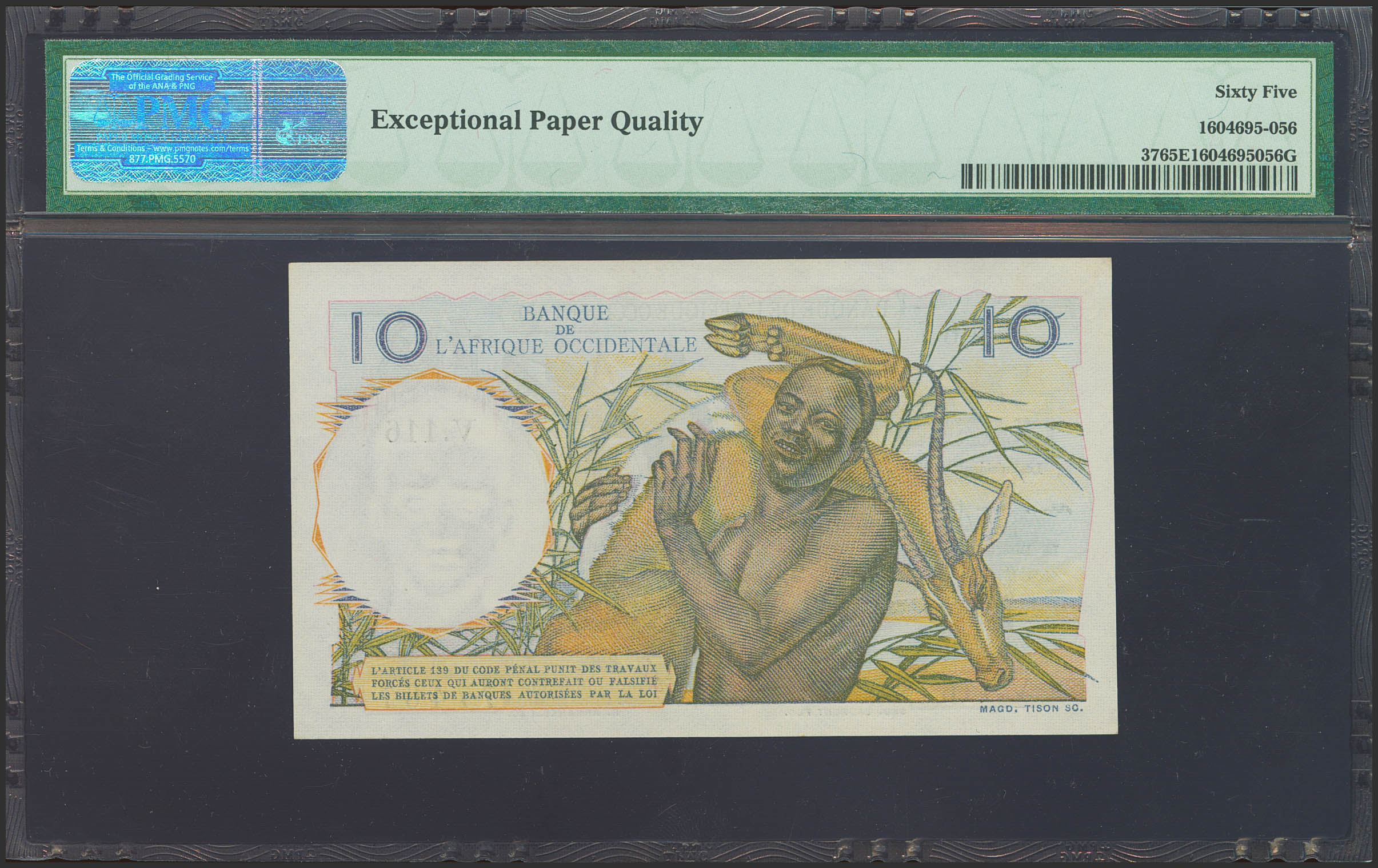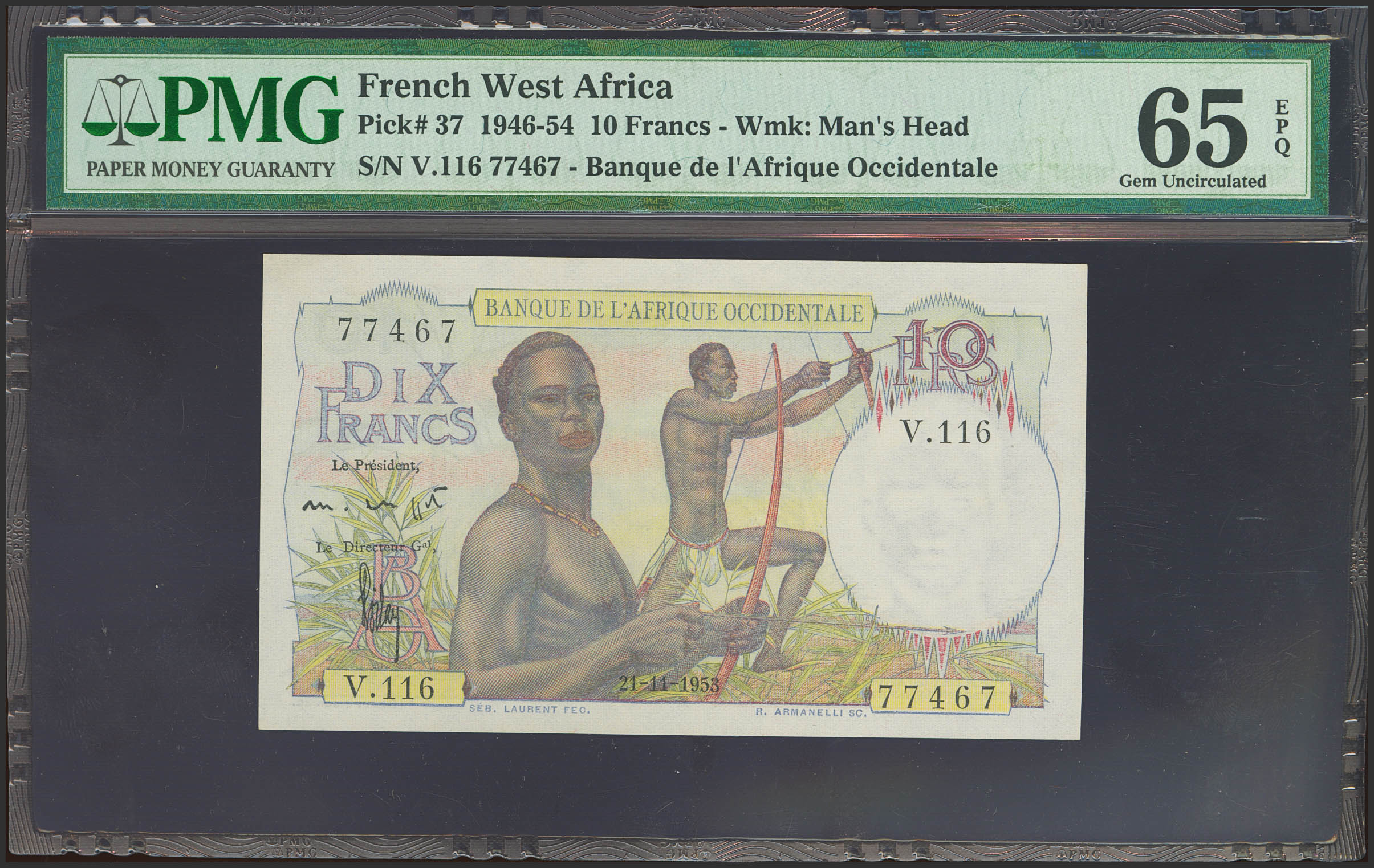 FRENCH WEST AFRICA. 10 French. November 21, 1953. (Pick: 37). Rare in this quality. PMG65EPQ.