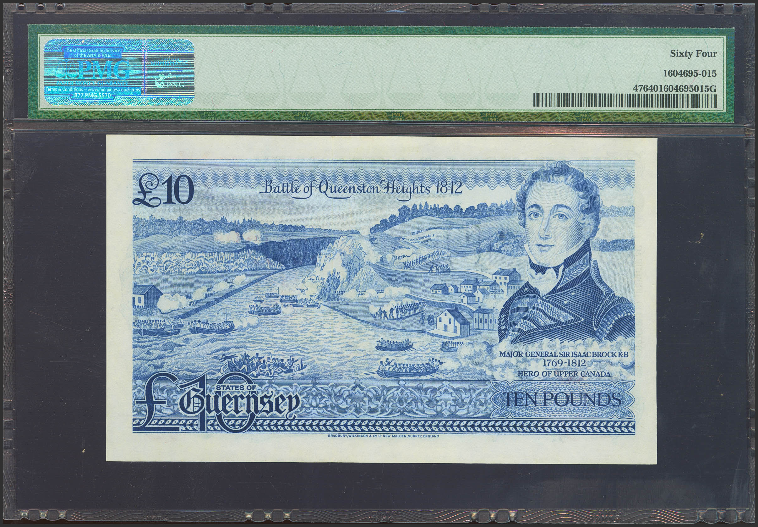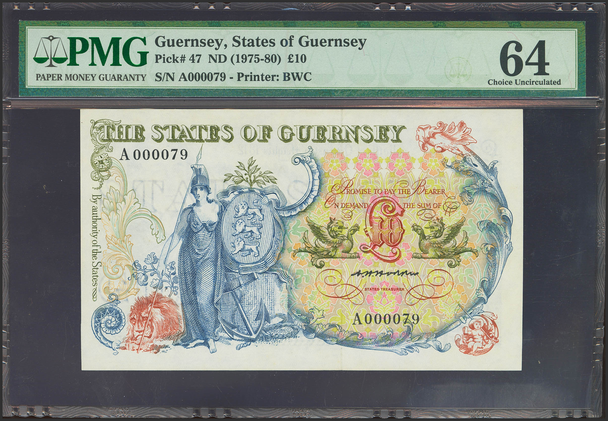 GUERNSEY. 10 Pounds. (1975ca). Very low numbering. (Pick 47). Extremely rare. PMG64.