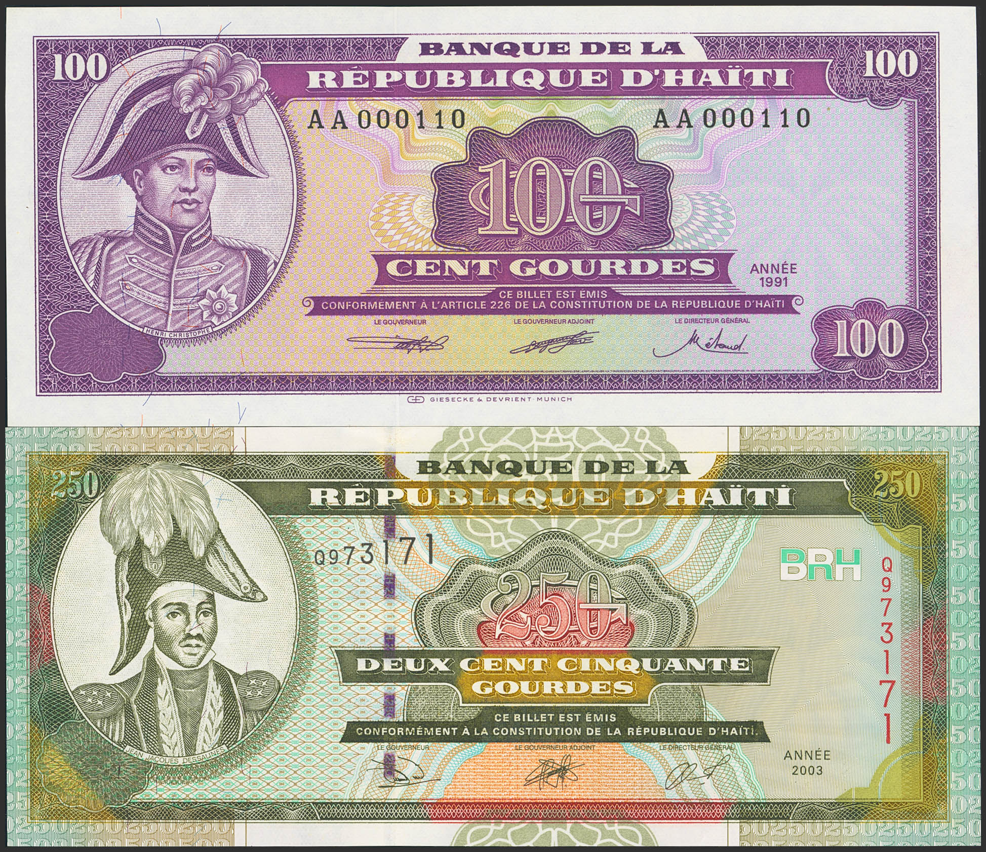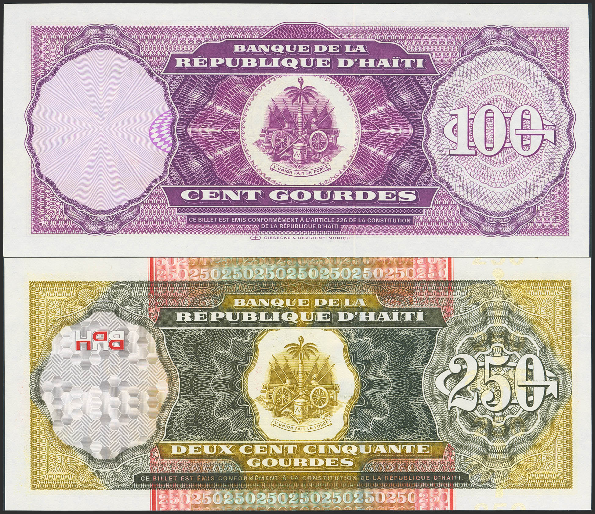 HAITI. 100 Gourdes and 250 Gourdes. (1991ca). (Pick: 258, 269). Uncirculated.