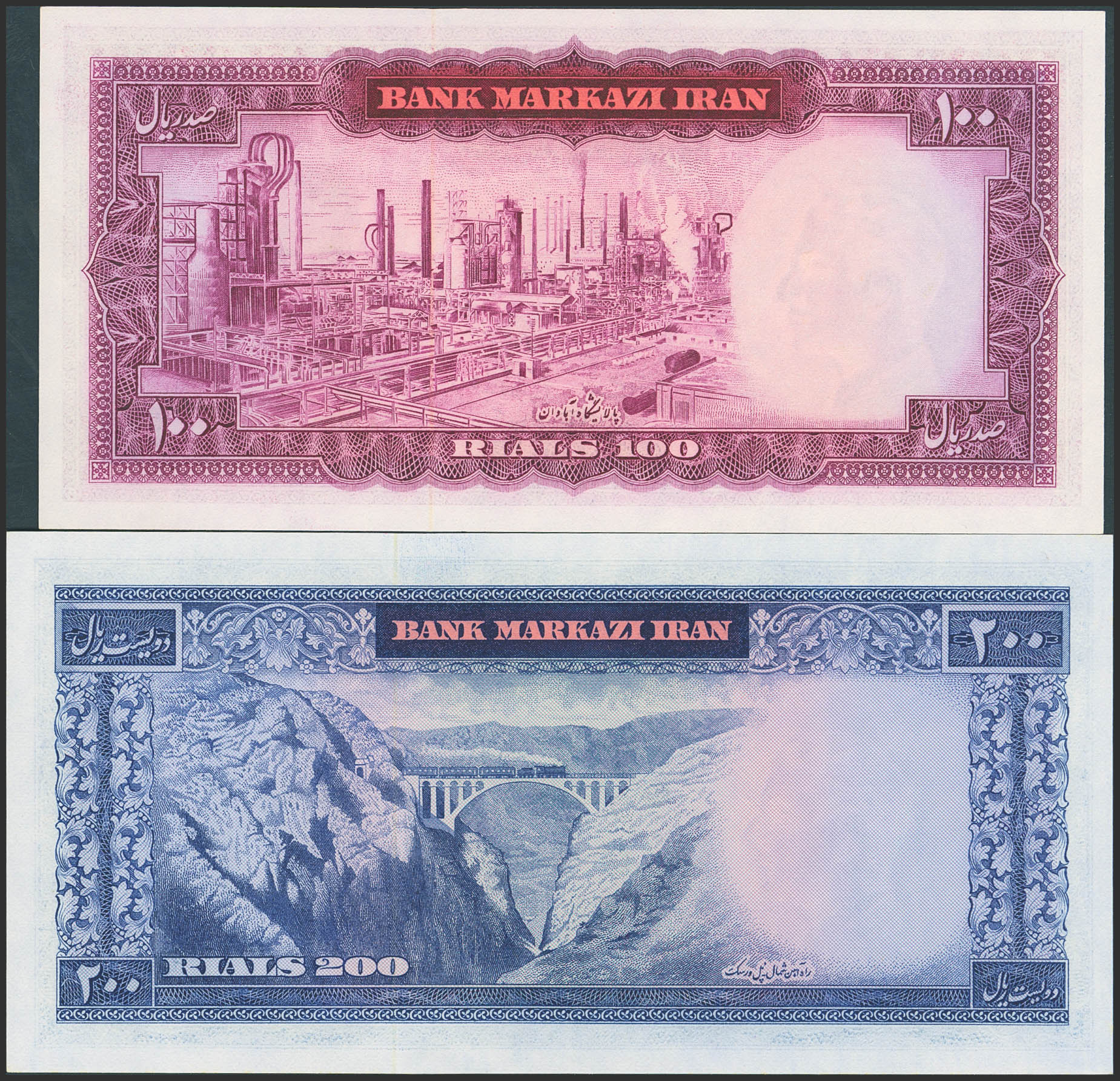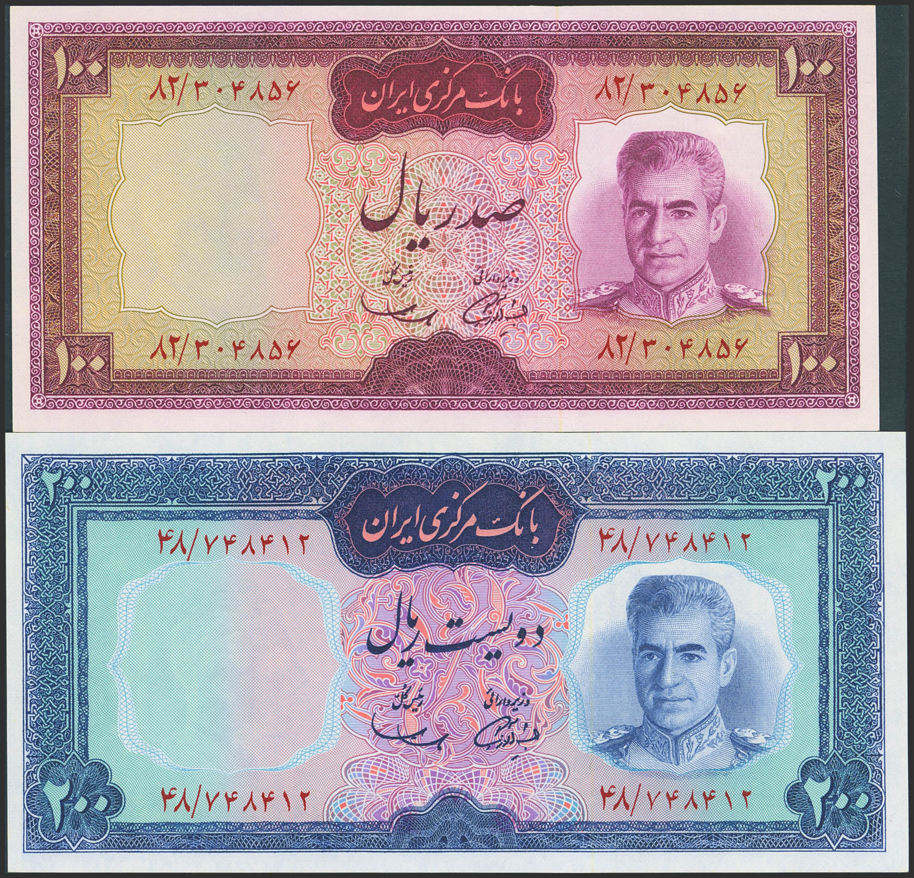Set of 2 banknotes of Iran of 100 Rials and 200 Rials. (1969ca). (Pick: 86, 87). Less than Uncirculated / Uncirculated.