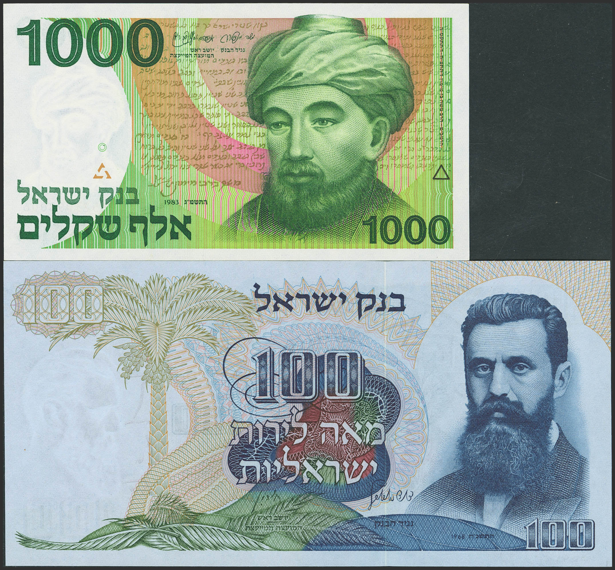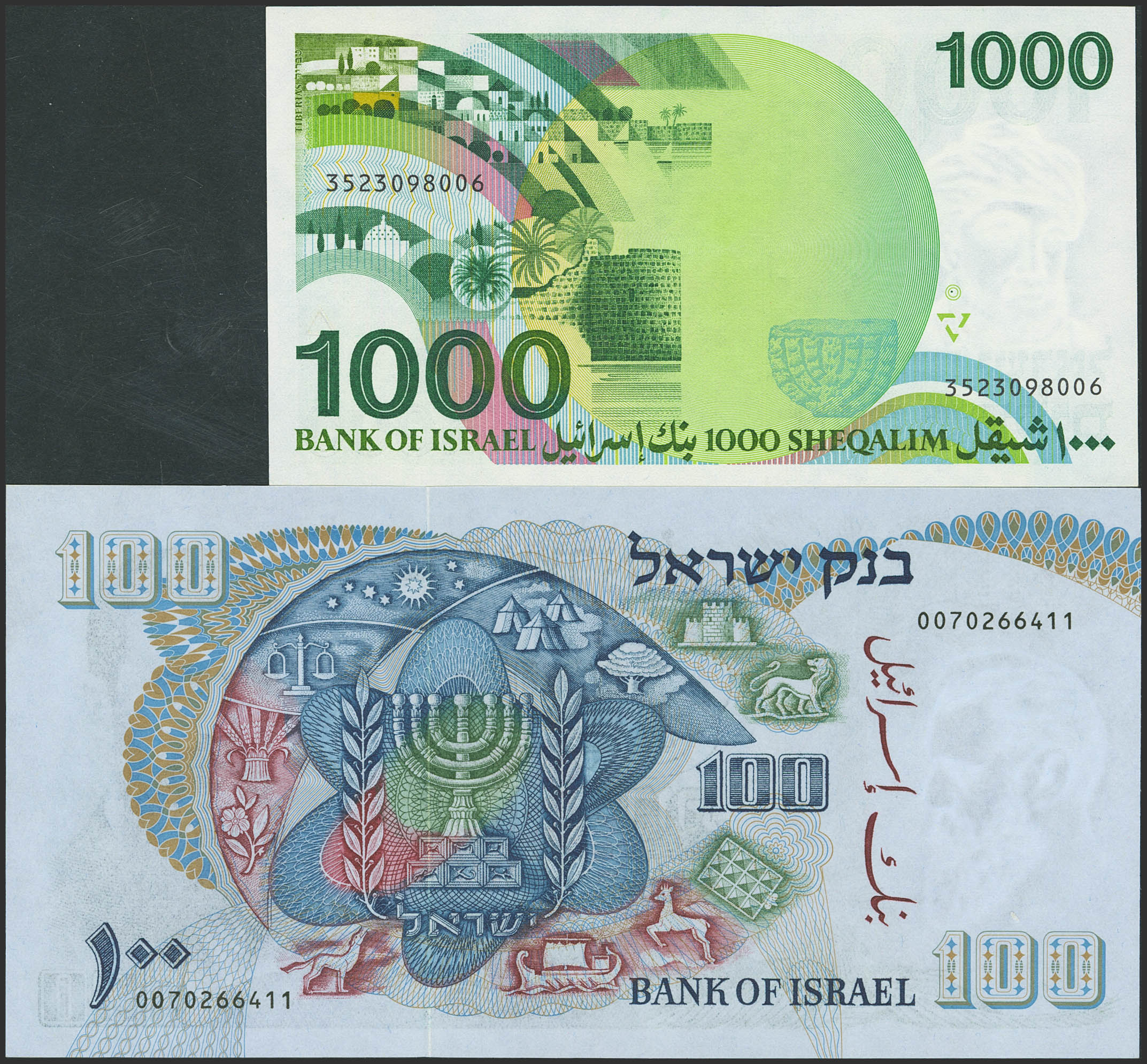 Set of 2 banknotes of Israel of 100 Lirot and 1000 Sheqalim. (1968ca). (Pick: 37, 49). Uncirculated.