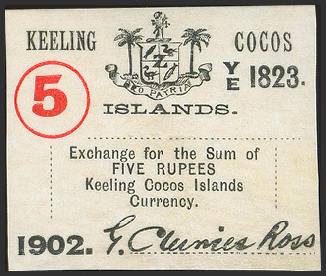 KEELING COCONUTS. 5 Rupees. (1823ca). (Pick: S128). Uncirculated.