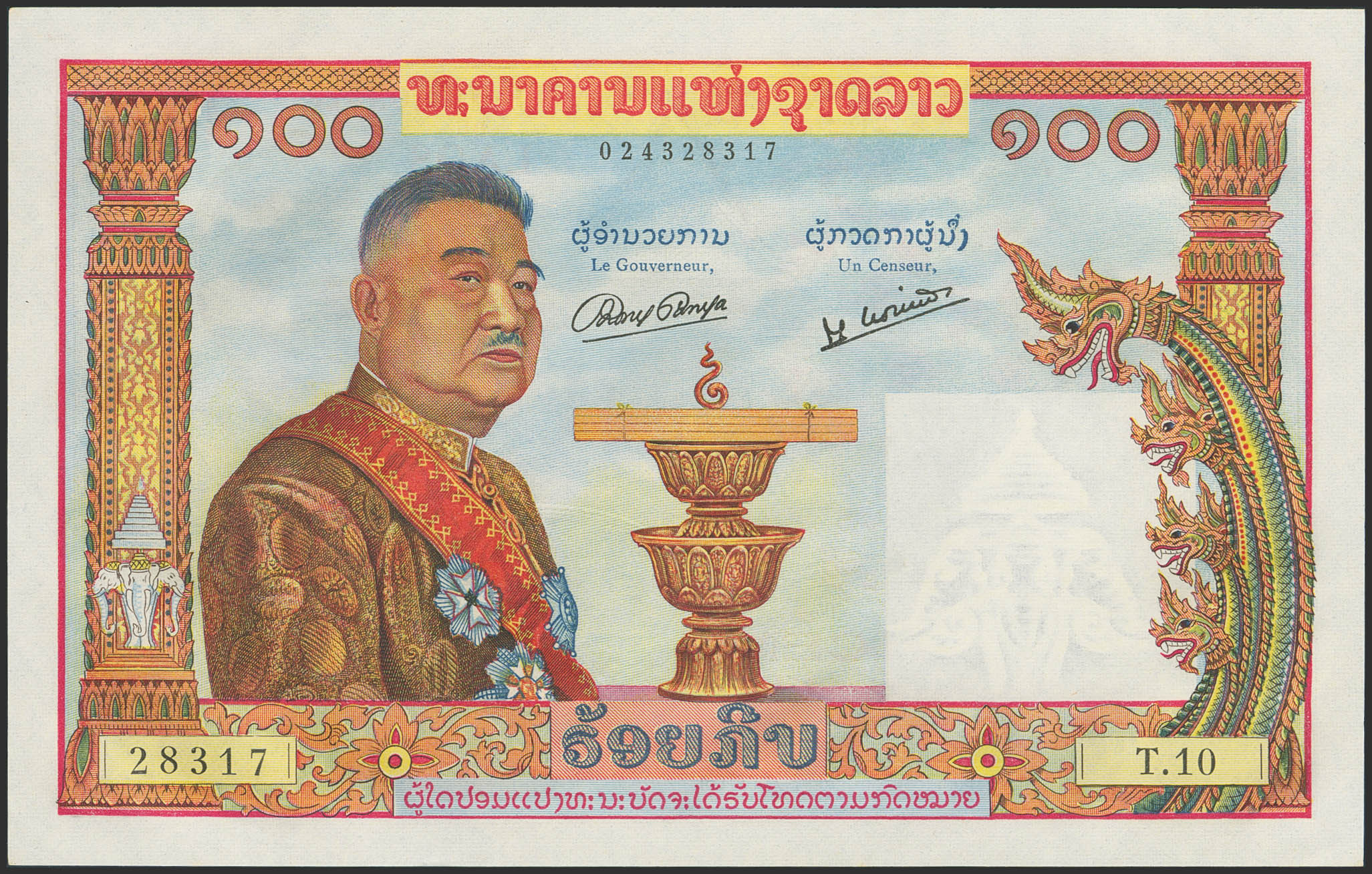 English LAOS. 100 Kip. (1957ca). (Pick: 6). Less than Uncirculated.