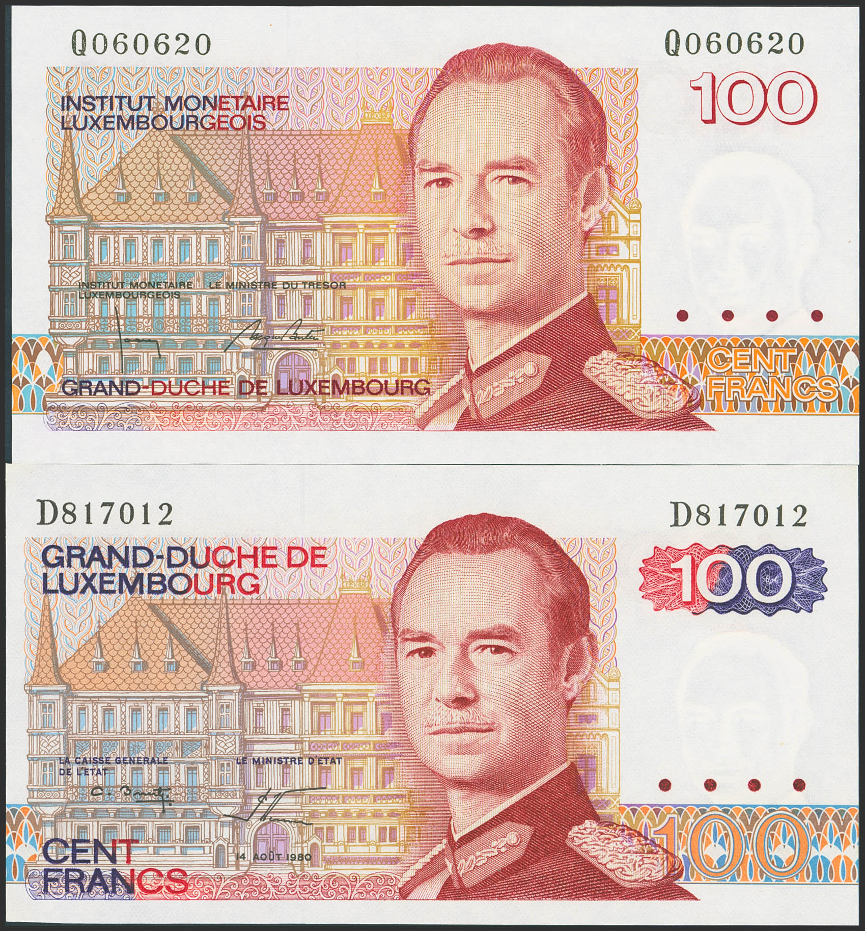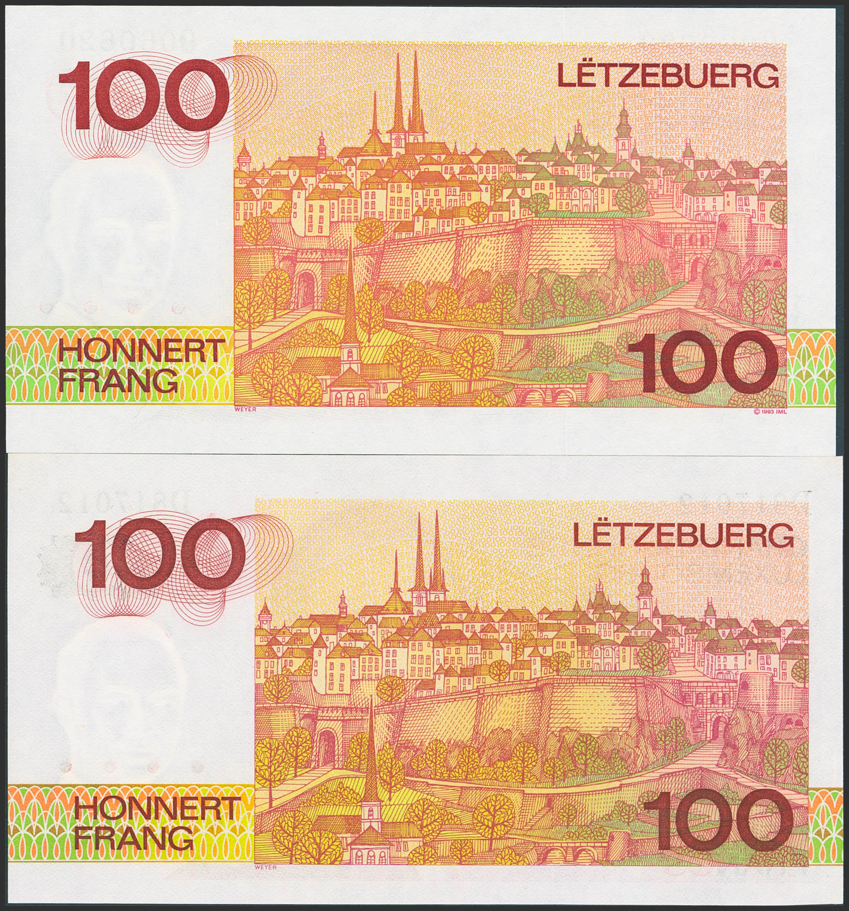 Set of 2 banknotes of Luxembourg of 100 Francs. (1980ca). (Pick: 58, 57). Uncirculated.