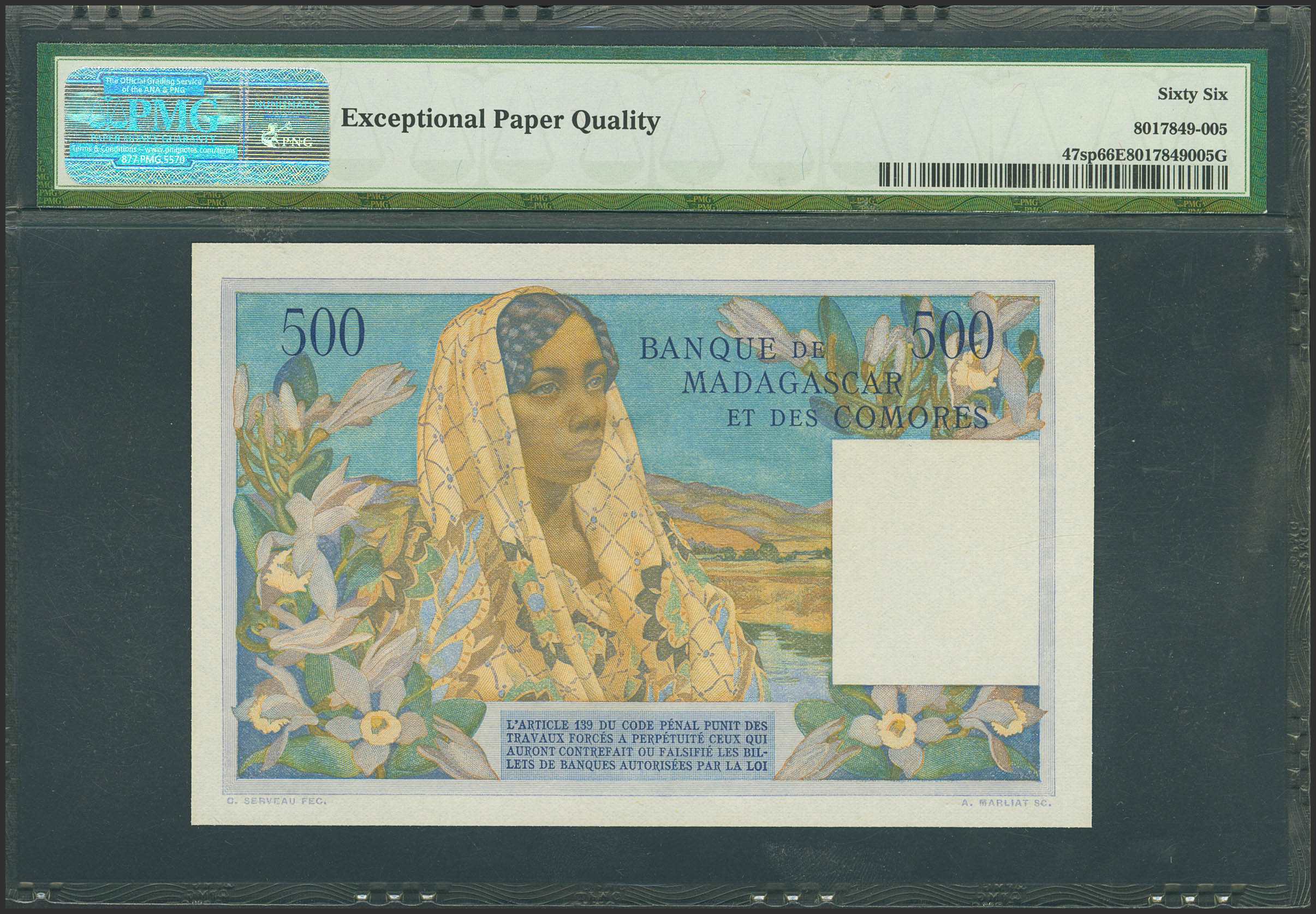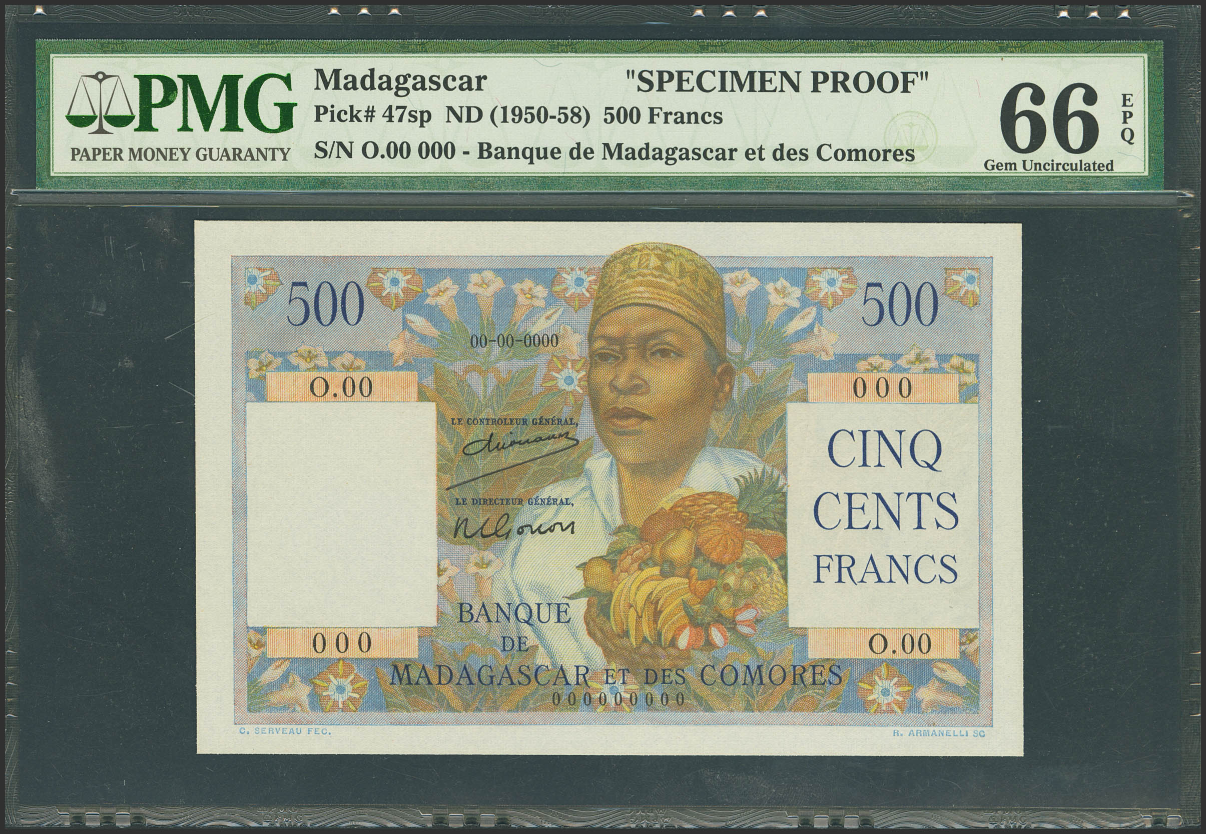 English MADAGAUncirculatedAR. 500 Francs. (1950ca). SPECIMEN PROOF and numbering 00000. (Pick: 47sp). Extremely rare. PMG66EPQ.