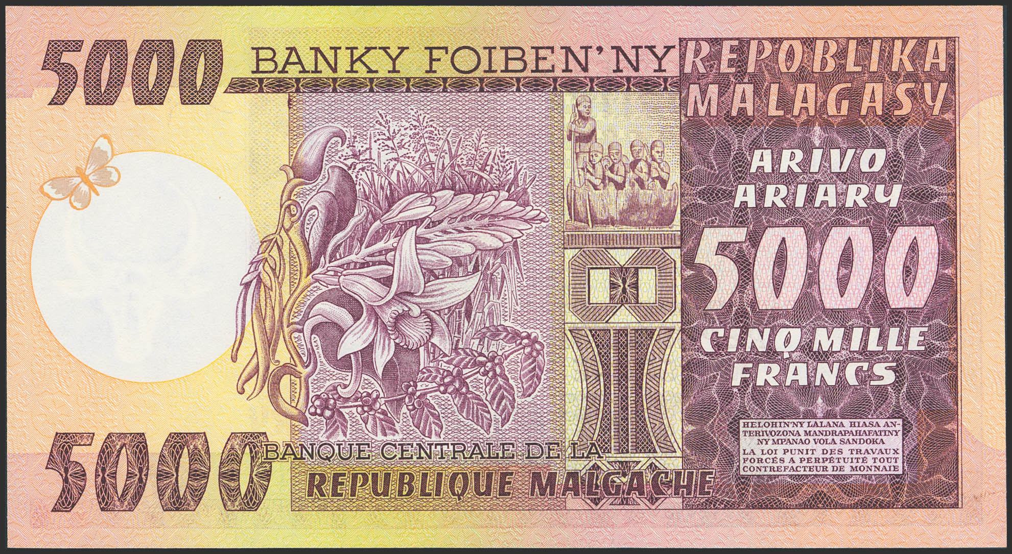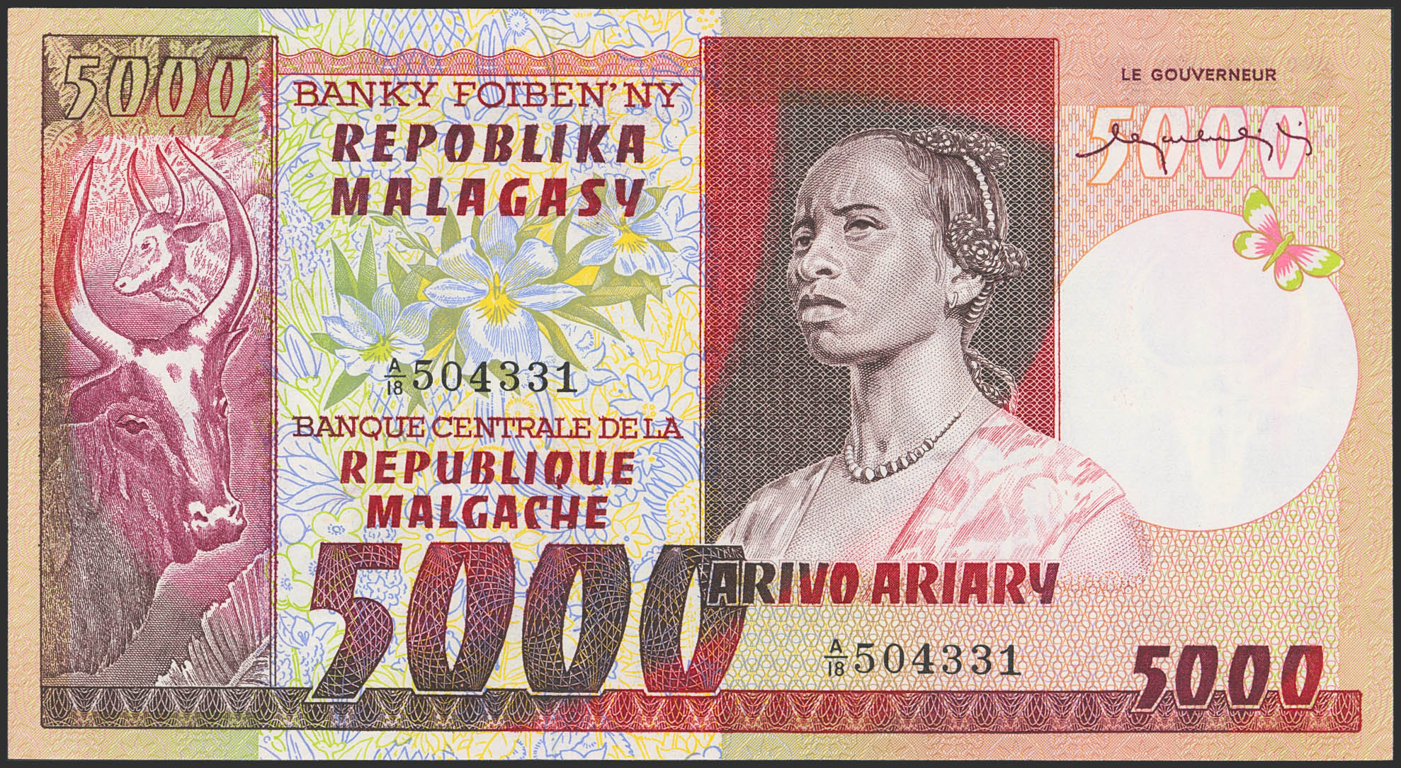 MADAGAUncirculatedAR. 5000 Ariary. (1975ca). (Pick: 66). Uncirculated.