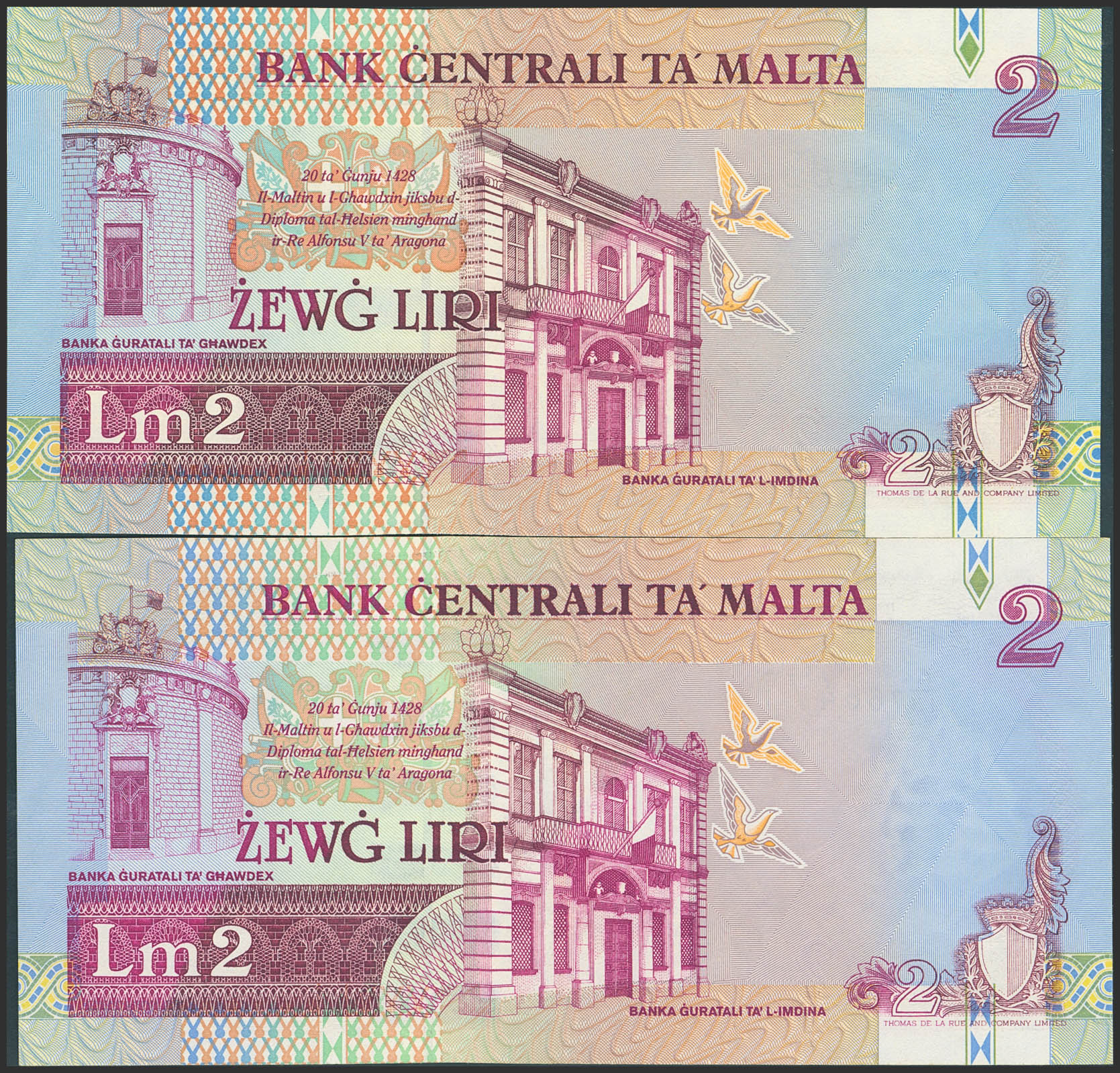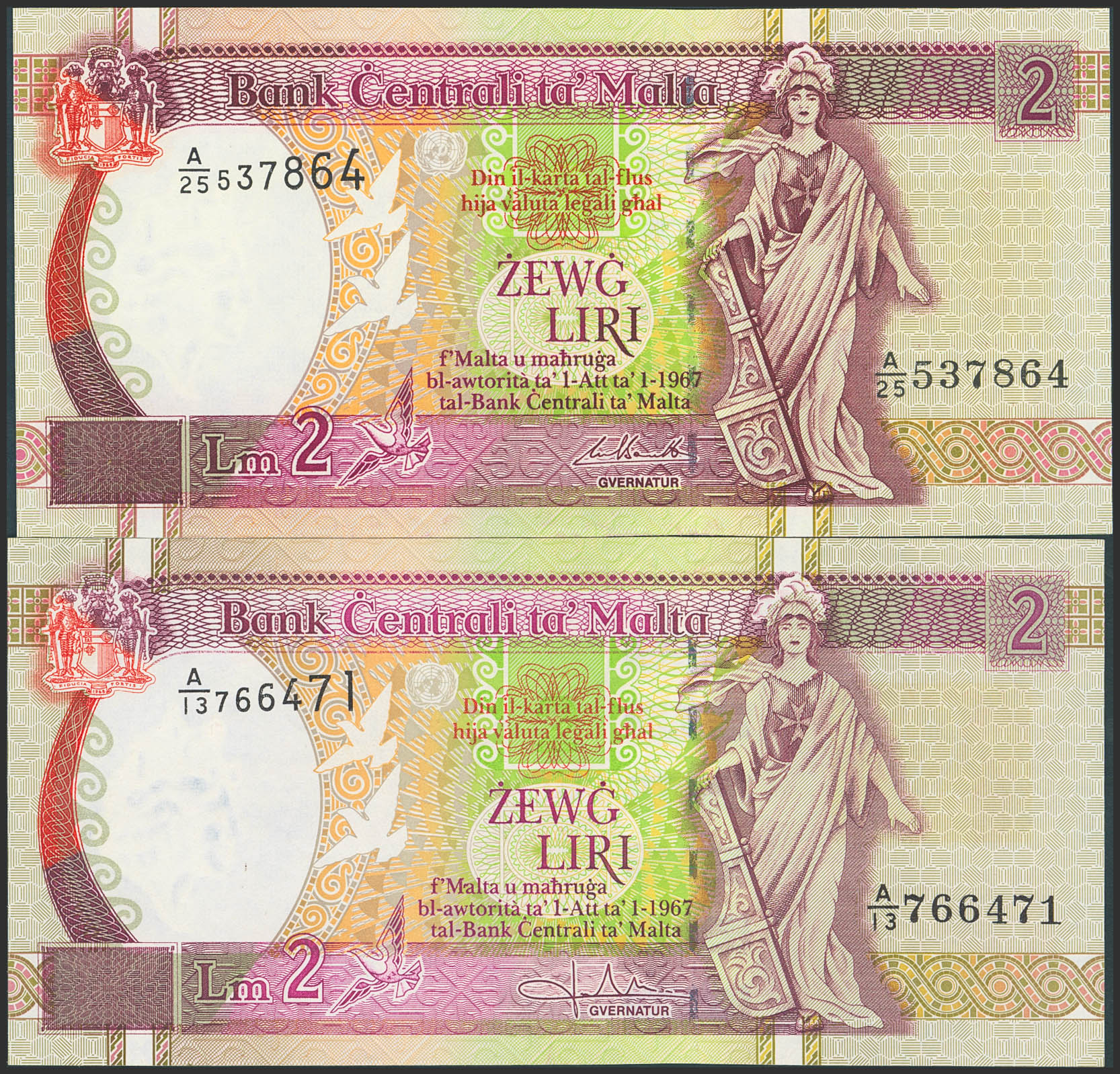 English Set of 2 banknotes of Malta of 2 Liri. (1994ca). (Pick: 45(2)). More than Uncirculated.