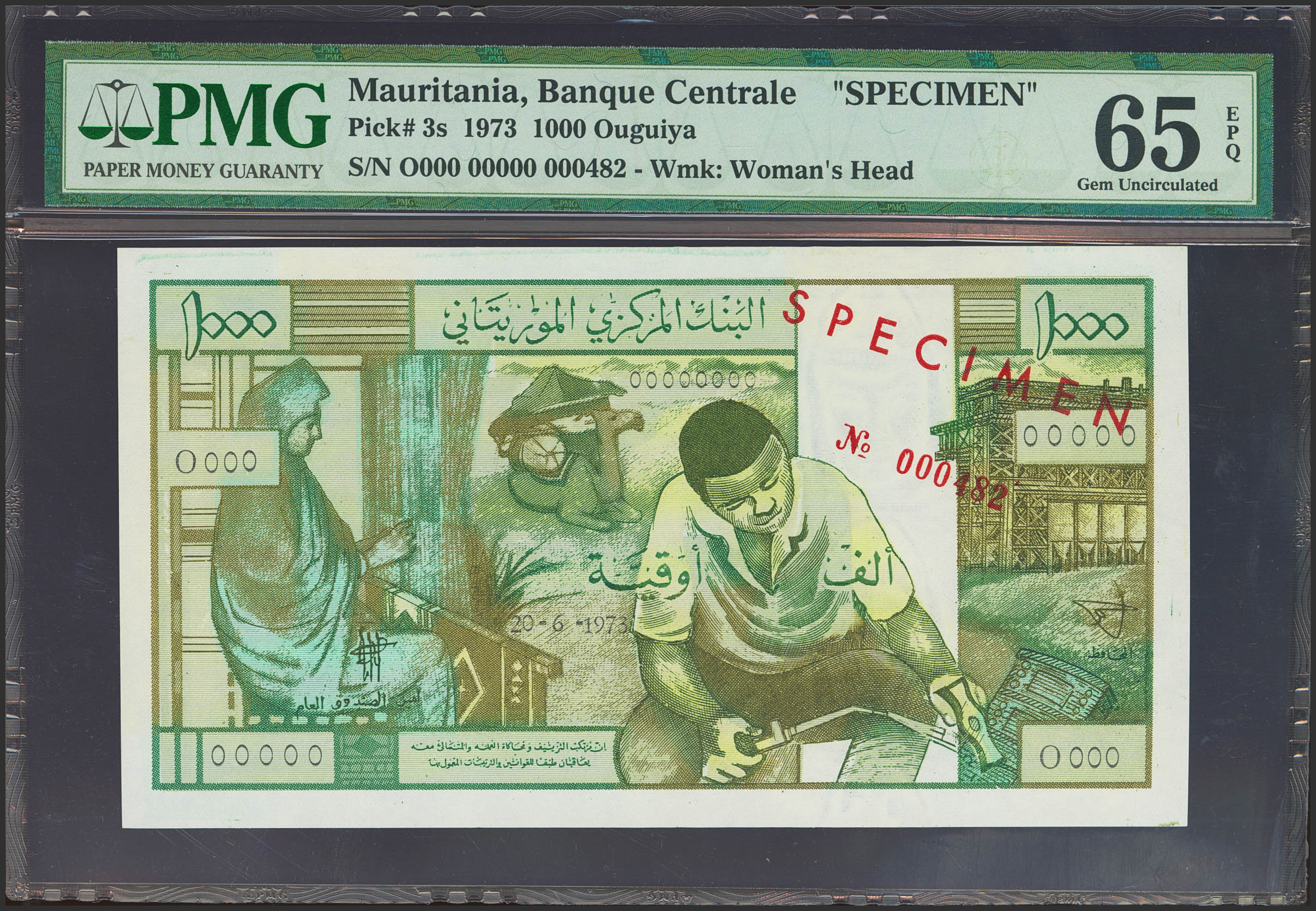 English MAURITANIA. 1000 Ouguiya. June 20, 1973. SPECIMEN. (Pick: 3s). Very rare. PMG65EPQ.