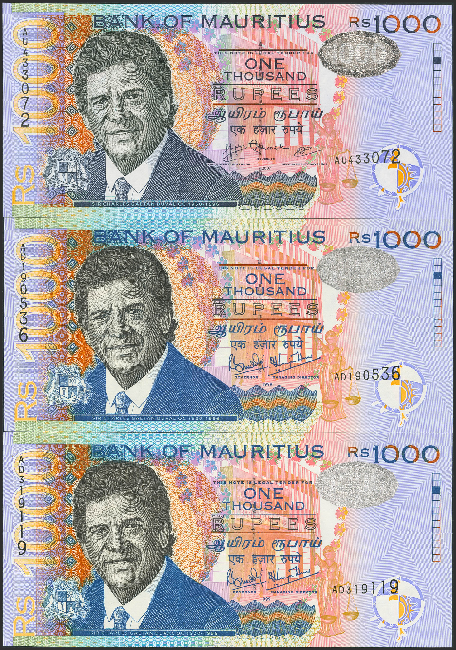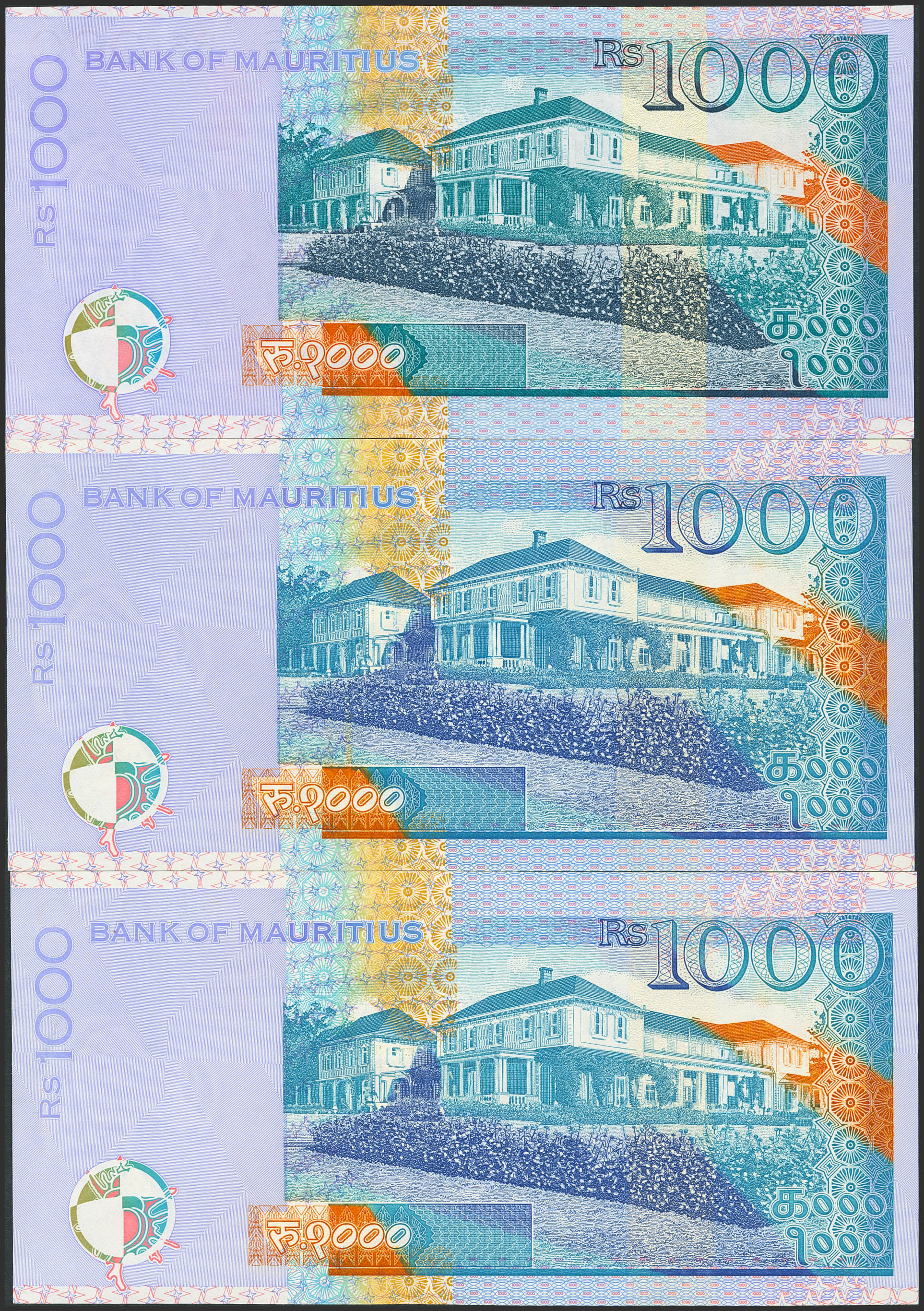 English Set of 3 banknotes of Mauritius of 1000 Rupees. (1999ca). (Pick: 54(2), 57). Uncirculated.