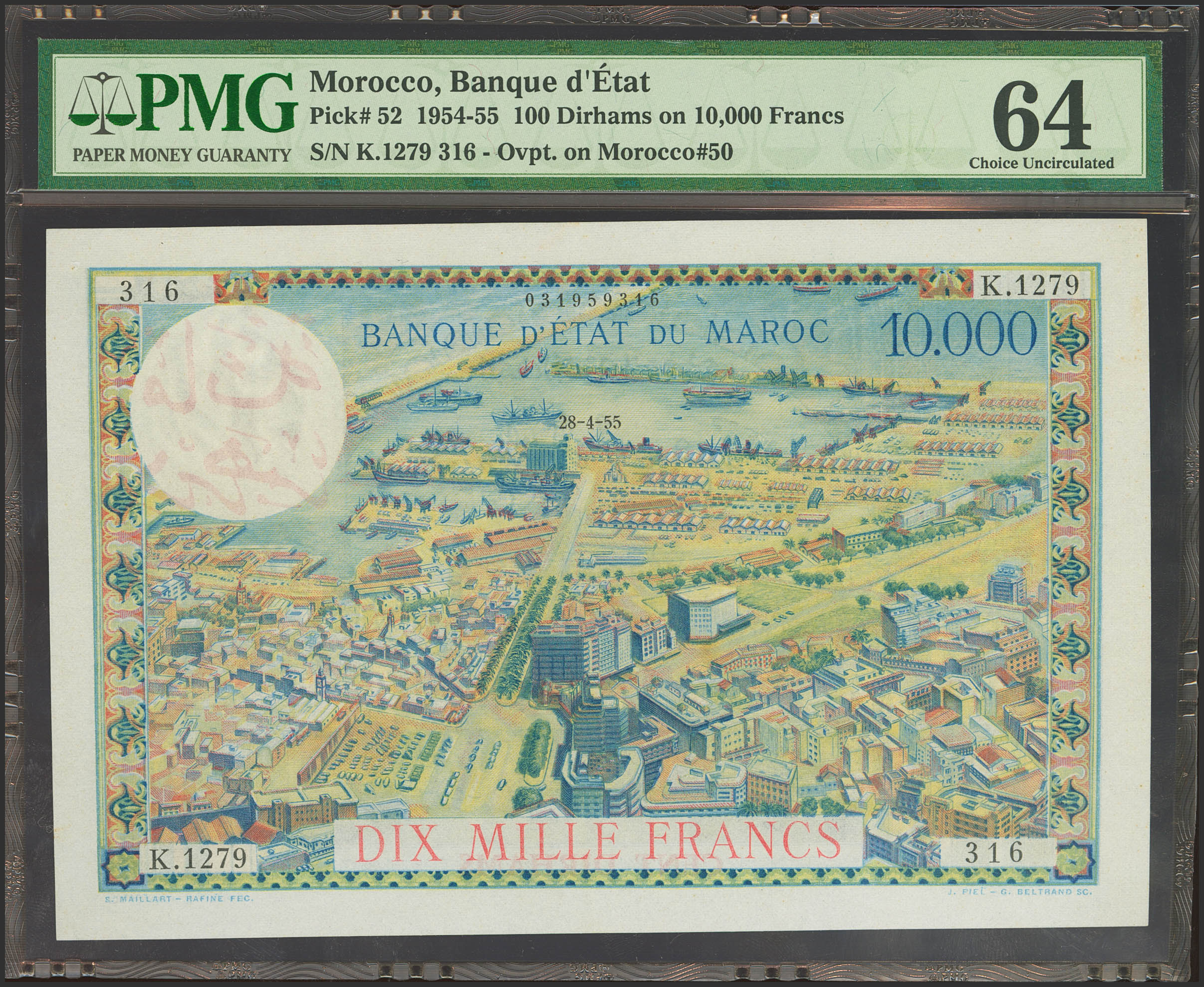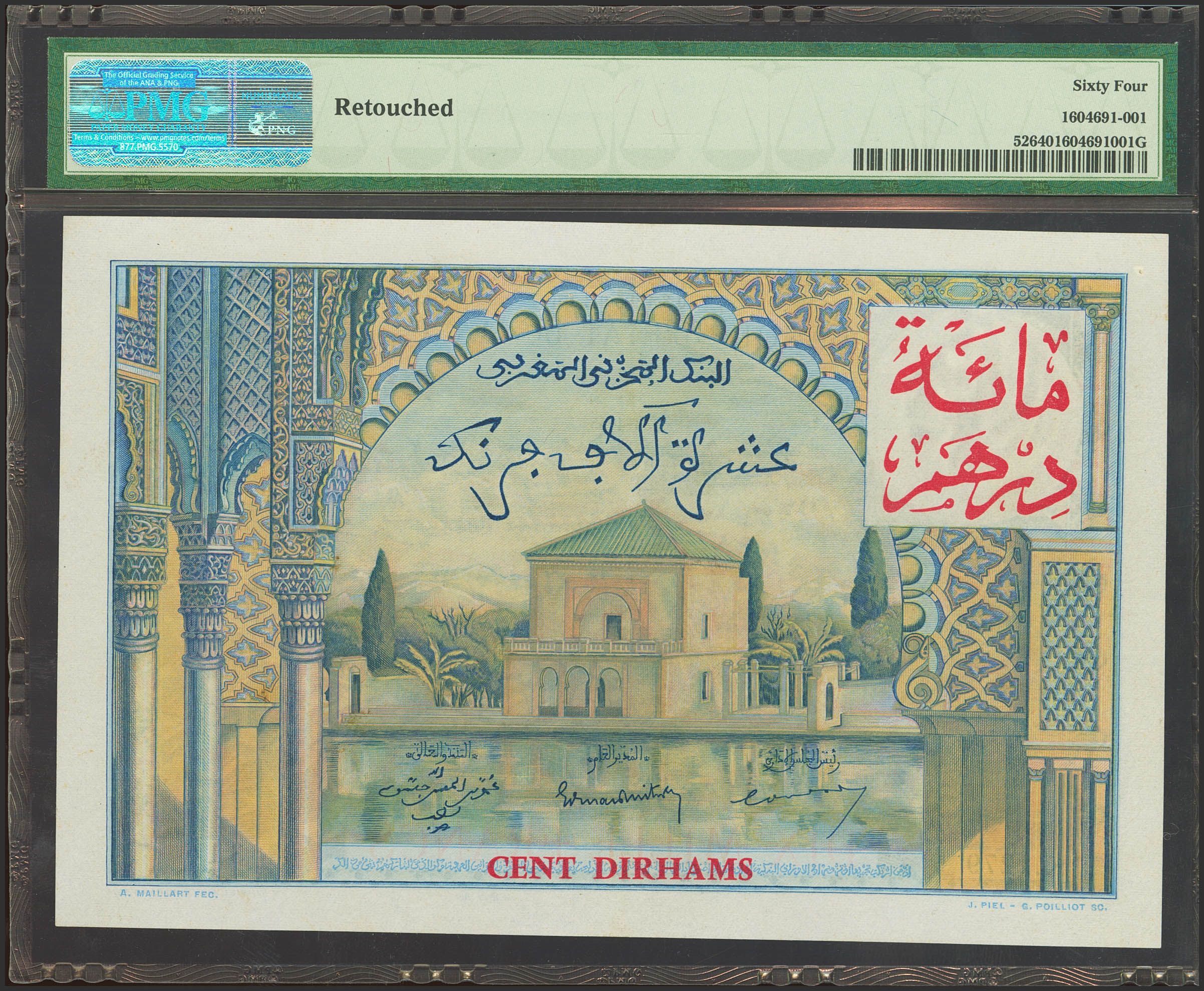 English MOROCCO. 100 Dirhams. April 28, 1955. (Pick: 52). Extremely rare, especially in this exceptional quality. PMG64 (retouched).