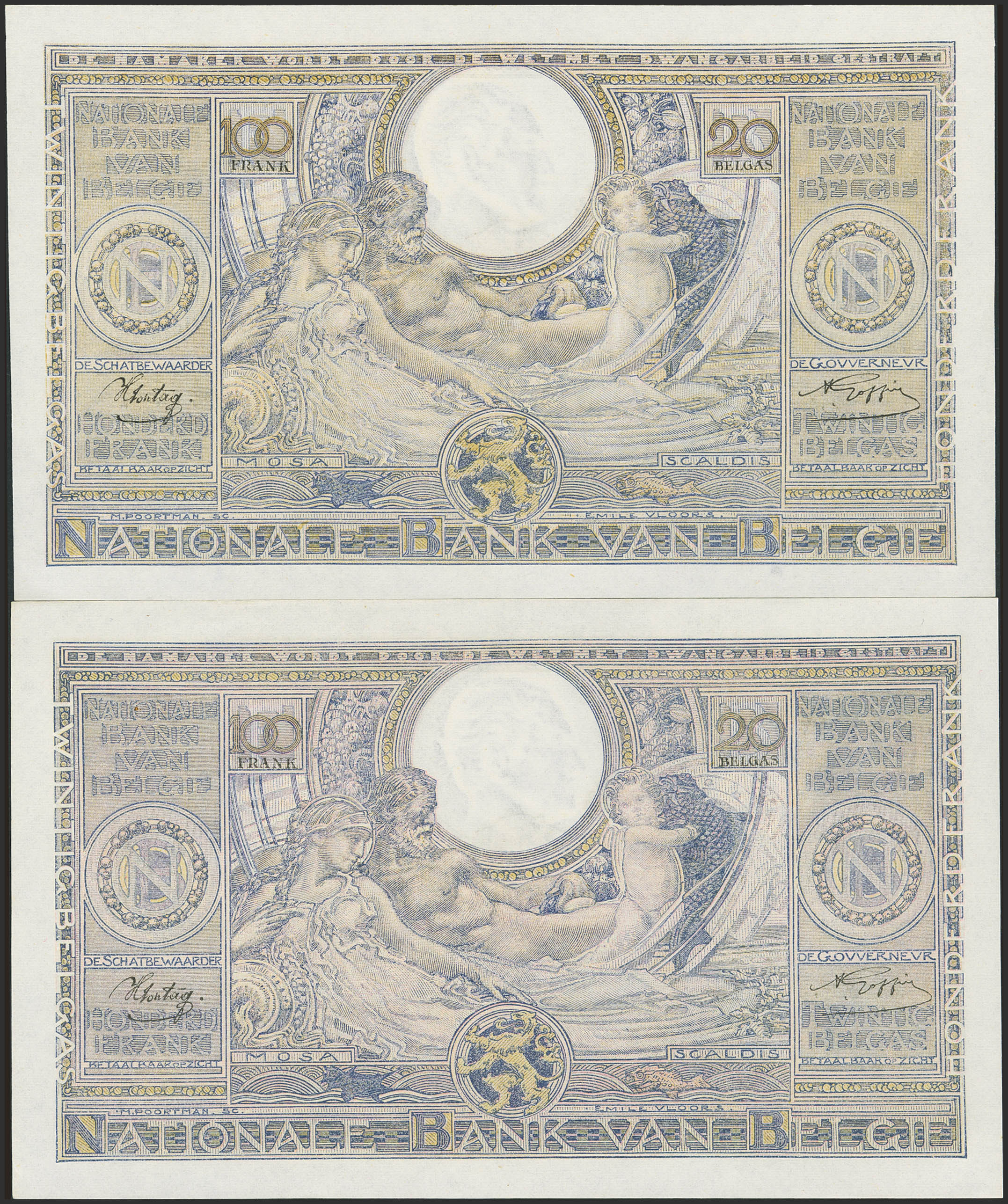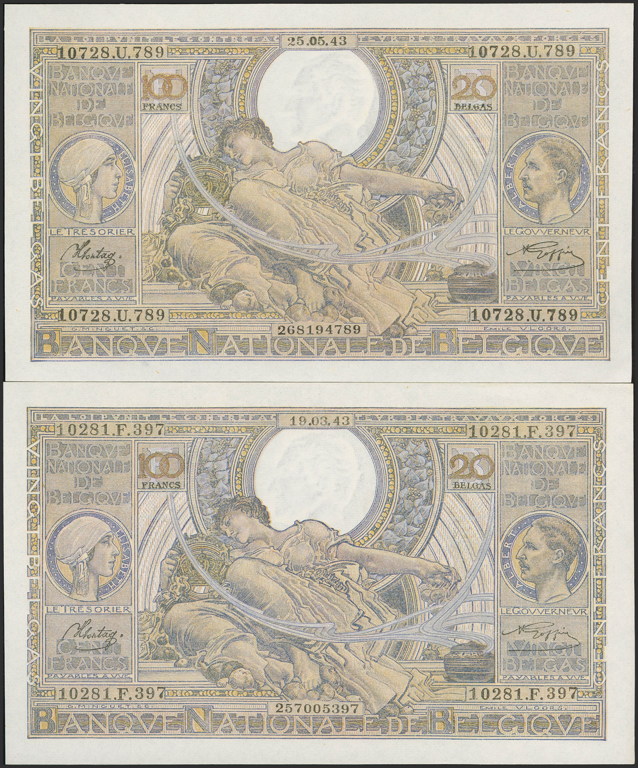 English BELGIUM. 100 Francs. March 19, 1943 and May 25, 1943. (Pick: 107). Uncirculated / Less than Uncirculated.