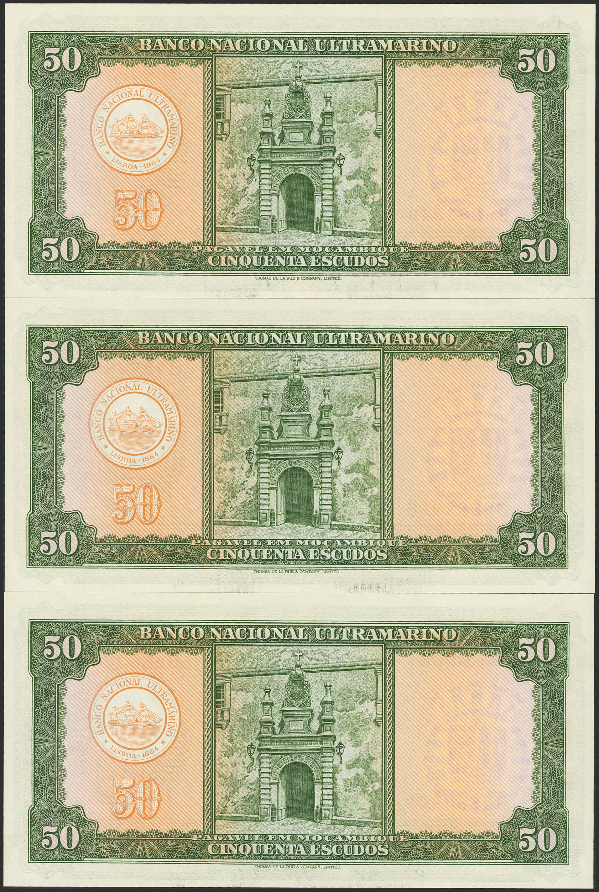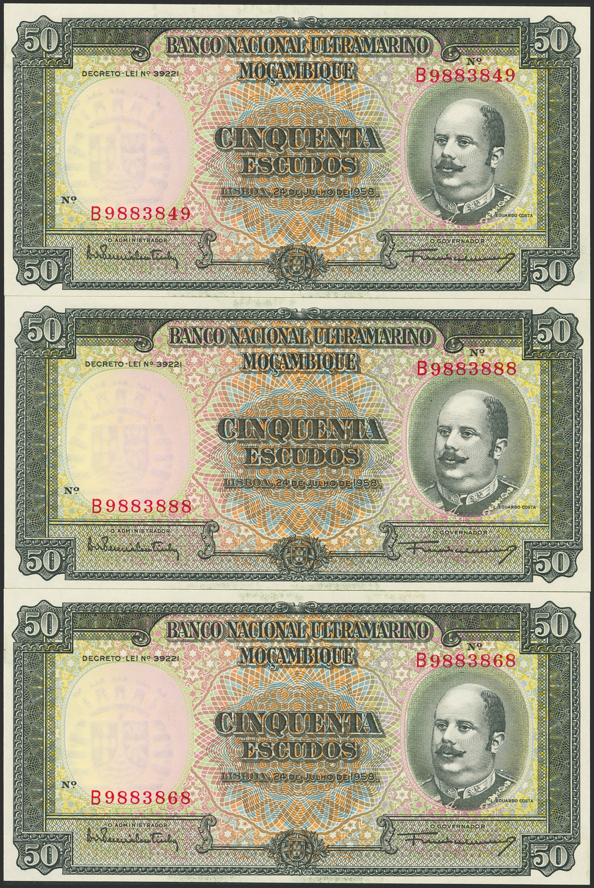 Set of 3 banknotes of Mozambique of 50 Escudos. 24 July 1958. (Pick: 106). Less than Uncirculated / Uncirculated.