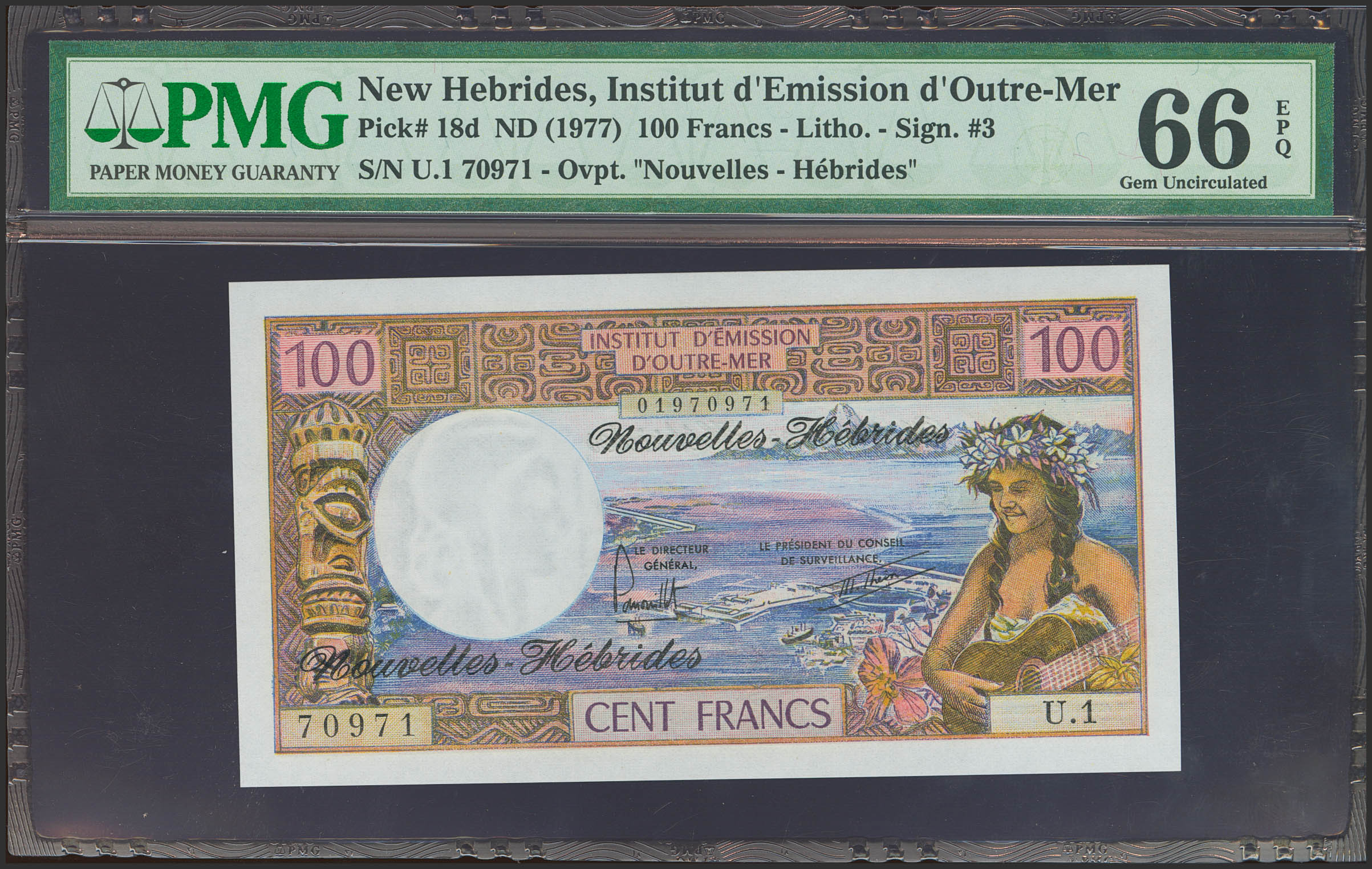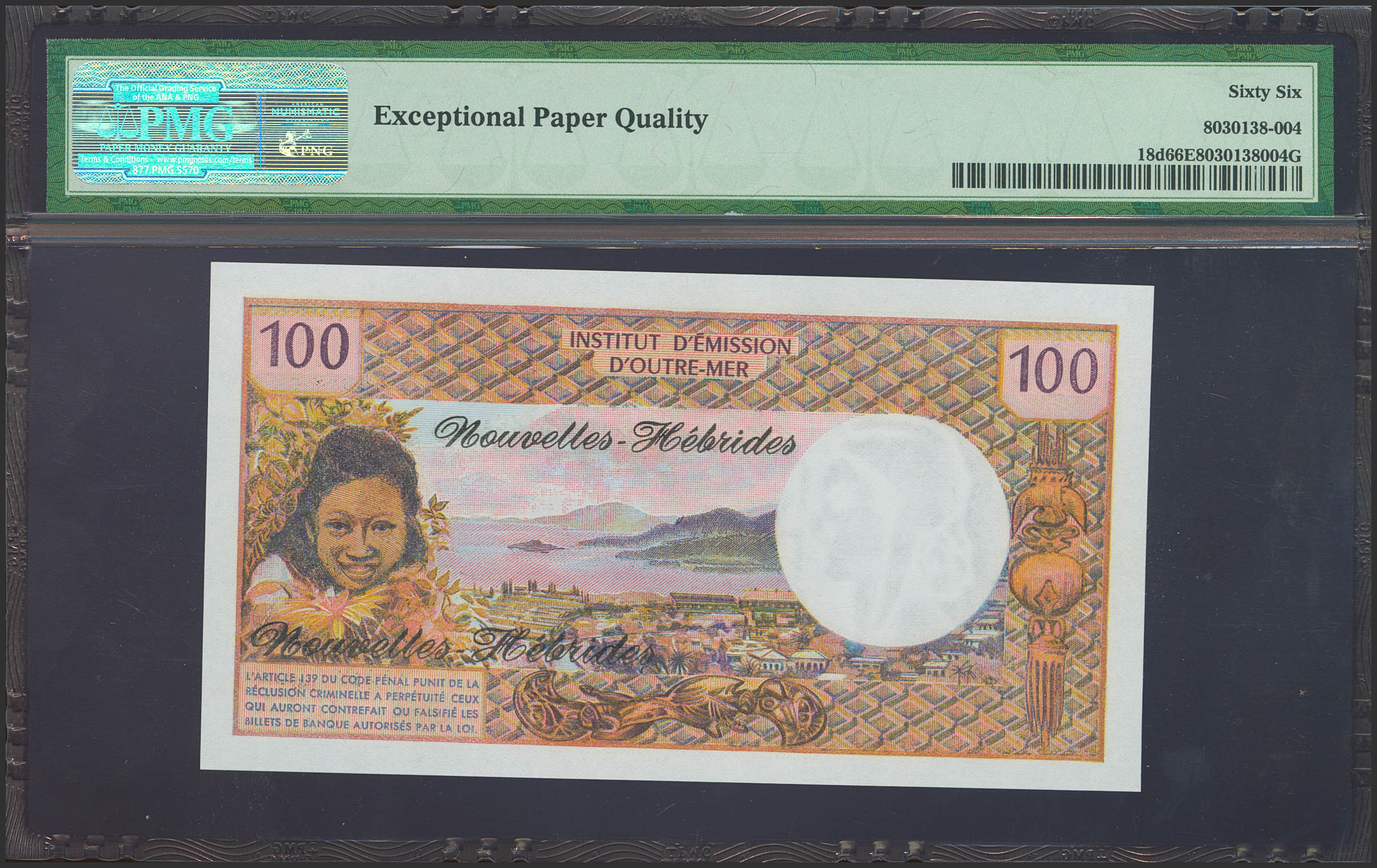NEW HEBRIDES. 100 Francs. (1977ca). (Pick: 18d). PMG66EPQ.