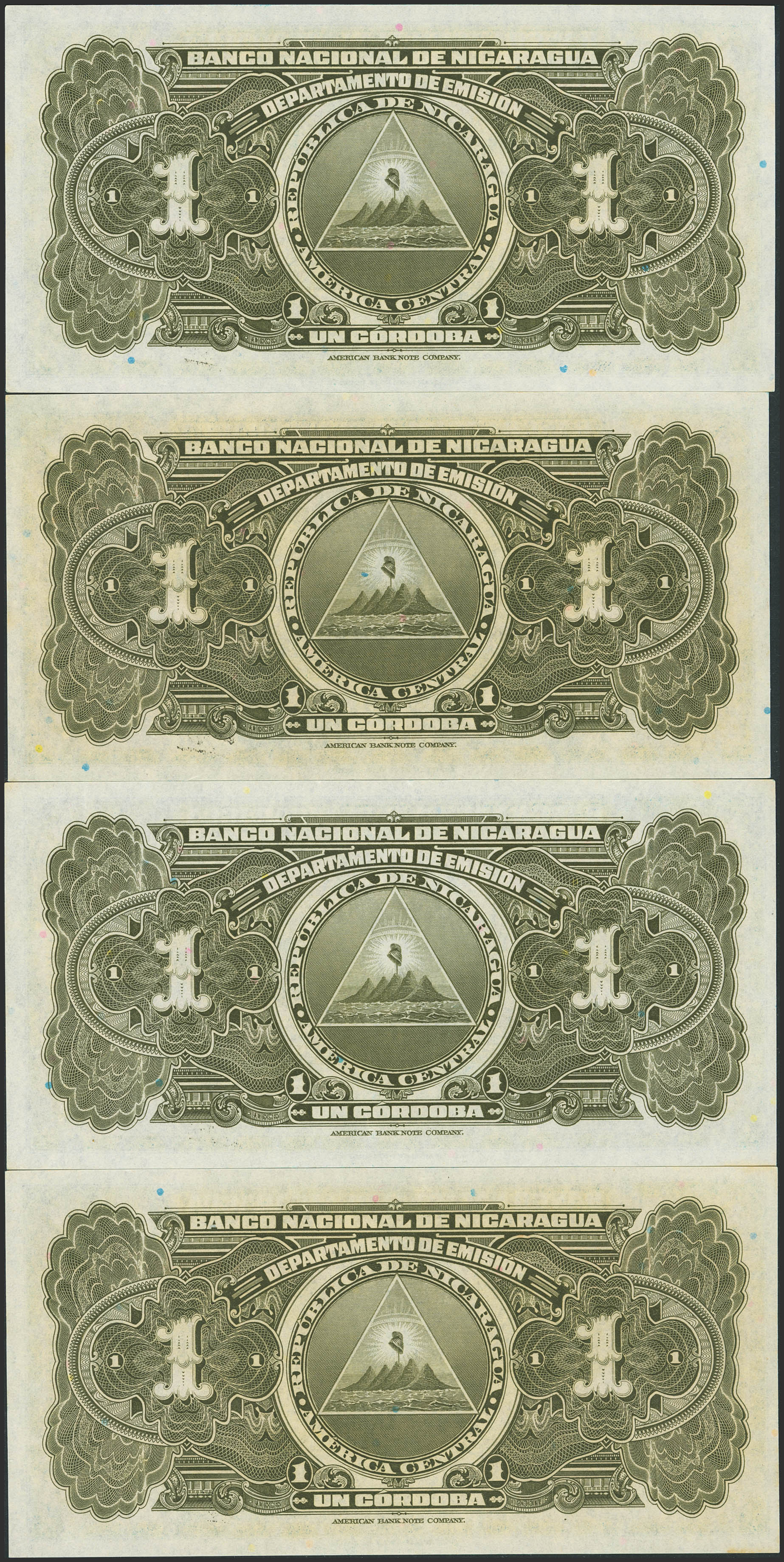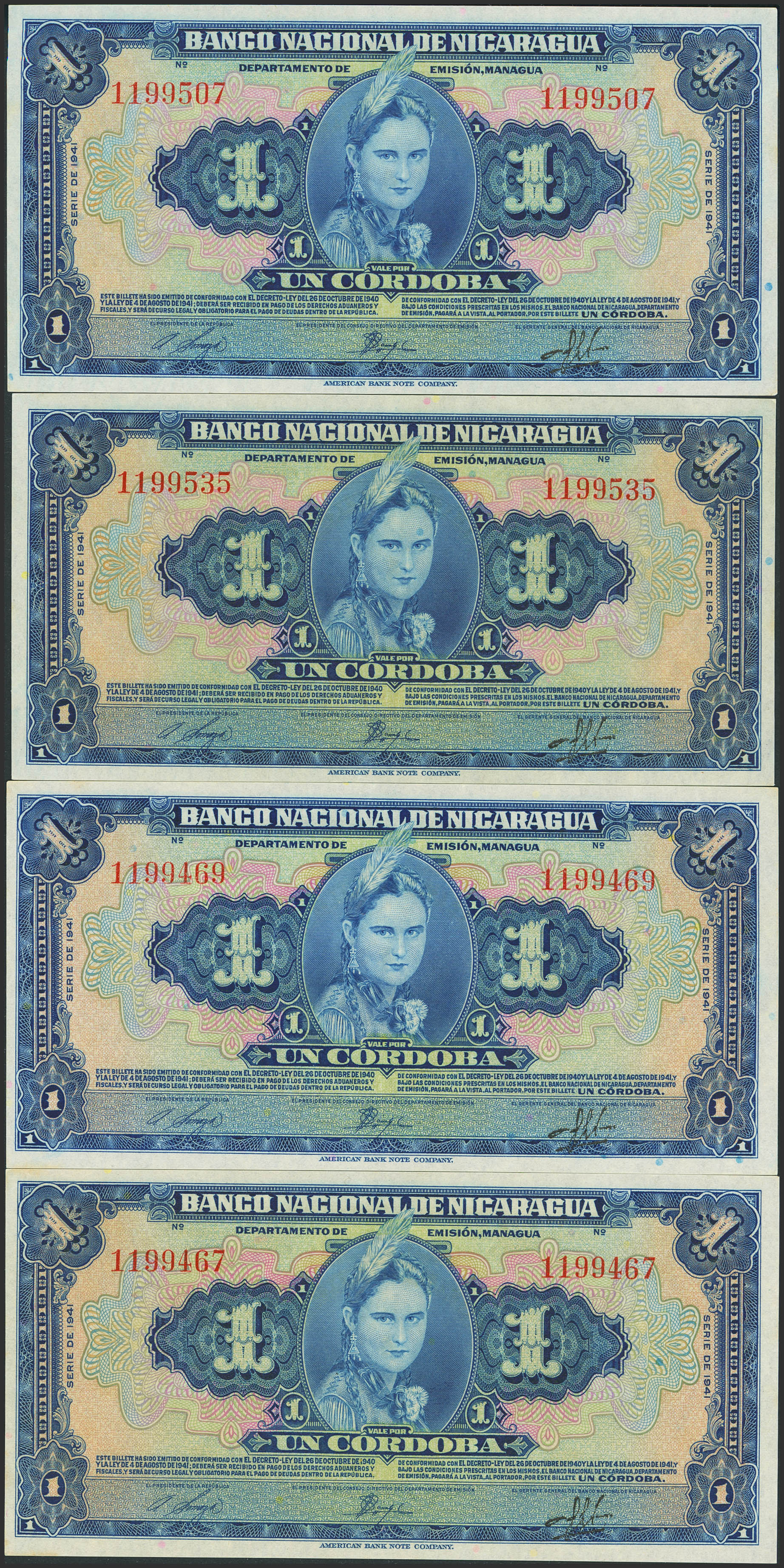 Set of 4 banknotes of Nicaragua of 1 Cordoba. 1941. (Pick: 90a). Less than Uncirculated / Uncirculated.