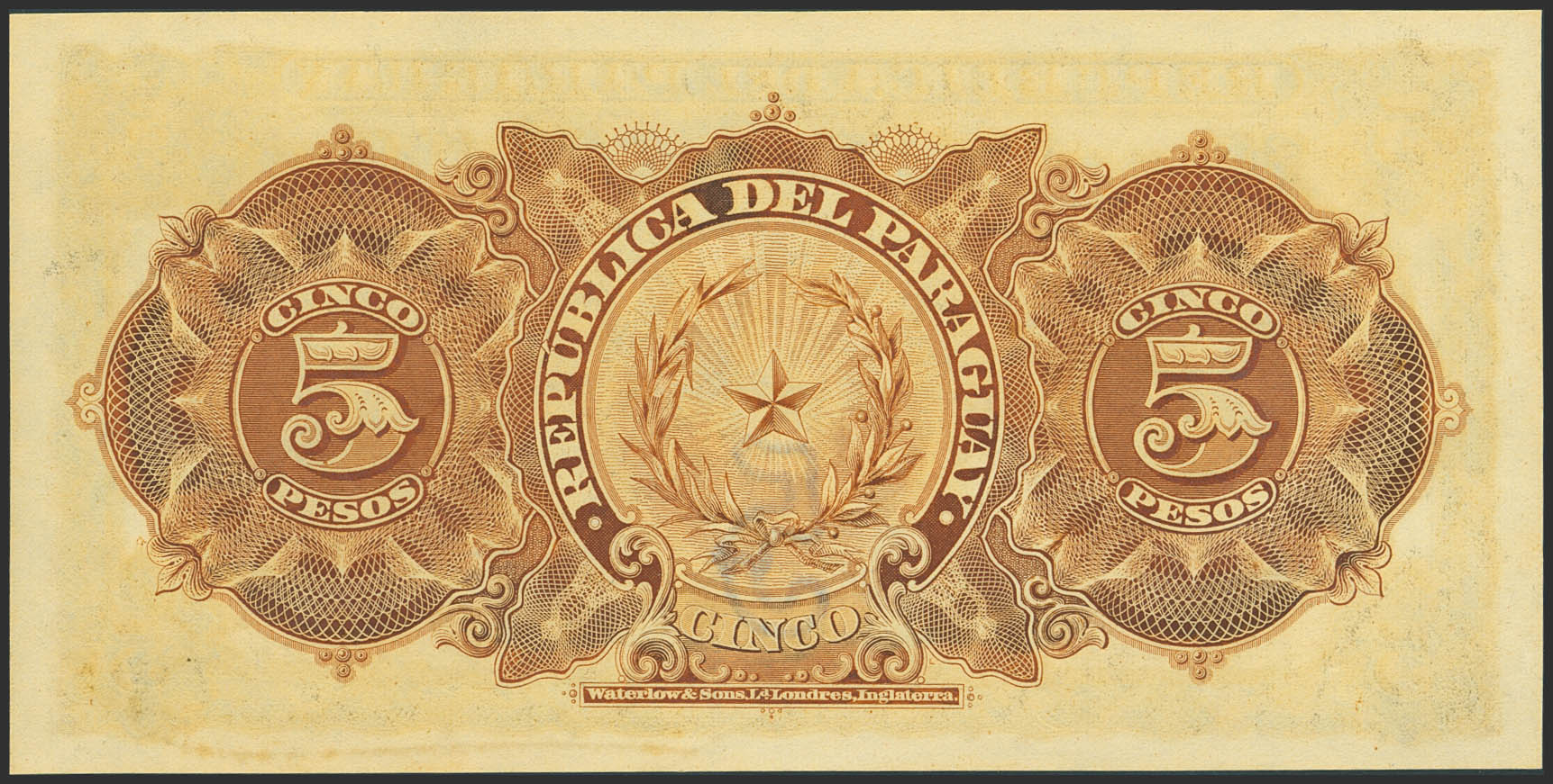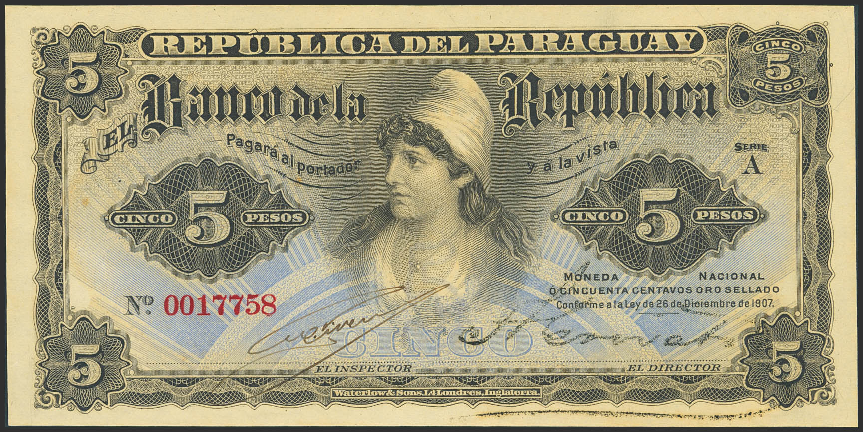 PARAGUAY. 5 Pesos. December 26, 1907. (Pick: 156). About Uncirculated.
