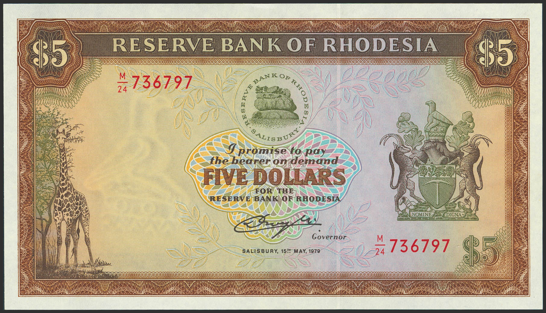 RHODESIA. 5 Dollars. May 15, 1979. (Pick: 32c). Less than Uncirculated.