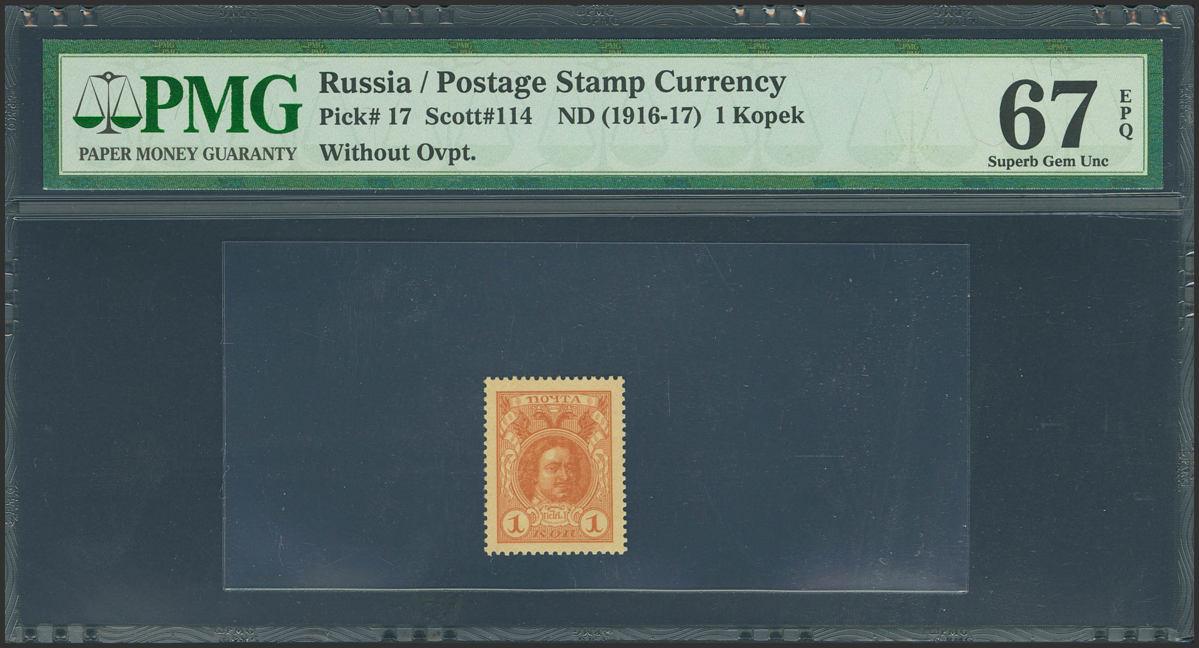 RUSSIA. 1 Kopek. (1916ca). Postage Stamp Currency. (Pick: 17). PMG67EPQ.