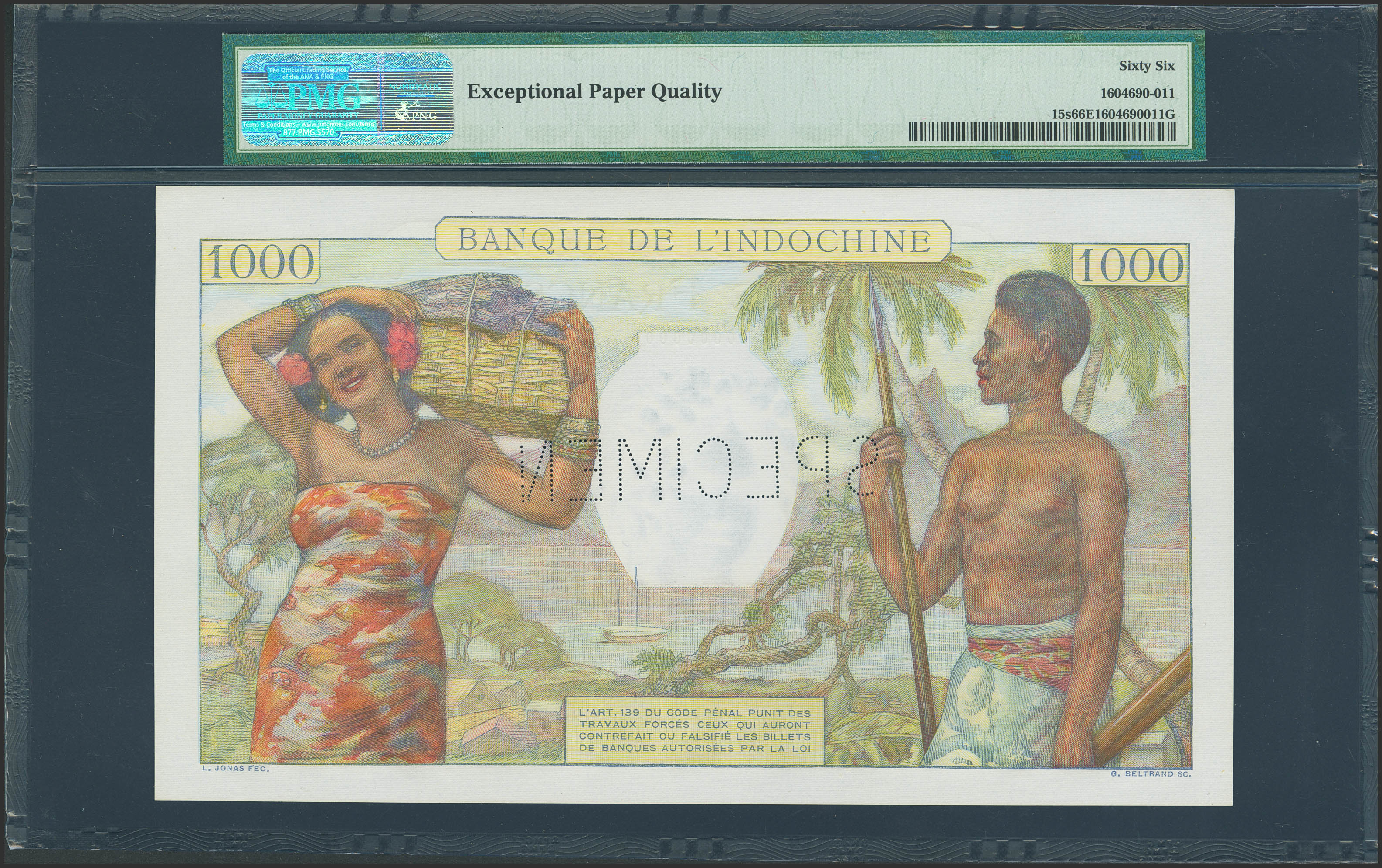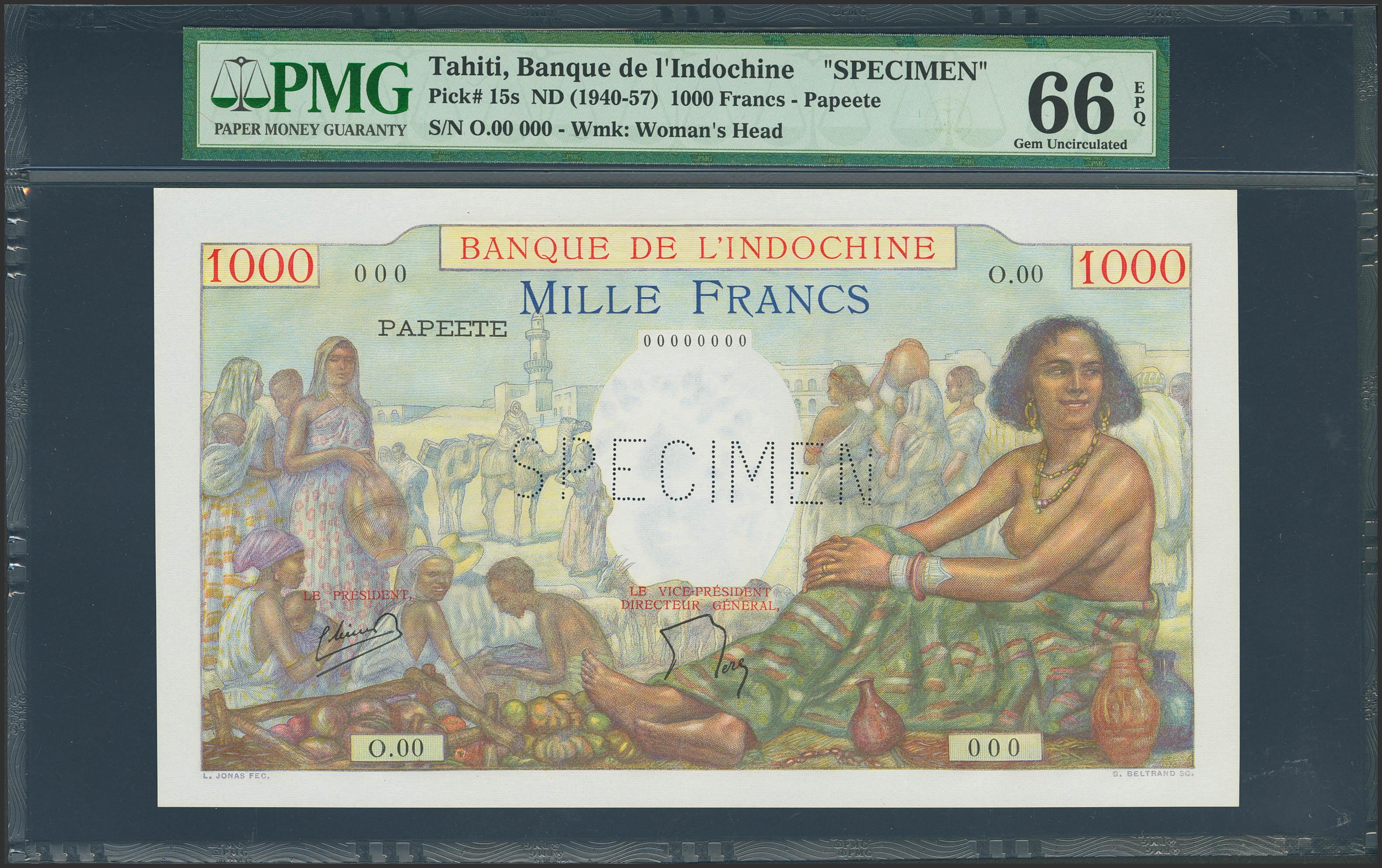 English TAHITI. 1000 Francs. (1940ca). SPECIMEN. (Pick: 15s). Very rare, especially in this quality. PMG65EPQ.