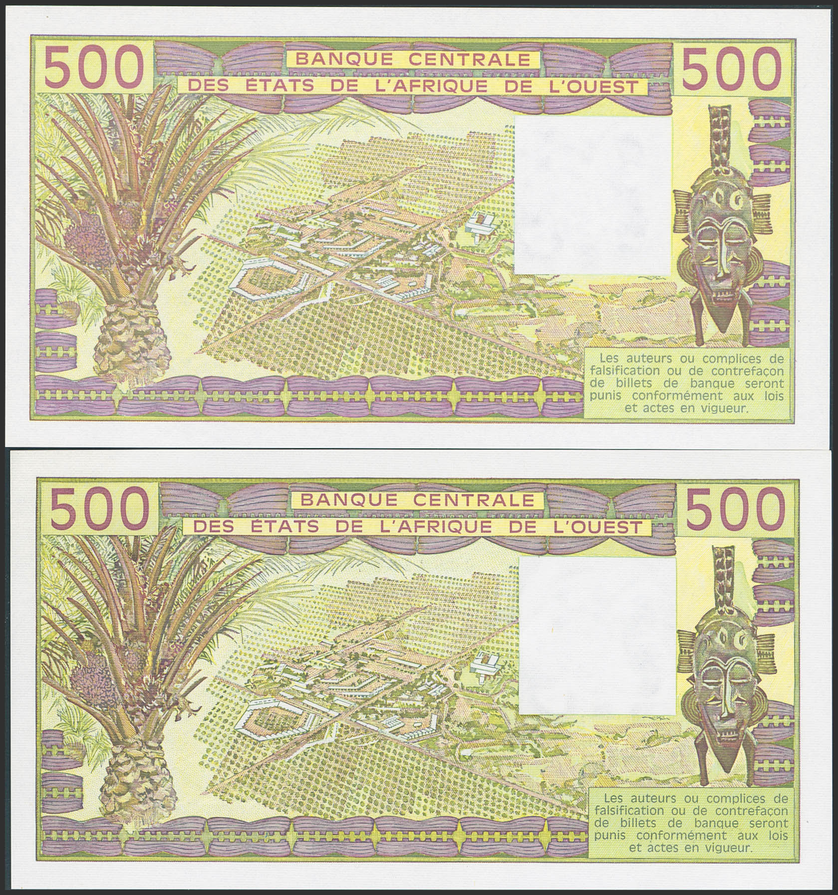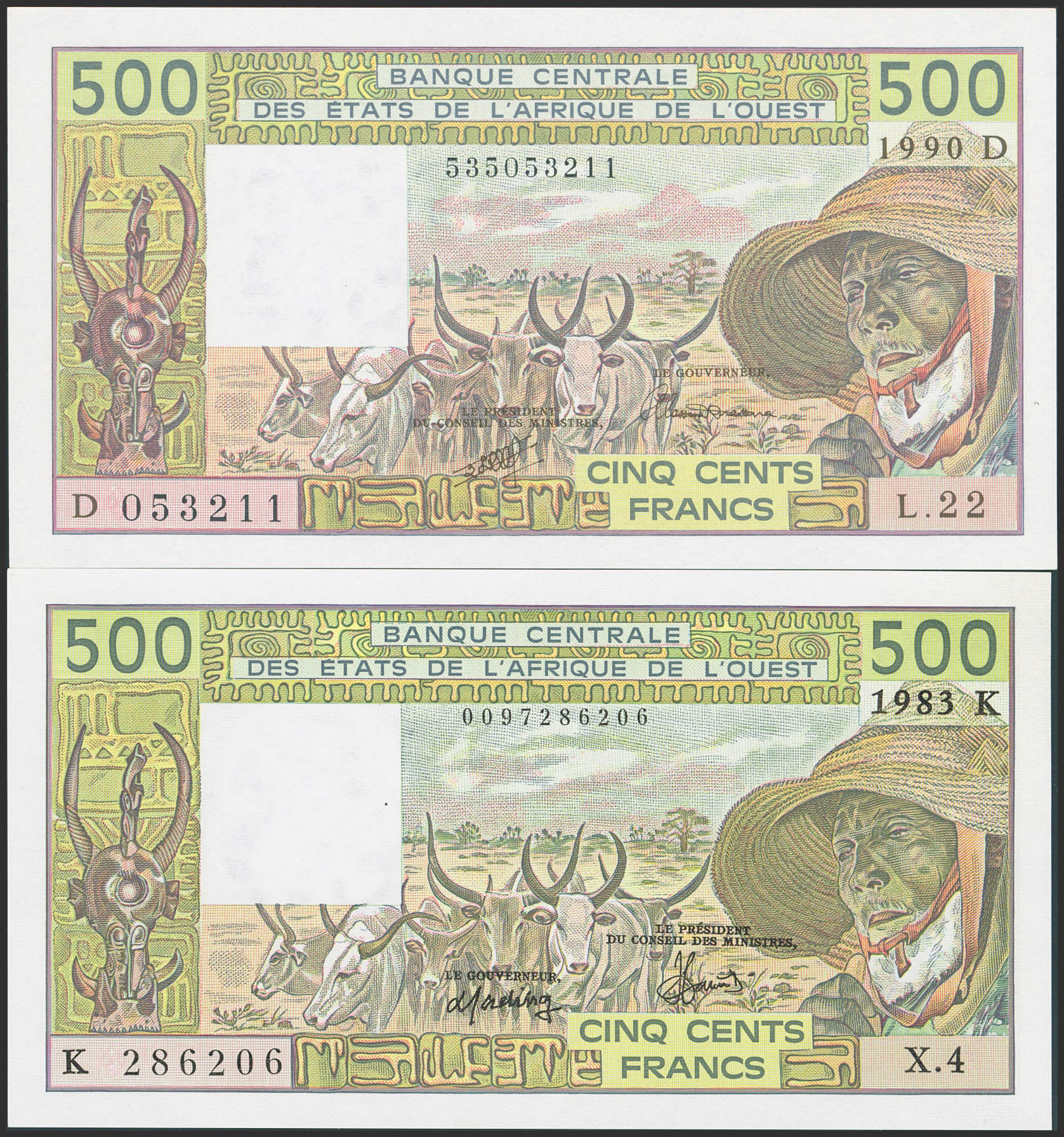 Set of 2 banknotes of West African States of 500 Francs. (1983ca). (Pick: 405Di, 706Kh). Less than Uncirculated / Uncirculated.