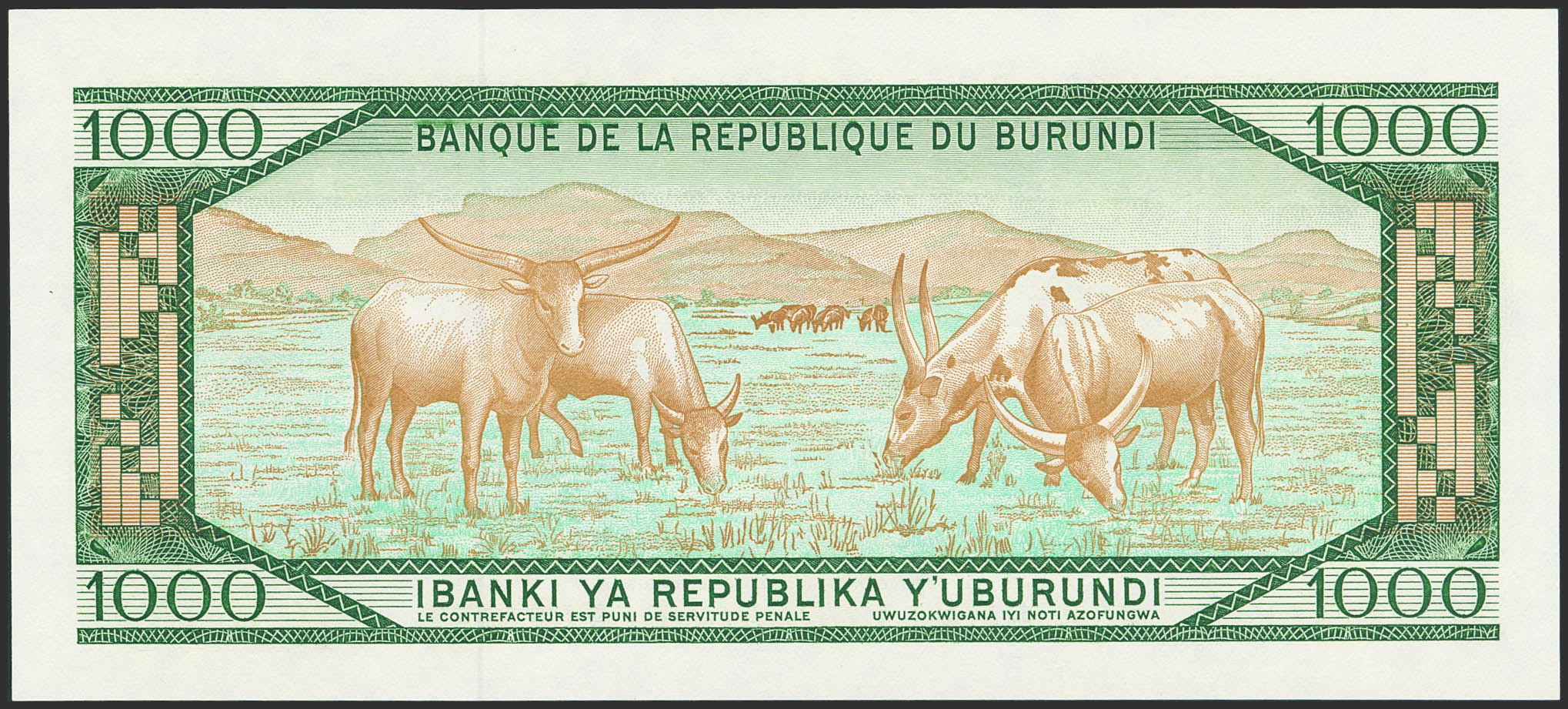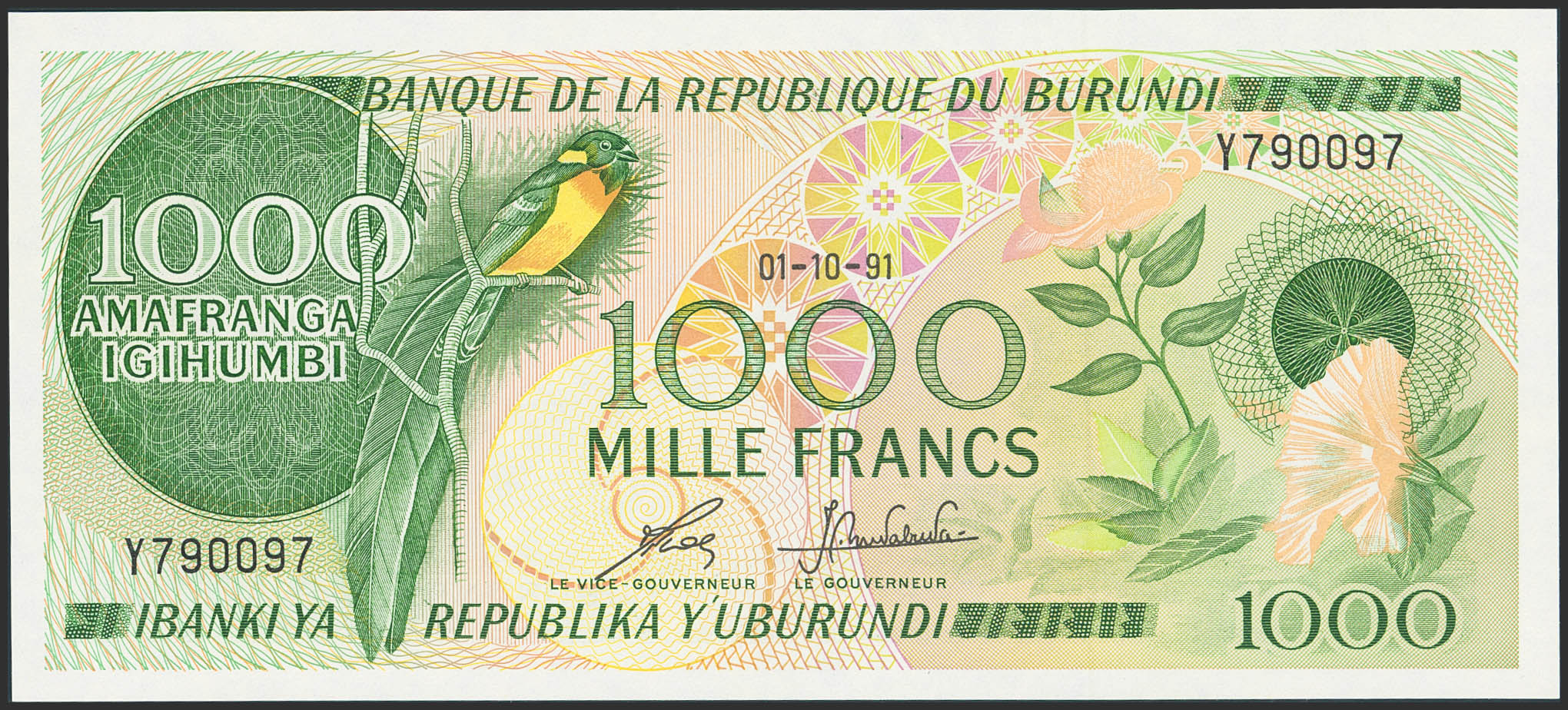 BURUNDI. 1000 Francs. 1 October 1991. Palindromic number. (Pick: 31d). Uncirculated.