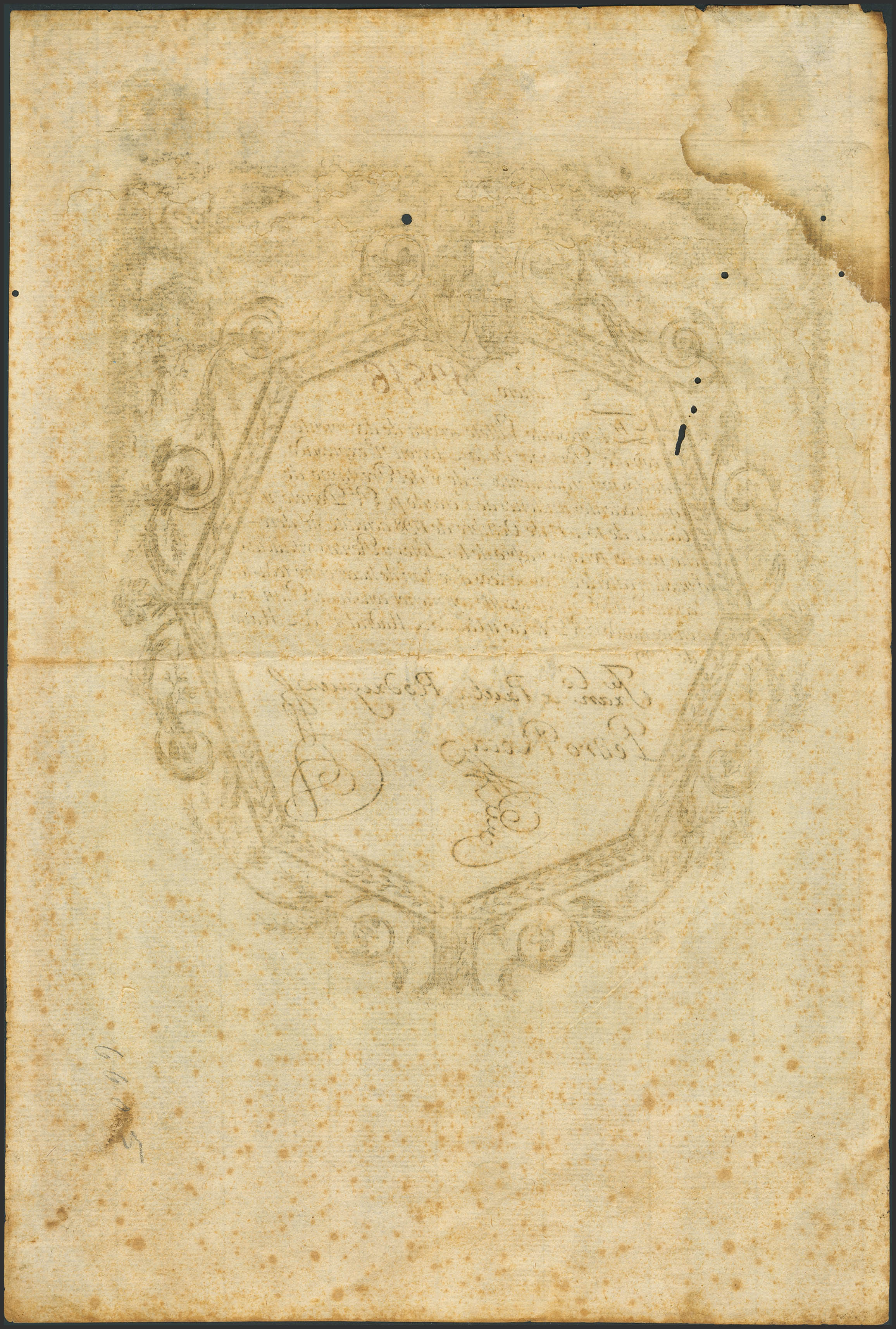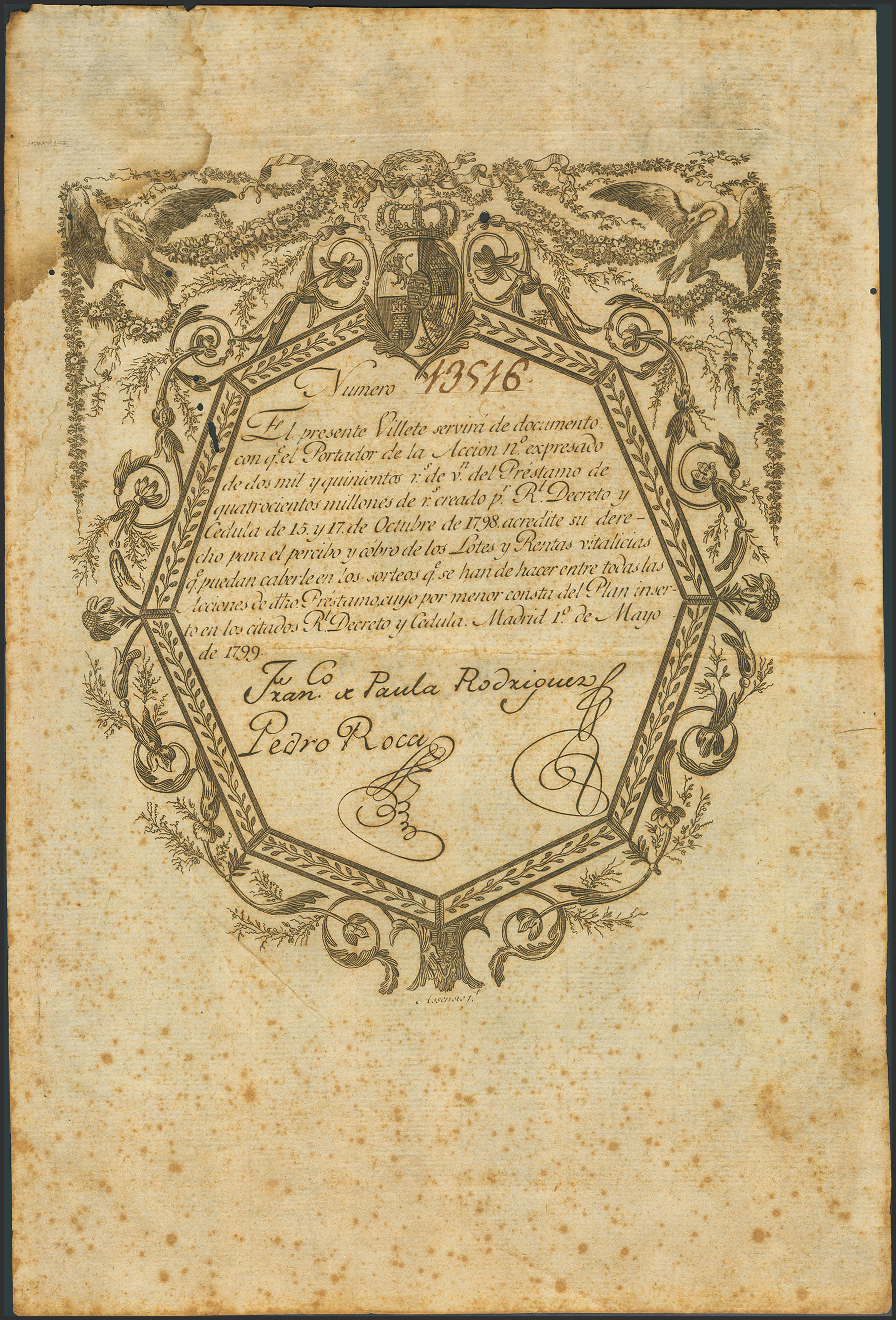 English 2500 Reales. May 1, 1799. Without series and with numbering. (Filabo: page 65). Very rare 18th century credit of four hundred million reales, with age spots and mothballs. Extremely Fine-.