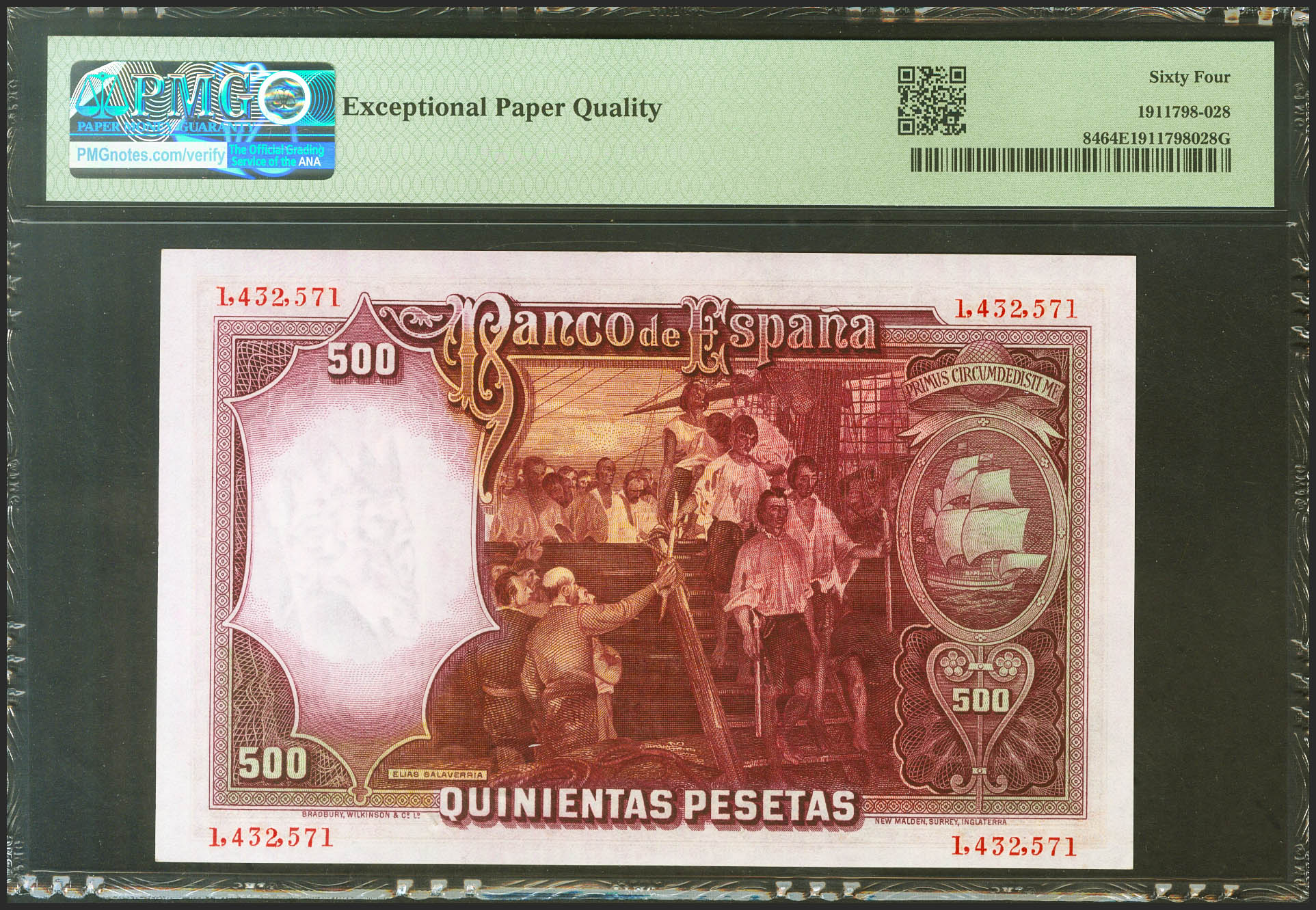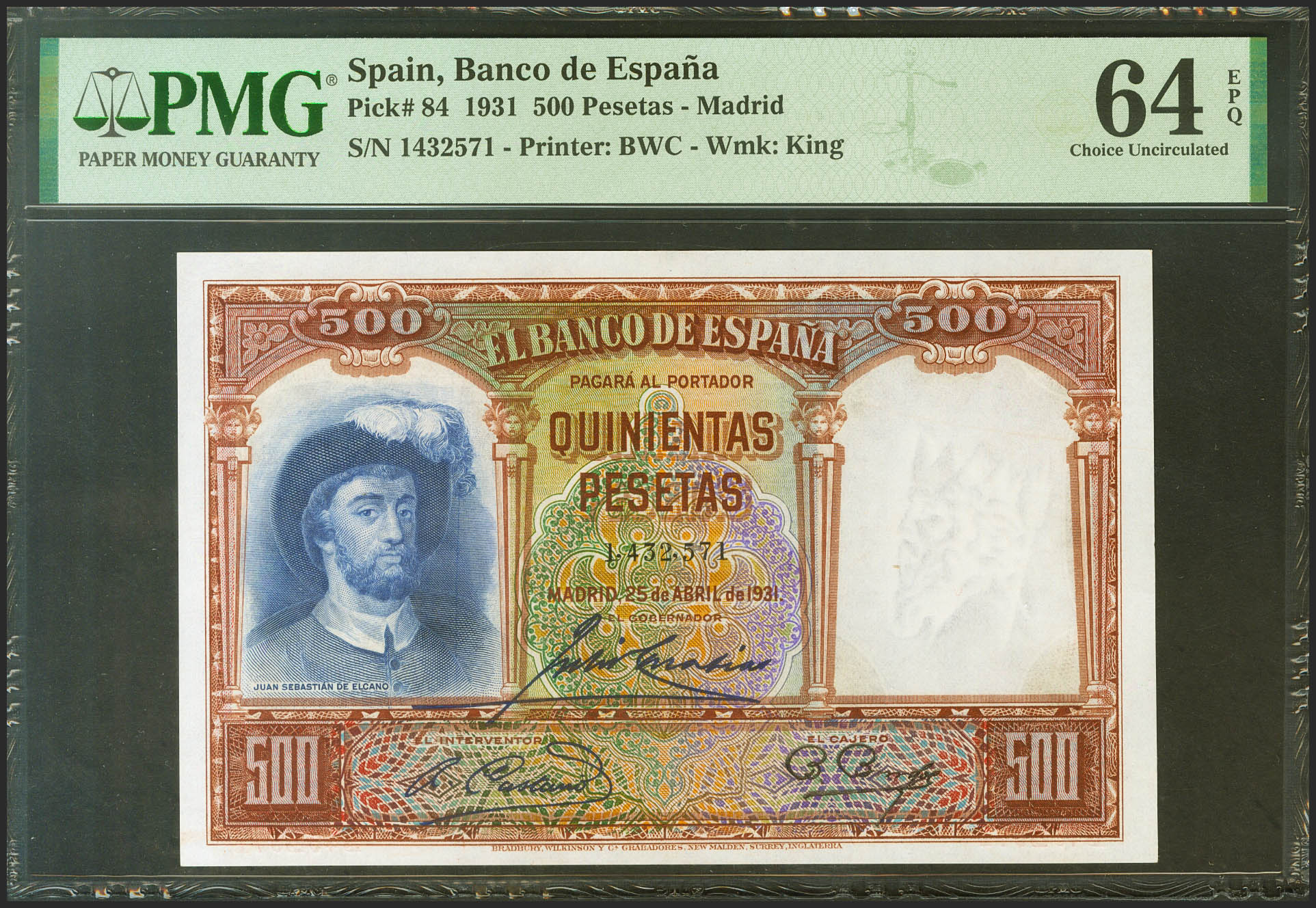 English 500 Pesetas. April 25, 1931. No series. (Edifil 2021: 361, Pick: 84). Original marking. Uncirculated. Encapsulated PMG64EPQ.